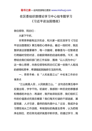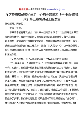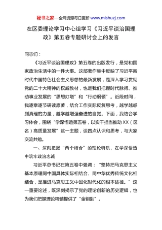 在区委组织部理论学习中心组专题学习《XXX谈治国理政》第五卷研讨会上的发言.docx