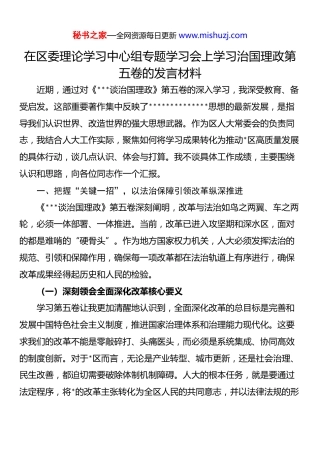 在区委理论学习中心组专题学习会上学习治国理政第五卷的发言材料.docx