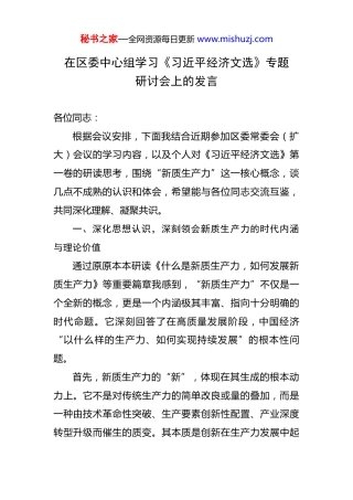 在区委中心组学习《XXX经济文选》专题研讨会上的发言.docx