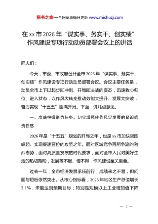 在XX市2026年“谋实事、务实干、创实绩”作风建设专项行动动员部署会议上的讲话.docx