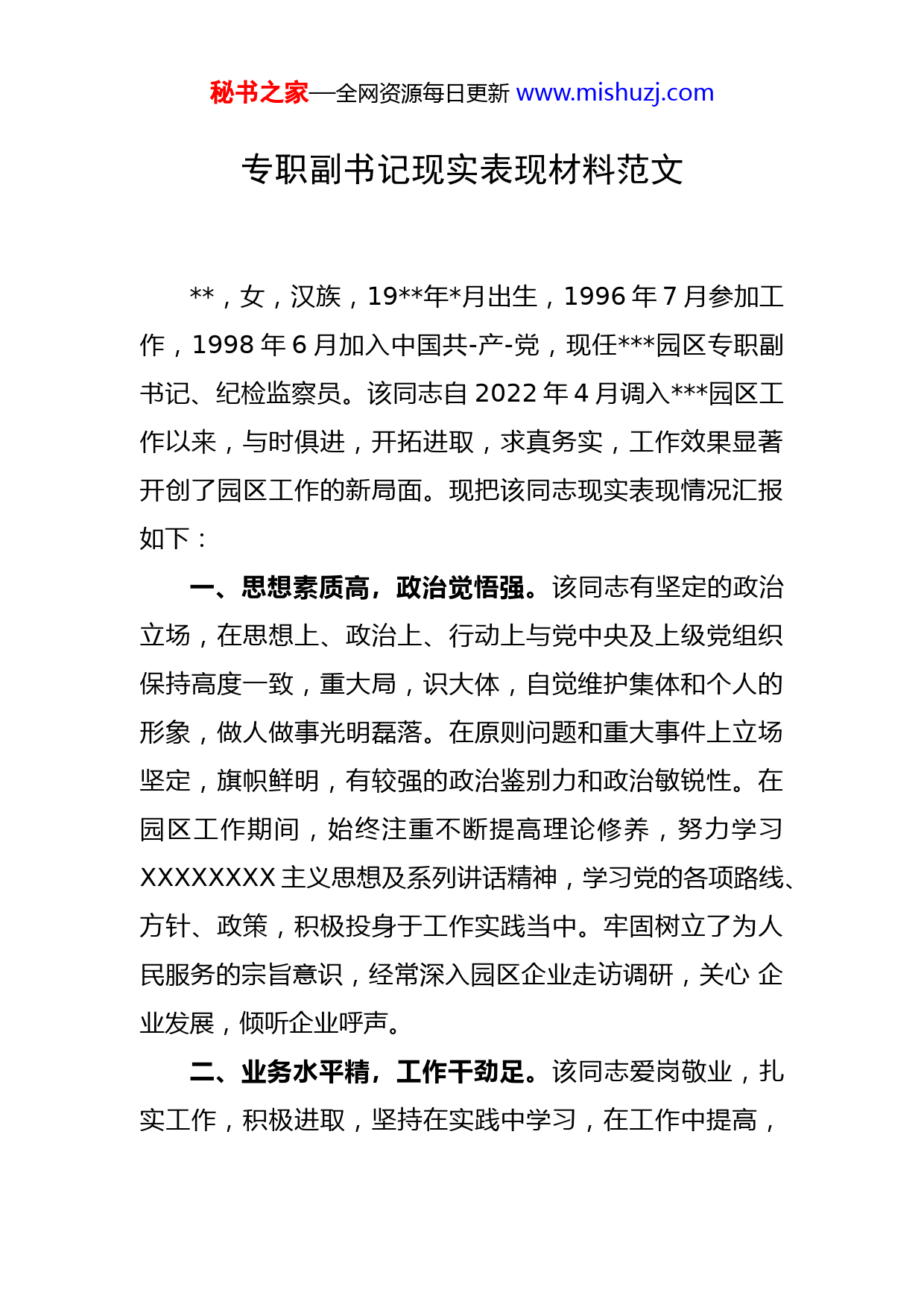 秘书之家—全网资源每日更新www.mishuzj.com专职副书记现实表现材料范文,女,汉族,19年月出生,1996年7月参加工作,1998年6月加入中国共-产-党,现任园区专职副书记、纪检监察员。该同志自2022年4月调入园区工作以来,与时俱进,开拓进取,求真务实,工作效果显著开创了园区工作的新局面。现把该同志现实表现情况汇报如下:一、思想素质高,政治觉悟强。该同志有坚定的政治立场,在思想上、政治上、行动上与党中央及上级党组织保持高度一致,重大局,识大体,自觉维护集体和个人的形象,做人做事光明磊落。在原则问题和重大事件上立场坚定,旗帜鲜明,有较强的政治鉴别力和政治敏锐性。在园区工作期间,始终注重不断提高理论修养,努力学习XXXXXXXX主义思想及系列讲话精神,学习党的各项路线、方针、政策,积极投身于工作实践当中。牢固树立了为人民服务的宗旨意识,经常深入园区企业走访调研,关心企业发展,倾听企业呼声。二、业务水平精,工作干劲足。该同志爱岗敬业,扎实工作,积极进取,坚持在实践中学习,在工作中提高,秘书之家—全网资源每日更新www.mishuzj.com把每项工作都当作对自己能力素质的检验和挑战,不断提高自己的工作能力和业务水平,围绕产业发展、项目建设党的建设等工作重点,全力以赴、攻坚克难,取得了突出的工作业绩。全力投入地区服饰经营户向产业园转移工作,推动27家服饰产业经营户完成转移。疫情防控期间,协助街道进行核酸检测,积极开展上门检测,同时,考虑企业闭环生产实际困难,为企业累计发放蓝色通行证、“白名单卡”,疫情防控后期积极推动园区企业复工复产疫情期间多方组织发动企业向区慈善会捐款捐物,累计捐款近300万元。作为园区党建工作的主要负责人,在基层党建方面同样做了大量工作,2022年新建两新支部2个、功能型两新党支部25个,企业覆盖率达95%,新发展党员11名,其中,党支部成功创建市级两新标杆党组织,党支部成功创建区级两新标杆党组织。三、思想观念新,工作方法多。该同志能够正确把握时代发展的要求,科学地判断形势,从全局性、前瞻性、战略性的高度思考问题、把握方向。工作有魄力,善于抓大事,抓主要矛盾,处理问题迅速果断,有较强的应对复杂局面和解决复杂矛盾的能力。办事情既能坚持原则,又能主动解决遇到的困难和问题,工作勤勤勉勉,又勇于创新,能够比较出色的完成分工负责的各项工作任务,展现出良好的工作能力和精神风貌,得到领导和同事的肯定和秘书之家—全网资源每日更新www.mishuzj.com好评。四、廉洁自律清,工作作风正。该同志在廉洁从政方面,能严格自律,时时刻刻按照党员的标准严格要求自己自觉遵守党的纪律,保持清醒的头脑,自觉抵制腐朽思想的侵蚀。坚持奉行“为了一切群众,为了群众的一切”的宗旨开展工作,从不以势欺人,从不向群众索拿卡要。坚持率先垂范的做人准则,凡是要求别人做的,自己首先做到,禁止别人做的事,自己坚决不做,自觉的接受党和群众的批评和监督。有较好的大局观念和团队精神,善于集中正确意见,善于团结同志,文化和旅游局廉政风险点防控自查报告今年以来,为进一步从源头上预防腐败的滋生,不断加大预防腐败的力度,充分发挥廉政风险防控对文旅事业融合发展的保障作用,推进全局廉政风险防控机制建设,提升全局党员干部廉政风险防控能力,我们在全系统范围内开展了岗位廉政风险点和风险岗位排查工作,为文旅事业融合发展和干部干事创建奠定了坚实的政治保障和纪律保障。现根据市委办《关于在全市开展加强廉政风险防控工作的实施方案》通知要求,并结合我局工作职能和业务特色,将自查报告汇报如下:一、工作开展情况1、全面排查。在岗位廉政风险点和风险岗位排查过程秘书之家—全网资源每日更新www.mishuzj.com中,为了把风险点找全、找准、找到位,我们要求各科室各单位根据三定方案规定的职能职责和工作实际,全面排查本部门本科室在岗位职责、工作流程、制度管理、政策执行落实等方面可能存在的风险,特别是对涉及管人、管事、管财、管物、管项目等廉政风险等级比较高的工作环节都要进行全面细致精准的梳理排查,通过自己查、同事提、领导点、相互找等方法,局办公室、财务科、文化科旅游科、市场监管科、政工科、党建办等个科室(单位),在思想建设、财务管理、选人用人、廉政教育等四大方面开展了廉政风险点梳理排查,进一步增强了广大党员干部对廉政风险防控工作的自觉性和主动性。2、精准分级。为确保各项工作顺利开展,我们对对排查出来的各类岗位廉政风险点和风险岗位,进行了逐一归类汇总,根据发生的机率或危害损失程度,将岗位廉政风险点和风险岗位划分为三级:高风险是发生机率高的风险一旦发生会造成严重损害的风险,有可能产生严重违法违纪行为;中级风险是发生机率较高的风险,一旦发生会造成较为严重损害的风险,有可能产生严重违规违章行为;低级风险是发生机率较小的风险,一旦发生会造成一定的不良影响或损失的风险。为明确防范措施要求,我们要求各科室、各部门在全面查找出风险点基础上,对本部门的廉政与监管风险点进行深入剖析,从风险发生几率、危害秘书之家—全网资源每日更新www.mishuzj.com程度、形成原因等方面进行了风险等级评估,明确了风险岗位、风险点及