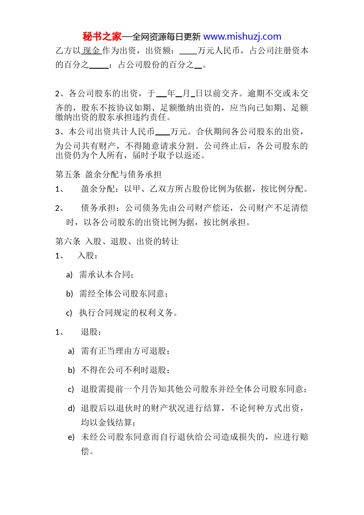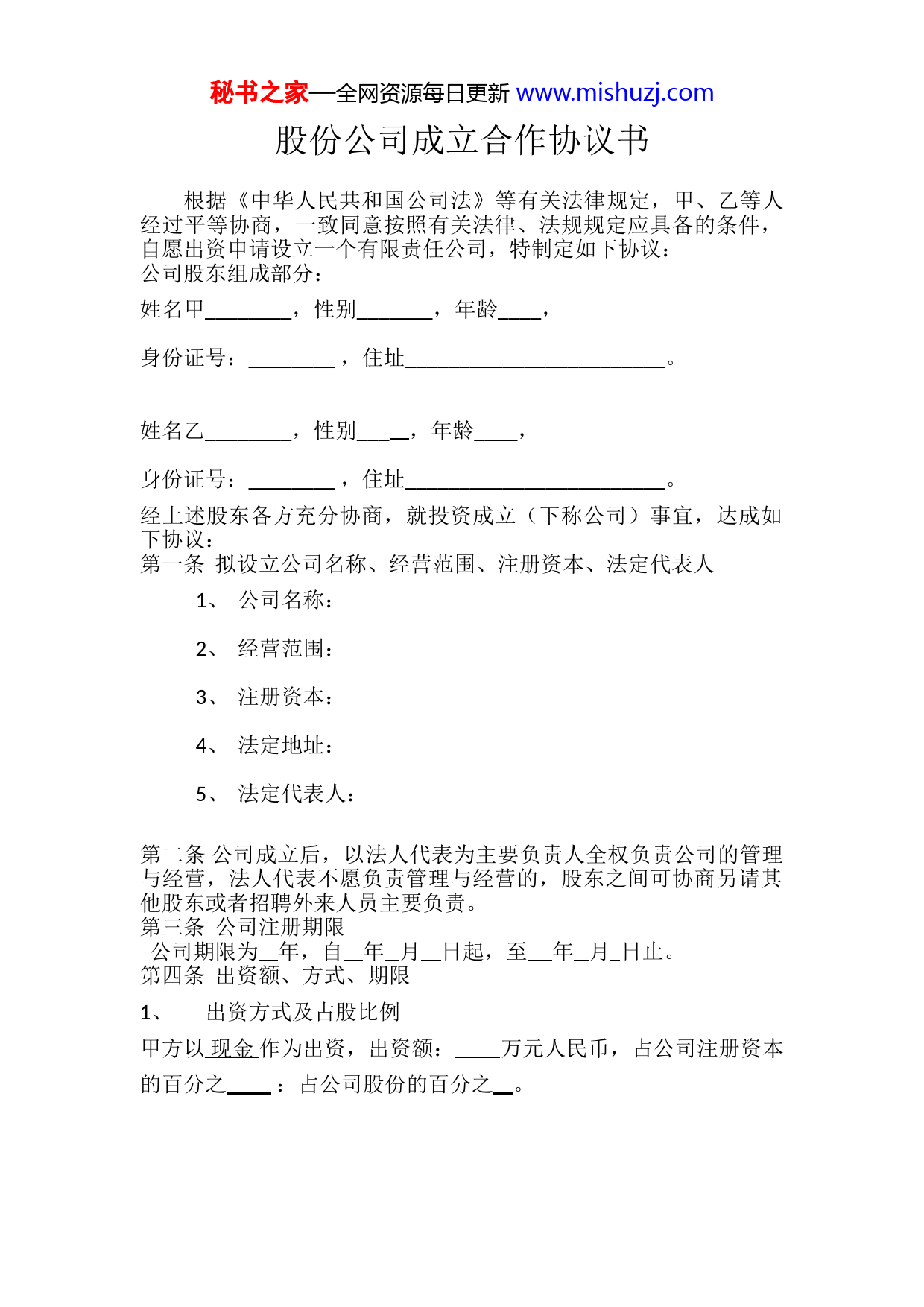 秘书之家—全网资源每日更新www.mishuzj.com股份公司成立合作协议书根据《中华人民共和国公司法》等有关法律规定,甲、乙等人经过平等协商,一致同意按照有关法律、法规规定应具备的条件,自愿出资申请设立一个有限责任公司,特制定如下协议:公司股东组成部分:姓名甲________,性别_______,年龄____,身份证号:________,住址________________________。姓名乙________,性别___,年龄____,身份证号:________,住址________________________。经上述股东各方充分协商,就投资成立(下称公司)事宜,达成如下协议:第一条拟设立公司名称、经营范围、注册资本、法定代表人1、公司名称:2、经营范围:3、注册资本:4、法定地址:5、法定代表人:第二条公司成立后,以法人代表为主要负责人全权负责公司的管理与经营,法人代表不愿负责管理与经营的,股东之间可协商另请其他股东或者招聘外来人员主要负责。第三条公司注册期限公司期限为年,自年月日起,至年月日止。第四条出资额、方式、期限1、出资方式及占股比例甲方以现金作为出资,出资额:万元人民币,占公司注册资本的百分之:占公司股份的百分之。秘书之家—全网资源每日更新www.mishuzj.com乙方以现金作为出资,出资额:万元人民币,占公司注册资本的百分之:占公司股份的百分之。2、各公司股东的出资,于年月日以前交齐。逾期不交或未交齐的,股东不按协议如期、足额缴纳出资的,应当向已如期、足额缴纳出资的股东承担违约责任。3、本公司出资共计人民币万元。合伙期间各公司股东的出资,为公司共有财产,不得随意请求分割。公司终止后,各公司股东的出资仍为个人所有,届时予取予以返还。第五条盈余分配与债务承担1、盈余分配:以甲、乙双方所占股份比例为依据,按比例分配。2、债务承担:公司债务先由公司财产偿还,公司财产不足清偿时,以各公司股东的出资比例为据,按比例承担。第六条入股、退股、出资的转让1、入股:a)需承认本合同;b)需经全体公司股东同意;c)执行合同规定的权利义务。1、退股:a)需有正当理由方可退股;b)不得在公司不利时退股;c)退股需提前一个月告知其他公司股东并经全体公司股东同意;d)退股后以退伙时的财产状况进行结算,不论何种方式出资,均以金钱结算;e)未经公司股东同意而自行退伙给公司造成损失的,应进行赔偿。秘书之家—全网资源每日更新www.mishuzj.com2、出资的转让:允许公司股东转让自己的出资。转让时公司股东有优先转让权,转让价格按公司所有资产比例核算。如转让公司股东以外的第三人,甲、乙、丙任何三方中任何两方应该以公司前途大局为重,不得有意为难第三人,否则视为自动放弃公司资产所有权,同时应承担此前公司按股份比例所需偿还的债务。第七条公司负责人及其他公司股东的权利股东以出资额为限对公司承担责任,公司以其全部资产对公司的债务承担责任。1、方为公司法人及负责人。其权限是:a)对外开展业务,订立合同;b)对公司事业进行日常管理;c)出售公司的产品(货物)、购进常用货物;d)支付按其所占公司股份所承担的债务;e)公司人员在需要情况下招聘人员及培训;f)审批日常开支及管理公司所有资产,但必需钱帐分离,不能2、管理帐务。其他公司股东的权利:a)参与公司事业的管理,及对公司前景提供可行性方案与报告。b)听取公司负责人开展业务情况的报告;c)检查公司账册及经营情况;d)共同决定公司重大事项。e)支付按其所占公司股份所承担的债务;第八条禁止行业1、未经全体公司股东同意,禁止任何公司股东私自以公司名义进行非公司业务活动;如其业务获得利益归公司,造成损失早其按实际损失赔偿。2、禁止公司股东经营与公司竞争主流的业务,如需经营,须经甲、乙、丙三方同意方可。秘书之家—全网资源每日更新www.mishuzj.com3、如公司股东违反上述各条,应按公司实际损失赔偿。第九条公司的终止及终止后的事项1、公司因以下事由之一得终止:a)公司期届满;b)全体公司股东同意终止公司关系;c)公司事业完成或不能完成;d)公司事业违反法律被撤销;e)法院根据有关当事人请求判决解散。2、公司终止后的事项:a)即行推举清算人,并邀请中间人(或公证员)参与清算;b)清算后如有盈余,则按收取债权、清偿债务、返还出资、按比例分配剩余财产的顺序进行。固定资产和不可分物,可作价卖给公司股东或第三人,其价款参与分配;c)清算后如有亏损,不论公司股东出资多少,先以公司共同财产偿还,公司财产不足清偿的部分,由公司股东按出资比例承担。第十条争议的解决方式公司股东之间如发生争议,应共同协商,本着有利于公司事业发展的原则预以解决。协商不成的,提交公司注册所在地仲裁委员会仲裁,依法向人民法院起诉。第十一条本合同自订立并报经工商行政管理机关批准之日起生效并开始营业。第十二条本合同如有未尽事宜,应由公司股东集体讨论补充或修改。补充和修改的内容与本合同具有同等效力。第十三条一切合理开支,由收据和发票进行结算。第十四条本合同正本一式三份,公司股东各执一份,其中一份为中间人所留。公司股东签名:盖章公司股东签名:盖章秘书之家—全网资源每日更新www.mishuzj.com年月日秘书之家—全网资源每日更新www.mishuzj.com合作协议书