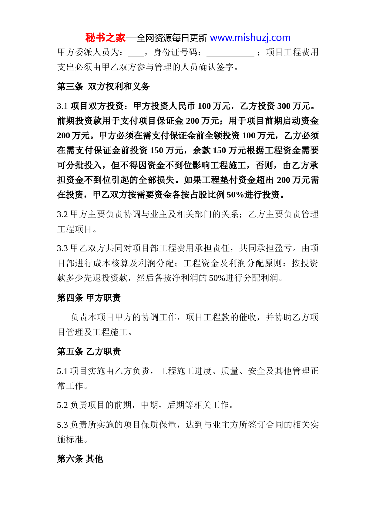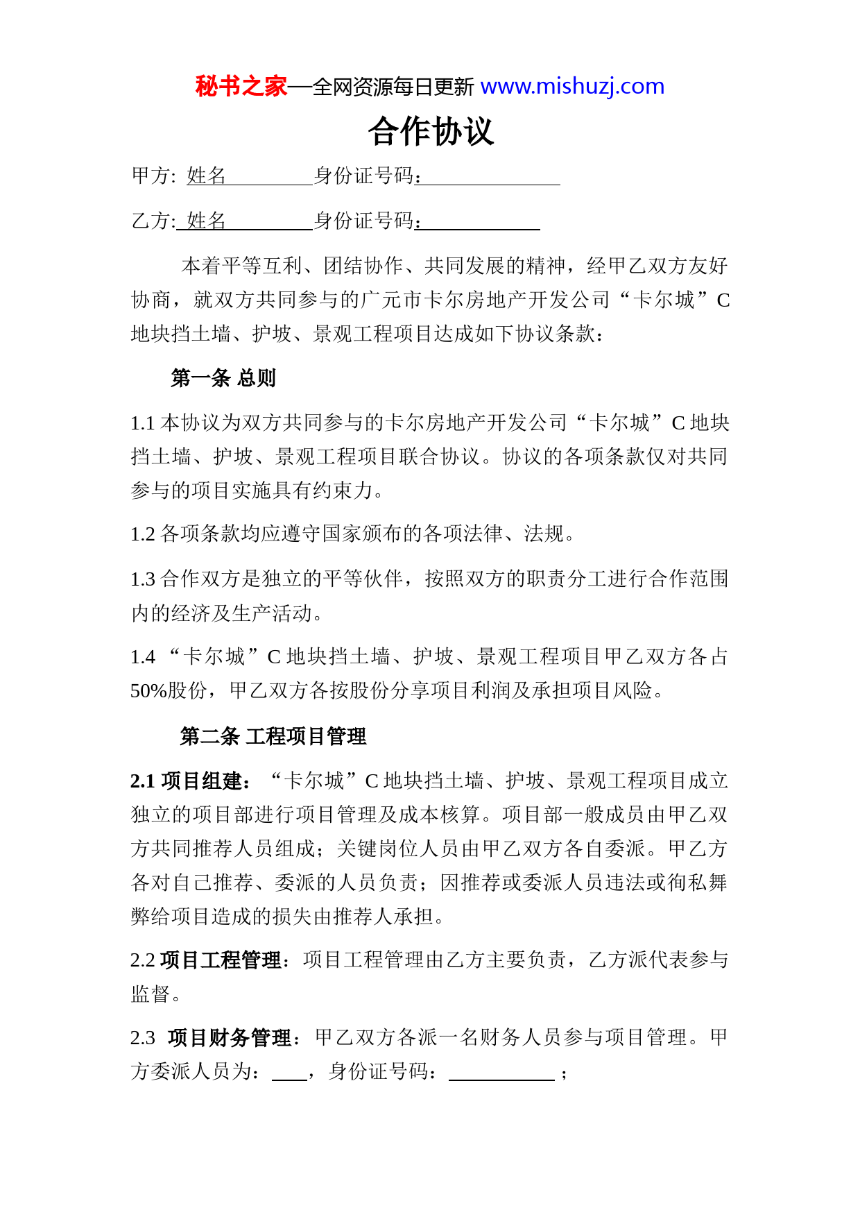 秘书之家—全网资源每日更新www.mishuzj.com合作协议甲方:姓名身份证号码:乙方:姓名身份证号码:本着平等互利、团结协作、共同发展的精神,经甲乙双方友好协商,就双方共同参与的广元市卡尔房地产开发公司“卡尔城”C地块挡土墙、护坡、景观工程项目达成如下协议条款:第一条总则1.1本协议为双方共同参与的卡尔房地产开发公司“卡尔城”C地块挡土墙、护坡、景观工程项目联合协议。协议的各项条款仅对共同参与的项目实施具有约束力。1.2各项条款均应遵守国家颁布的各项法律、法规。1.3合作双方是独立的平等伙伴,按照双方的职责分工进行合作范围内的经济及生产活动。1.4“卡尔城”C地块挡土墙、护坡、景观工程项目甲乙双方各占50%股份,甲乙双方各按股份分享项目利润及承担项目风险。第二条工程项目管理2.1项目组建:“卡尔城”C地块挡土墙、护坡、景观工程项目成立独立的项目部进行项目管理及成本核算。项目部一般成员由甲乙双方共同推荐人员组成;关键岗位人员由甲乙双方各自委派。甲乙方各对自己推荐、委派的人员负责;因推荐或委派人员违法或徇私舞弊给项目造成的损失由推荐人承担。2.2项目工程管理:项目工程管理由乙方主要负责,乙方派代表参与监督。2.3项目财务管理:甲乙双方各派一名财务人员参与项目管理。甲方委派人员为:,身份证号码:;秘书之家—全网资源每日更新www.mishuzj.com甲方委派人员为:,身份证号码:;项目工程费用支出必须由甲乙双方参与管理的人员确认签字。第三条双方权利和义务3.1项目双方投资:甲方投资人民币100万元,乙方投资300万元。前期投资款用于支付项目保证金200万元;用于项目前期启动资金200万元。甲方必须在需支付保证金前全额投资100万元,乙方必须在需支付保证金前投资150万元,余款150万元根据工程资金需要可分批投入,但不得因资金不到位影响工程施工,否则,由乙方承担资金不到位引起的全部损失。如果工程垫付资金超出200万元需在投资,甲乙双方按需要资金各按占股比例50%进行投资。3.2甲方主要负责协调与业主及相关部门的关系;乙方主要负责管理工程项目。3.3甲乙双方共同对项目部工程费用承担责任,共同承担盈亏。由项目部进行成本核算及利润分配;工程资金及利润分配原则:按投资款多少先退投资款,然后各按净利润的50%进行分配利润。第四条甲方职责负责本项目甲方的协调工作,项目工程款的催收,并协助乙方项目管理及工程施工。第五条乙方职责5.1项目实施由乙方负责,工程施工进度、质量、安全及其他管理正常工作。5.2负责项目的前期,中期,后期等相关工作。5.3负责所实施的项目保质保量,达到与业主方所签订合同的相关实施标准。第六条其他秘书之家—全网资源每日更新www.mishuzj.com5.1本协议未尽事宜由甲乙双方协商解决。5.2本协议一式二份,甲乙双方各执一份,签字盖章后生效。甲方:乙方:年月日年月日