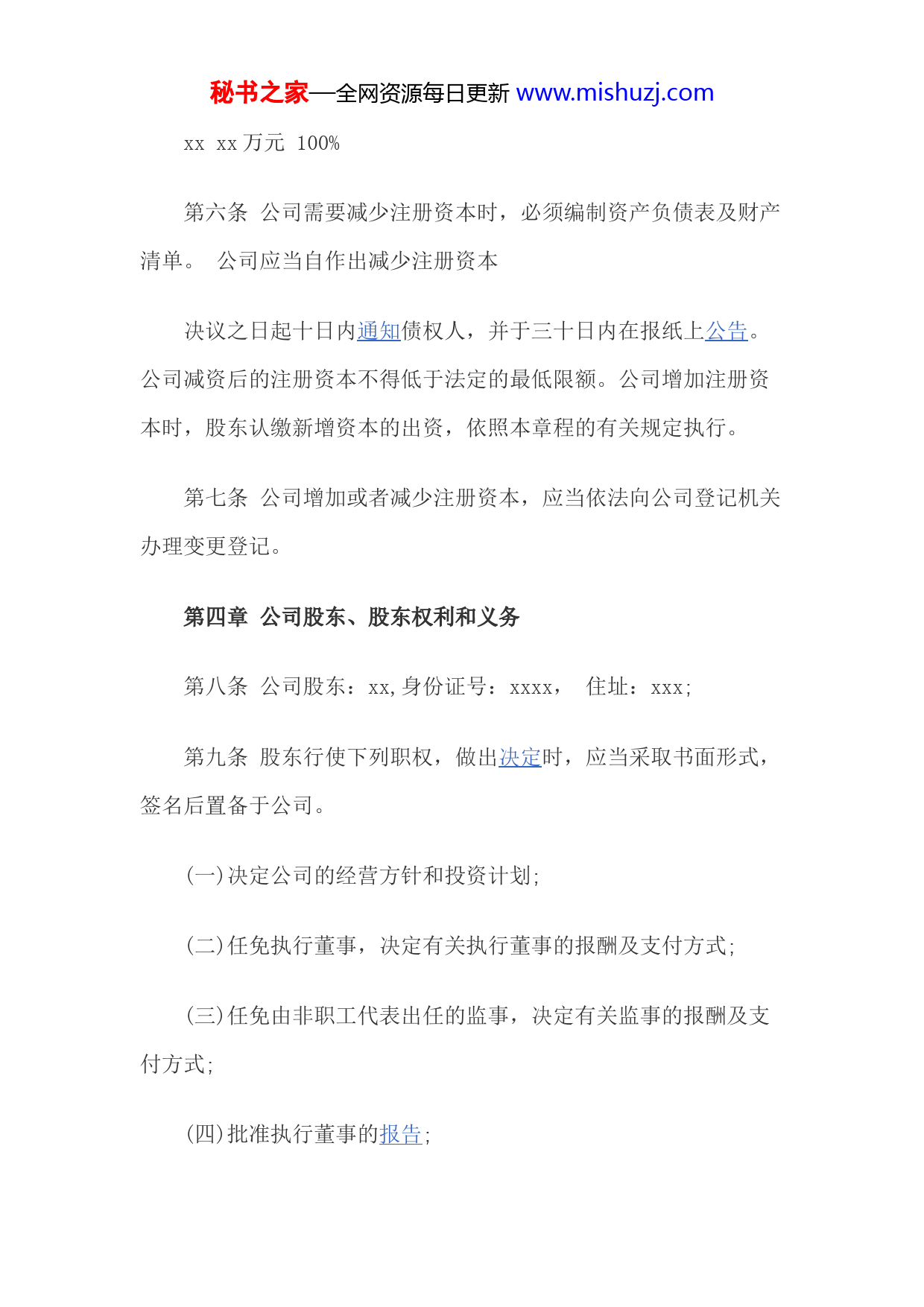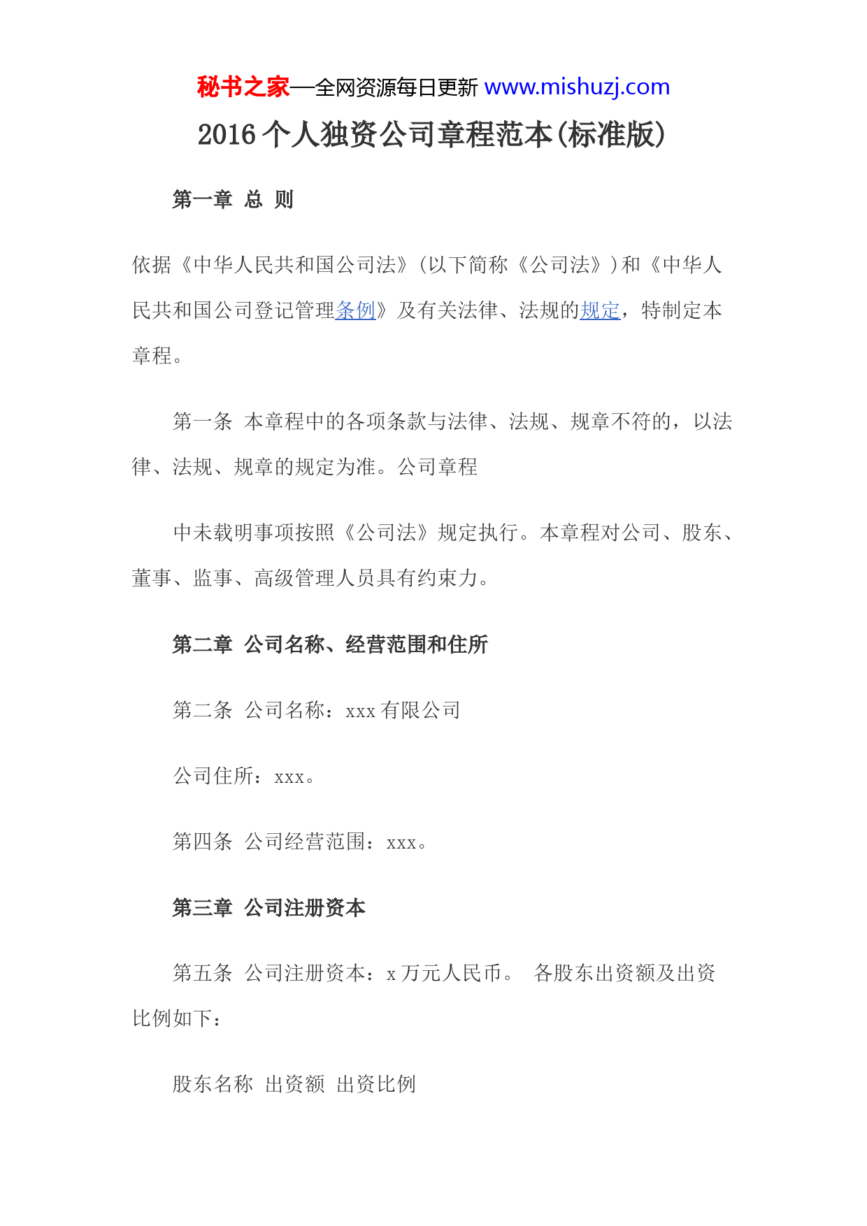秘书之家—全网资源每日更新www.mishuzj.com2016个人独资公司章程范本(标准版)第一章总则依据《中华人民共和国公司法》(以下简称《公司法》)和《中华人民共和国公司登记管理条例》及有关法律、法规的规定,特制定本章程。第一条本章程中的各项条款与法律、法规、规章不符的,以法律、法规、规章的规定为准。公司章程中未载明事项按照《公司法》规定执行。本章程对公司、股东、董事、监事、高级管理人员具有约束力。第二章公司名称、经营范围和住所第二条公司名称:xxx有限公司公司住所:xxx。第四条公司经营范围:xxx。第三章公司注册资本第五条公司注册资本:x万元人民币。各股东出资额及出资比例如下:股东名称出资额出资比例秘书之家—全网资源每日更新www.mishuzj.comxxxx万元100%第六条公司需要减少注册资本时,必须编制资产负债表及财产清单。公司应当自作出减少注册资本决议之日起十日内通知债权人,并于三十日内在报纸上公告。公司减资后的注册资本不得低于法定的最低限额。公司增加注册资本时,股东认缴新增资本的出资,依照本章程的有关规定执行。第七条公司增加或者减少注册资本,应当依法向公司登记机关办理变更登记。第四章公司股东、股东权利和义务第八条公司股东:xx,身份证号:xxxx,住址:xxx;第九条股东行使下列职权,做出决定时,应当采取书面形式,签名后置备于公司。(一)决定公司的经营方针和投资计划;(二)任免执行董事,决定有关执行董事的报酬及支付方式;(三)任免由非职工代表出任的监事,决定有关监事的报酬及支付方式;(四)批准执行董事的报告;秘书之家—全网资源每日更新www.mishuzj.com(五)批准监事的报告;(六)决定公司的年度财务预算方案,决算方式;(七)决定公司的利润分配方案和弥补亏损方案;(八)决定公司增加或者减少注册资本;(九)决定公司合并、分立、变更公司形式、解散和清算等事项;(十)修改公司章程。第五章执行董事产生办法、职权和议事规则第九条公司设执行董事壹名,执行董事是公司的法定代表人,由股东委派,行使如下权利:(一)决定公司的经营方针和投资计划;(二)决定公司高级管理人员报酬、事项,员工的工资;(三)决定公司的年度财务预算方案、决算方案;;(四)决定公司的利润分配方案和弥补亏损的方案;(五)对公司增加或者减少注册资本作出决定;(六)对聘用、解聘会计师事务所作出决定;秘书之家—全网资源每日更新www.mishuzj.com(七)对公司合并、分立、解散、清算或者变更公司形式作出决定;(八)修改公司章程;(九)优先认缴公司新增资本;第六章经营管理机构第十条公司设立经营管理机构,经营管理机构设经理一人,并根据公司经营情况设置管理部门。公司经营管理机构经理由执行董事任免,任期三年,经理对执行董事负责,行使下列职权:(一)主持公司的生产经营管理工作,组织实施董事长决定;(二)组织实施公司年度经营计划和投资方案;(三)拟订公司内部管理机构设置方案;(四)拟订公司的基本管理制度;(五)制定公司的具体规章;(六)提请聘任或者解聘公司副经理、财务负责人;(七)决定任免除应由股东决定任免以外的管理人员;秘书之家—全网资源每日更新www.mishuzj.com(八)公司章程和股东授予的其他职权。第七章监事产生办法、职权和议事规则第十一条公司不设监事会,设监事壹名,监事由股东委任,任期为三年,监事任期届满前,股东不得无故解除其职务,执行董事、经理及财务人员不得兼任监事。第十二条监事行使下列职权:(一)检查公司财务;(二)对执行董事、经理等高级管理人员执行公司职务的行为进行监督,对违反法律、行政法规、公司章程或者股东决议的执行董事、经理等高级管理人员提出罢免的建议;(三)当执行董事、经理等高级管理人员的行为损害公司的利益时,要求执行董事、经理等高级管理人员予以纠正;(四)向股东提出有关改善公司监督管理水平的提案;第十三条监事发现公司经营情况异常,可以进行调查;必要时,可以聘请会计师事务所等协助其工作,费用由公司承担。第十四条监事行使职权所必需的费用,由公司承担。第八章公司董事、监事、高级管理人员的资格和义务秘书之家—全网资源每日更新www.mishuzj.com第十五条有下列情形之一的,不得担任公司的执行董事、监事、高级管理人员:(一)无民事行为能力或者限制民事行为能力;(二)因贪污、贿赂、侵占财产、挪用财产或者破坏社会主义市场经济秩序,被判处刑罚,执行期满未逾五年,或者因犯罪被剥夺政治权利,执行期满未逾五年;(三)担任破产清算的公司、企业的董事或者厂长、经理,对该公司、企业的破产负有个人责任的,自该公司、企业破产清算完结之日起未逾三年;(四)担任因违法被吊销营业执照、责令关闭的公司、企业的法定代表人,并负有个人责任的,自该公司、企业被吊销营业执照之日起未逾三年;(五)个人所负数额较大的债务到期未清偿。第十六条执行董事、监事、高级管理人员应当遵守法律、行政法规和公司章程,对公司负有忠实义务和勤勉义务。执行董事、监事、高级管理人员不得利用职权收受贿赂或者其他非法收入,不得侵占公司的财产。第十七条执行董事、高级管理人员不得有下列行为:秘书之家—全网资源每日更新www.mishuzj.com(一)挪用公司资金;(二)将公司资金以其个人名义或者以其他个人名义开立