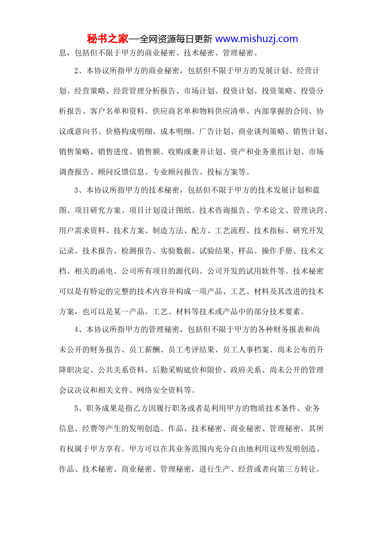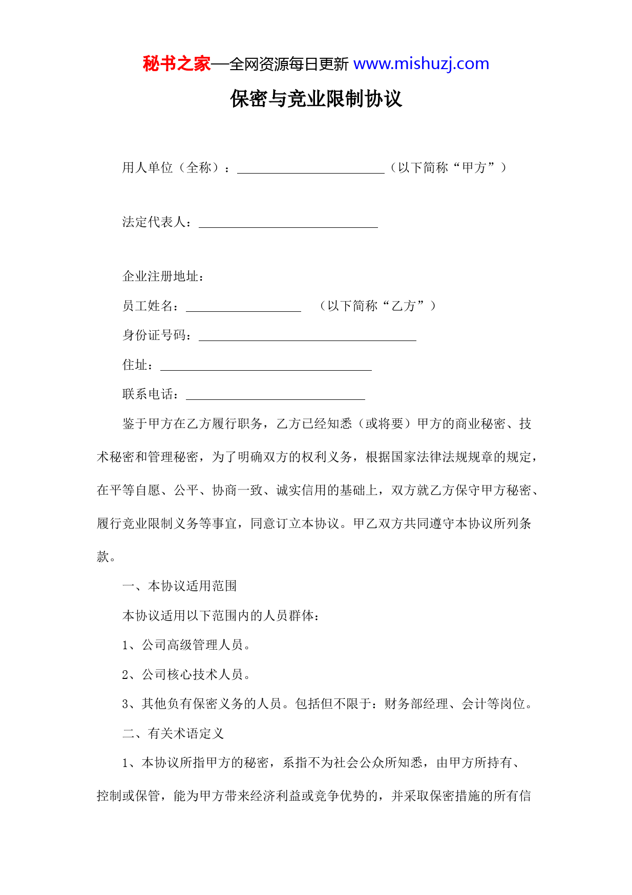 秘书之家—全网资源每日更新www.mishuzj.com保密与竞业限制协议用人单位(全称):(以下简称“甲方”)法定代表人:企业注册地址:员工姓名:(以下简称“乙方”)身份证号码:住址:联系电话:鉴于甲方在乙方履行职务,乙方已经知悉(或将要)甲方的商业秘密、技术秘密和管理秘密,为了明确双方的权利义务,根据国家法律法规规章的规定,在平等自愿、公平、协商一致、诚实信用的基础上,双方就乙方保守甲方秘密、履行竞业限制义务等事宜,同意订立本协议。甲乙双方共同遵守本协议所列条款。一、本协议适用范围本协议适用以下范围内的人员群体:1、公司高级管理人员。2、公司核心技术人员。3、其他负有保密义务的人员。包括但不限于:财务部经理、会计等岗位。二、有关术语定义1、本协议所指甲方的秘密,系指不为社会公众所知悉,由甲方所持有、控制或保管,能为甲方带来经济利益或竞争优势的,并采取保密措施的所有信秘书之家—全网资源每日更新www.mishuzj.com息,包括但不限于甲方的商业秘密、技术秘密、管理秘密。2、本协议所指甲方的商业秘密,包括但不限于甲方的发展计划、经营计划、经营策略、经营管理分析报告、市场计划、投资计划、投资策略、投资分析报告、客户名单和资料、供应商名单和物料供应清单、内部掌握的合同、协议或意向书、价格构成明细、成本明细、广告计划、商业谈判策略、销售计划、销售策略、销售进度、销售额、收购或兼并计划、资产和业务重组计划、市场调查报告、顾问反馈信息、专业顾问报告、投标方案等。3、本协议所指甲方的技术秘密,包括但不限于甲方的技术发展计划和蓝图、项目研究方案、项目计划设计图纸、技术咨询报告、学术论文、管理诀窍、用户需求资料、技术方案、制造方法、配方、工艺流程、技术指标、研究开发记录、技术报告、检测报告、实验数据、试验结果、样品、操作手册、技术文档、相关的函电、公司所有项目的源代码、公司开发的试用软件等。技术秘密可以是有特定的完整的技术内容并构成一项产品、工艺、材料及其改进的技术方案,也可以是某一产品、工艺、材料等技术或产品中的部分技术要素。4、本协议所指甲方的管理秘密,包括但不限于甲方的各种财务报表和尚未公开的财务报告、员工薪酬、员工考评结果、员工人事档案、尚未公布的升降职决定、公共关系资料、后勤采购底价和限价、政府关系、尚未公开的管理会议决议和相关文件、网络安全资料等。5、职务成果是指乙方因履行职务或者是利用甲方的物质技术条件、业务信息、经费等产生的发明创造、作品、技术秘密、商业秘密、管理秘密,其所有权属于甲方享有。甲方可以在其业务范围内充分自由地利用这些发明创造、作品、技术秘密、商业秘密、管理秘密,进行生产、经营或者向第三方转让。秘书之家—全网资源每日更新www.mishuzj.com乙方应当依据甲方的要求,提供一切必要的信息和采取一切必要的行动,包括申请、注册、登记等,协助甲方取得和行使有关的所有权利。三、员工的保密管理与竞业限制规定1、乙方保证,无论是因为其职务成果或者受管理者特别指派或者无意中接触到的甲方秘密,除非得到甲方的明确授权或系履行其职务需要之外,不得向任何未经授权的第三方公开。本条所指的公开内容包括但不限于以口头、文字、图形、图像或者电子文档等方式使未经合法授权的第三者知悉的相关秘密。2、乙方保证,当其在甲方工作期间,遵守甲方保密管理的相关规定,必须妥善保管其所掌握的甲方秘密,未经甲方明确授权,乙方在任何时候均不得将其保管的甲方秘密置于未采取安全措施的场所或带出甲方的办公区域,除非系乙方为了履行其职责所需并经甲方批准。3、乙方保证,当其因履行职务需要而使用完甲方载有秘密的资料之后,应依规定及时、完整的将上述资料返还相关的保管人或由乙方自行妥善保管。当乙方因故终止与甲方的劳动关系之后,乙方在离职前必须将其所保管的载有甲方秘密的资料全部、完整的返还给甲方,并不得保留任何形式的复印、复制件或销毁秘密件。4、乙方保证,其在甲方任职期间,非经甲方董事会书面同意,不得在与甲方生产、经营同类产品或提供同类服务的其他企业、事业单位、社会团体内担任任何职务,包括股东、合伙人、董事、监事、经理、职员、代理人、顾问等等。5、乙方在甲方任职期间所完成的、与甲方业务相关的发明创造、作品、技术秘密或其他商业秘密信息,乙方主张由其本人享有知识产权的,应当及时向甲方申明。经甲方核实,认为确属非职务成果并可由乙方享有知识产权的,秘书之家—全网资源每日更新www.mishuzj.com甲方不得在未经乙方明确授权的前提下利用这些成果进行生产、经营,亦不得自行向第三方转让;认为确属职务成果并由甲方享有知识产权的,乙方不得在未经甲方同意的前提下利用这些成果进行生产、经营,亦不得自行向第三方转让。乙方没有申明的,推定其属于职务成果,甲方可以使用这些成果进行生产、经营或者向第三方转让。即使日后证明属非职务成果的,乙方亦不得要求甲方承担任何经济责任。乙方申明后,甲方对成果的权属有异议的,可以通过协商解决;协商不成的,通过诉讼途径解决。6、乙方在履行职务时,按照甲方的