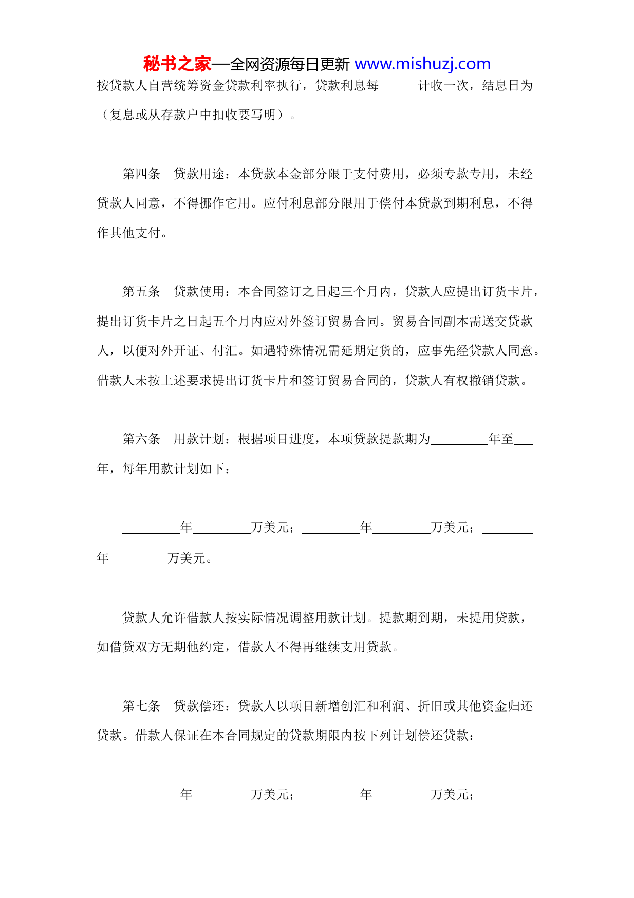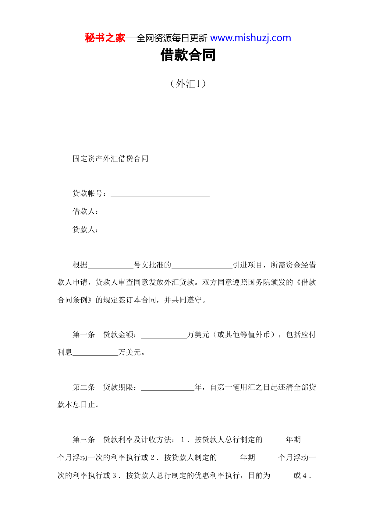 秘书之家—全网资源每日更新www.mishuzj.com借款合同(外汇1)固定资产外汇借贷合同贷款帐号:借款人:贷款人:根据号文批准的引进项目,所需资金经借款人申请,贷款人审查同意发放外汇贷款。双方同意遵照国务院颁发的《借款合同条例》的规定签订本合同,并共同遵守。第一条贷款金额:万美元(或其他等值外币),包括应付利息万美元。第二条贷款期限:年,自第一笔用汇之日起还清全部贷款本息日止。第三条贷款利率及计收方法:1.按贷款人总行制定的年期个月浮动一次的利率执行或2.按贷款人制定的年期个月浮动一次的利率执行或3.按贷款人总行制定的优惠利率执行,目前为或4.秘书之家—全网资源每日更新www.mishuzj.com按贷款人自营统筹资金贷款利率执行,贷款利息每计收一次,结息日为(复息或从存款户中扣收要写明)。第四条贷款用途:本贷款本金部分限于支付费用,必须专款专用,未经贷款人同意,不得挪作它用。应付利息部分限用于偿付本贷款到期利息,不得作其他支付。第五条贷款使用:本合同签订之日起三个月内,贷款人应提出订货卡片,提出订货卡片之日起五个月内应对外签订贸易合同。贸易合同副本需送交贷款人,以便对外开证、付汇。如遇特殊情况需延期定货的,应事先经贷款人同意。借款人未按上述要求提出订货卡片和签订贸易合同的,贷款人有权撤销贷款。第六条用款计划:根据项目进度,本项贷款提款期为年至年,每年用款计划如下:年万美元;年万美元;年万美元。贷款人允许借款人按实际情况调整用款计划。提款期到期,未提用贷款,如借贷双方无期他约定,借款人不得再继续支用贷款。第七条贷款偿还:贷款人以项目新增创汇和利润、折旧或其他资金归还贷款。借款人保证在本合同规定的贷款期限内按下列计划偿还贷款:年万美元;年万美元;秘书之家—全网资源每日更新www.mishuzj.com年万美元。如贷款项目提前实现效益,借款人应提前偿还贷款;如年度还款计划不能实现,借款人应在年底前提出调整还款计划,并经贷款人同意,否则贷款人将按贷款违约处理;如借款人不能按期还款,最迟在贷款到期日前十五天应向贷款人提出书面展期申请,届时贷款人可按有关规定作出处理意见。逾期或贷款人不同意展期的贷款,自过期之日起加收20%的罚息。为了有利于还款,借款人应在贷款人处开立还款准备金帐户,将用于还款的人民币资金先予存入,待外汇额度落实后再结汇偿还贷款。本贷款项下有关进出口结算业务,应通过中国银行进出口业务部叙做。第八条还款担保:本合同项下的贷款本息由作为借款人的担保人,并由担保人向贷款人出具担保函,作为本合同不可分割的组成部份,一旦借款人不能按期偿还贷款本息,经贷款人发出书面通知,由担保单位承担还本付息责任。保人出具担保函,作为本合同不可分割的组成部份,一旦借款人不能按期偿还贷款本息,经贷款人发出书面通知,由担保单位承担还本付息责任。第九条保险事项:为避免贷款期间可能因发生自然灾害或意外事故而遭受损失,借款人应向有关保险机构投保借款项下进口设备外汇财产保险,并将保险权益转归贷款人名下,直至还清全部贷款本息时止,保险费用可在本贷款项下支付。秘书之家—全网资源每日更新www.mishuzj.com第十条违约和违约处理(一)下列情况均属借款人违约:1.借款人未能按合同计划用款和还本付息。2.未经贷款人同意改变贷款的用途或挪作他用。3.未经贷款人同意借款人私自转卖用本贷款购置的设备。4.借款人违反本合同其他条款事项。(二)根据违约情况,贷款人有权采取下列措施:1.注销借款人未使用的贷款。2.对违约部分贷款加收最高为50%的罚息。3.冻结借款人在贷款人处的存款,并追回贷款。4.向贷款担保人追索贷款。5.借款人和担保人未能履行合同还款责任时,贷款人有权从借款人和担保人在各金融单位存款帐户中主动收还贷款项。6.采取其他必要手段,直至依法索偿应付未付贷款本息及费用。第十一条合同的变更和解除:订立合同所依据的国家计划及有关的概算预算经计划下达机关批准修改或取消的,允许变更或解除合同。第十二条合同生效:本合同经双方签字盖章后生效。本合同共四份,双方各执两份。本合同若有其他未及事宜,双方进一步商定补充条款。秘书之家—全网资源每日更新www.mishuzj.com第十三条争议的解决:本合同在履行中如发生争议,双方应协商解决;协商不成时,双方当事人可选择:1.向经济合同仲裁机构申请仲裁;2.向人民法院提起诉讼。借款人(盖章)贷款人(盖章)企业负责人银行负责人财务负责人经办人员签约日期:签约地点: