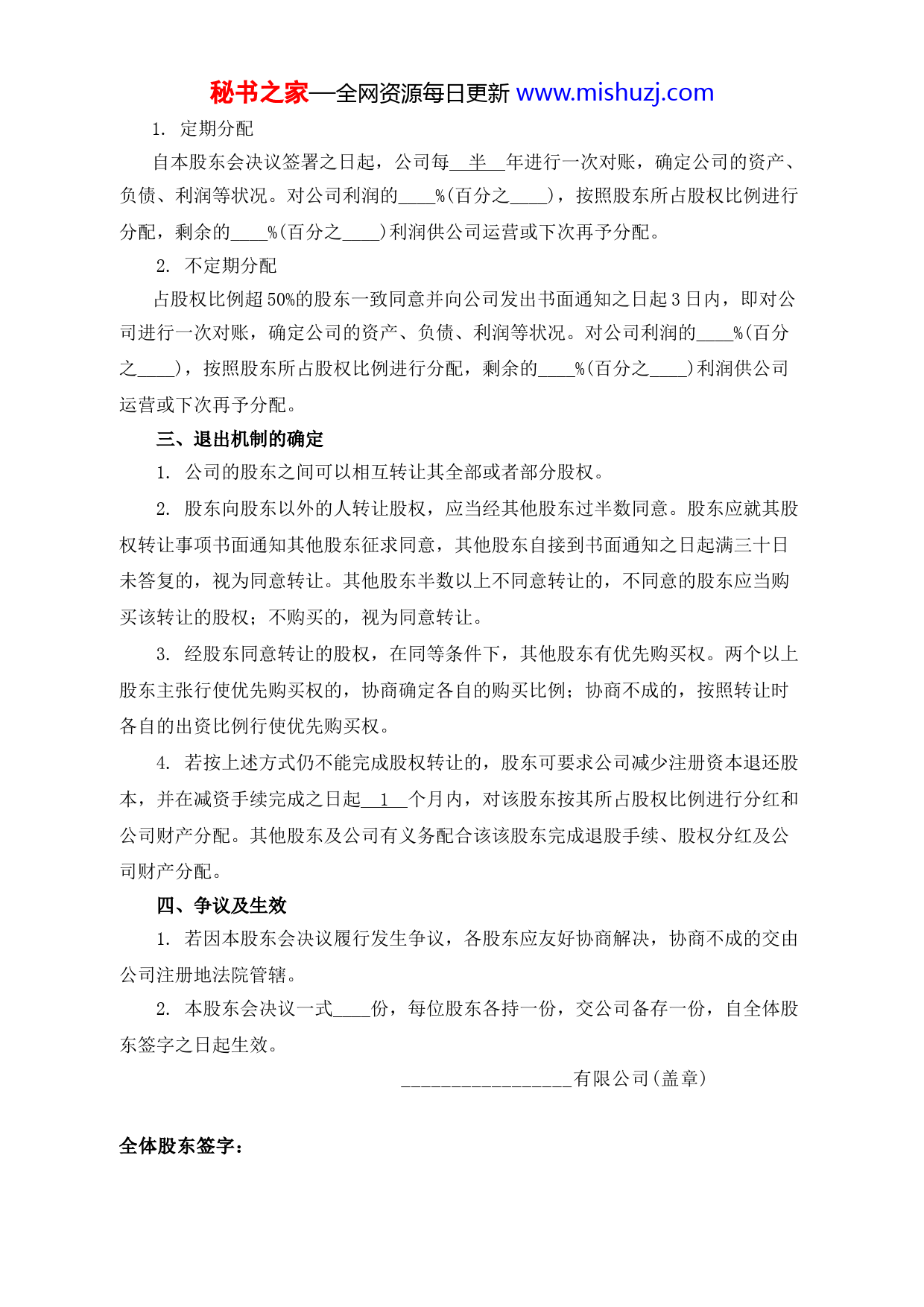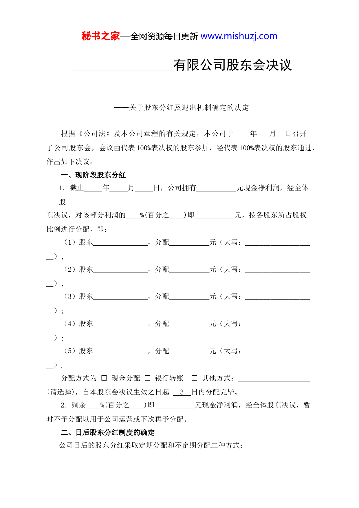 秘书之家—全网资源每日更新www.mishuzj.com_______________有限公司股东会决议──关于股东分红及退出机制确定的决定根据《公司法》及本公司章程的有关规定,本公司于年月日召开了公司股东会,会议由代表100%表决权的股东参加,经代表100%表决权的股东通过,作出如下决议:一、现阶段股东分红1.截止年月日,公司拥有元现金净利润,经全体股东决议,对该部分利润的____%(百分之____)即___________元,按各股东所占股权比例进行分配,即:(1)股东,分配元(大写:____________________);(2)股东,分配元(大写:____________________);(3)股东,分配元(大写:____________________);(4)股东,分配元(大写:____________________);(5)股东,分配元(大写:____________________).分配方式为□现金分配□银行转账□其他方式:(请选择),自本股东会决议生效之日起3日内分配完毕。2.剩余____%(百分之____)即___________元现金净利润,经全体股东决议,暂时不予分配以用于公司运营或下次再予分配。二、日后股东分红制度的确定公司日后的股东分红采取定期分配和不定期分配二种方式:秘书之家—全网资源每日更新www.mishuzj.com1.定期分配自本股东会决议签署之日起,公司每半年进行一次对账,确定公司的资产、负债、利润等状况。对公司利润的____%(百分之____),按照股东所占股权比例进行分配,剩余的____%(百分之____)利润供公司运营或下次再予分配。2.不定期分配占股权比例超50%的股东一致同意并向公司发出书面通知之日起3日内,即对公司进行一次对账,确定公司的资产、负债、利润等状况。对公司利润的____%(百分之____),按照股东所占股权比例进行分配,剩余的____%(百分之____)利润供公司运营或下次再予分配。三、退出机制的确定1.公司的股东之间可以相互转让其全部或者部分股权。2.股东向股东以外的人转让股权,应当经其他股东过半数同意。股东应就其股权转让事项书面通知其他股东征求同意,其他股东自接到书面通知之日起满三十日未答复的,视为同意转让。其他股东半数以上不同意转让的,不同意的股东应当购买该转让的股权;不购买的,视为同意转让。3.经股东同意转让的股权,在同等条件下,其他股东有优先购买权。两个以上股东主张行使优先购买权的,协商确定各自的购买比例;协商不成的,按照转让时各自的出资比例行使优先购买权。4.若按上述方式仍不能完成股权转让的,股东可要求公司减少注册资本退还股本,并在减资手续完成之日起1个月内,对该股东按其所占股权比例进行分红和公司财产分配。其他股东及公司有义务配合该该股东完成退股手续、股权分红及公司财产分配。四、争议及生效1.若因本股东会决议履行发生争议,各股东应友好协商解决,协商不成的交由公司注册地法院管辖。2.本股东会决议一式____份,每位股东各持一份,交公司备存一份,自全体股东签字之日起生效。_________________有限公司(盖章)全体股东签字:秘书之家—全网资源每日更新www.mishuzj.com日期:年月日
