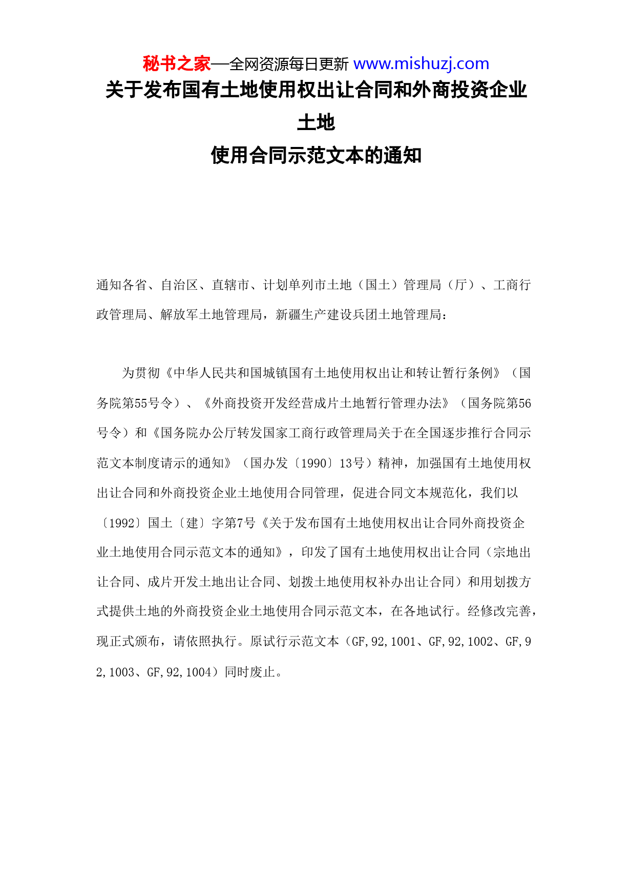 秘书之家—全网资源每日更新www.mishuzj.com关于发布国有土地使用权出让合同和外商投资企业土地使用合同示范文本的通知通知各省、自治区、直辖市、计划单列市土地(国土)管理局(厅)、工商行政管理局、解放军土地管理局,新疆生产建设兵团土地管理局:为贯彻《中华人民共和国城镇国有土地使用权出让和转让暂行条例》(国务院第55号令)、《外商投资开发经营成片土地暂行管理办法》(国务院第56号令)和《国务院办公厅转发国家工商行政管理局关于在全国逐步推行合同示范文本制度请示的通知》(国办发〔1990〕13号)精神,加强国有土地使用权出让合同和外商投资企业土地使用合同管理,促进合同文本规范化,我们以〔1992〕国土〔建〕字第7号《关于发布国有土地使用权出让合同外商投资企业土地使用合同示范文本的通知》,印发了国有土地使用权出让合同(宗地出让合同、成片开发土地出让合同、划拨土地使用权补办出让合同)和用划拨方式提供土地的外商投资企业土地使用合同示范文本,在各地试行。经修改完善,现正式颁布,请依照执行。原试行示范文本(GF,92,1001、GF,92,1002、GF,92,1003、GF,92,1004)同时废止。