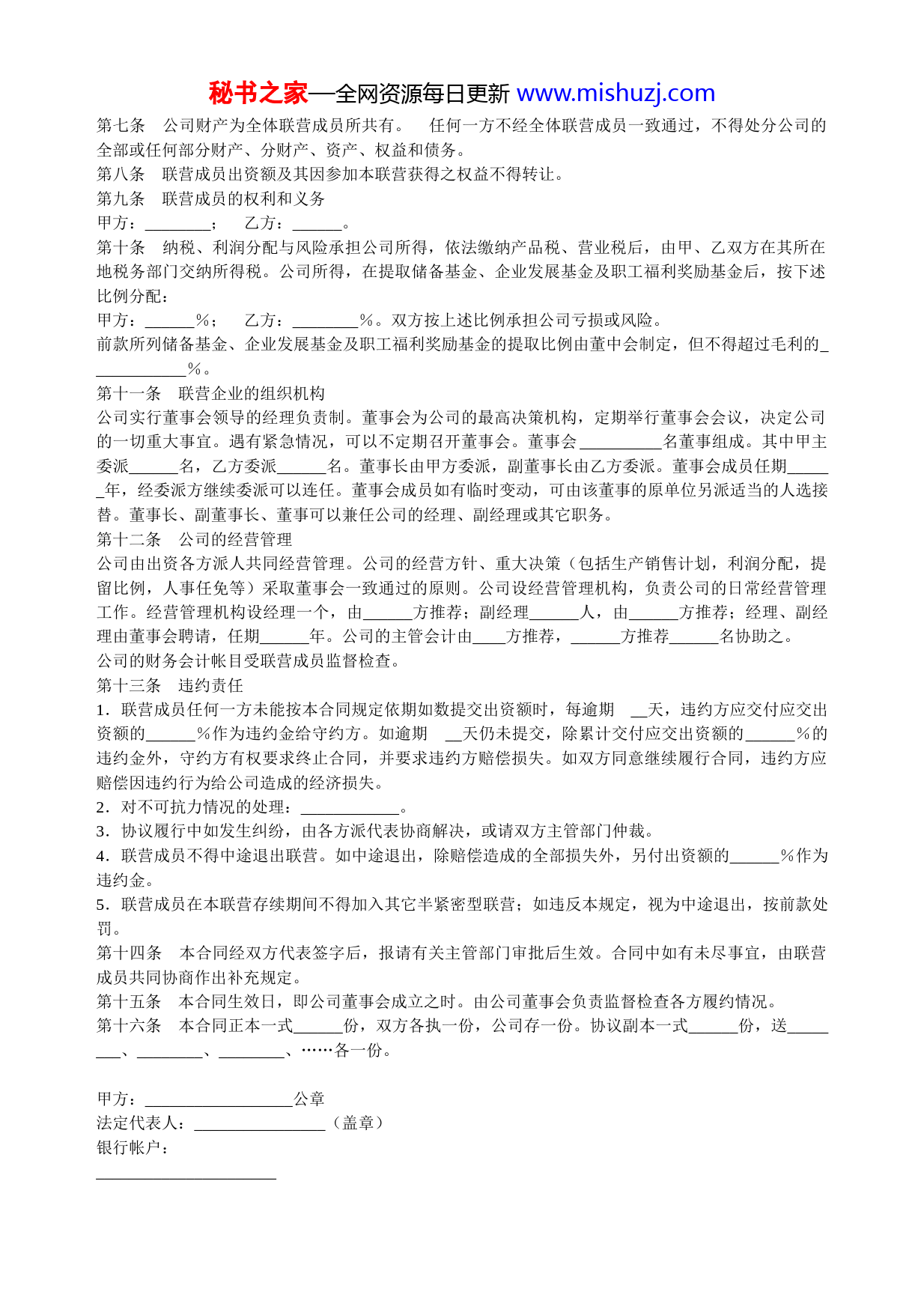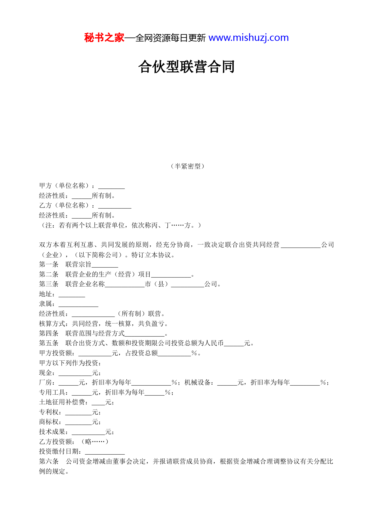 秘书之家—全网资源每日更新www.mishuzj.com合伙型联营合同(半紧密型)甲方(单位名称):________经济性质:______所有制。乙方(单位名称):__________经济性质:______所有制。(注:若有两个以上联营单位,依次称丙、丁……方。)双方本着互利互惠、共同发展的原则,经充分协商,一致决定联合出资共同经营____________公司(企业),(以下简称公司)。特订立本协议。第一条联营宗旨________第二条联营企业的生产(经营)项目____________。第三条联营企业名称____________市(县)__________公司。地址:________隶属:____________经济性质:_____________(所有制)联营。核算方式:共同经营,统一核算,共负盈亏。第四条联营范围与经营方式____________。第五条联合出资方式、数额和投资期限公司投资总额为人民币______元。甲方投资额:__________元,占投资总额__________%。甲方以下列作为投资:现金:__________元;厂房:______元,折旧率为每年____________%;机械设备:______元,折旧率为每年_________%;专用工具:______元,折旧率为每年______%;土地征用补偿费:____元;专利权:________元;商标权:________元;技术成果:__________元;乙方投资额:(略……)投资缴付日期:____________第六条公司资金增减由董事会决定,并报请联营成员协商,根据资金增减合理调整协议有关分配比例的规定。秘书之家—全网资源每日更新www.mishuzj.com第七条公司财产为全体联营成员所共有。任何一方不经全体联营成员一致通过,不得处分公司的全部或任何部分财产、分财产、资产、权益和债务。第八条联营成员出资额及其因参加本联营获得之权益不得转让。第九条联营成员的权利和义务甲方:________;乙方:______。第十条纳税、利润分配与风险承担公司所得,依法缴纳产品税、营业税后,由甲、乙双方在其所在地税务部门交纳所得税。公司所得,在提取储备基金、企业发展基金及职工福利奖励基金后,按下述比例分配:甲方:______%;乙方:________%。双方按上述比例承担公司亏损或风险。前款所列储备基金、企业发展基金及职工福利奖励基金的提取比例由董中会制定,但不得超过毛利的____________%。第十一条联营企业的组织机构公司实行董事会领导的经理负责制。董事会为公司的最高决策机构,定期举行董事会会议,决定公司的一切重大事宜。遇有紧急情况,可以不定期召开董事会。董事会__________名董事组成。其中甲主委派______名,乙方委派______名。董事长由甲方委派,副董事长由乙方委派。董事会成员任期______年,经委派方继续委派可以连任。董事会成员如有临时变动,可由该董事的原单位另派适当的人选接替。董事长、副董事长、董事可以兼任公司的经理、副经理或其它职务。第十二条公司的经营管理公司由出资各方派人共同经营管理。公司的经营方针、重大决策(包括生产销售计划,利润分配,提留比例,人事任免等)采取董事会一致通过的原则。公司设经营管理机构,负责公司的日常经营管理工作。经营管理机构设经理一个,由______方推荐;副经理______人,由______方推荐;经理、副经理由董事会聘请,任期______年。公司的主管会计由____方推荐,______方推荐______名协助之。公司的财务会计帐目受联营成员监督检查。第十三条违约责任1.联营成员任何一方未能按本合同规定依期如数提交出资额时,每逾期__天,违约方应交付应交出资额的______%作为违约金给守约方。如逾期__天仍未提交,除累计交付应交出资额的______%的违约金外,守约方有权要求终止合同,并要求违约方赔偿损失。如双方同意继续履行合同,违约方应赔偿因违约行为给公司造成的经济损失。2.对不可抗力情况的处理:____________。3.协议履行中如发生纠纷,由各方派代表协商解决,或请双方主管部门仲裁。4.联营成员不得中途退出联营。如中途退出,除赔偿造成的全部损失外,另付出资额的______%作为违约金。5.联营成员在本联营存续期间不得加入其它半紧密型联营;如违反本规定,视为中途退出,按前款处罚。第十四条本合同经双方代表签字后,报请有关主管部门审批后生效。合同中如有未尽事宜,由联营成员共同协商作出补充规定。第十五条本合同生效日,即公司董事会成立之时。由公司董事会负责监督检查各方履约情况。第十六条本合同正本一式______份,双方各执一份,公司存一份。协议副本一式______份,送________、________、________、……各一份。甲方:__________________公章法定代表人:________________(盖章)银行帐户:______________________秘书之家—全网资源每日更新www.mishuzj.com地址:____________________乙方:____________________公章法定代表人:_________________(盖章)银行帐户:地址:_____年______月______日