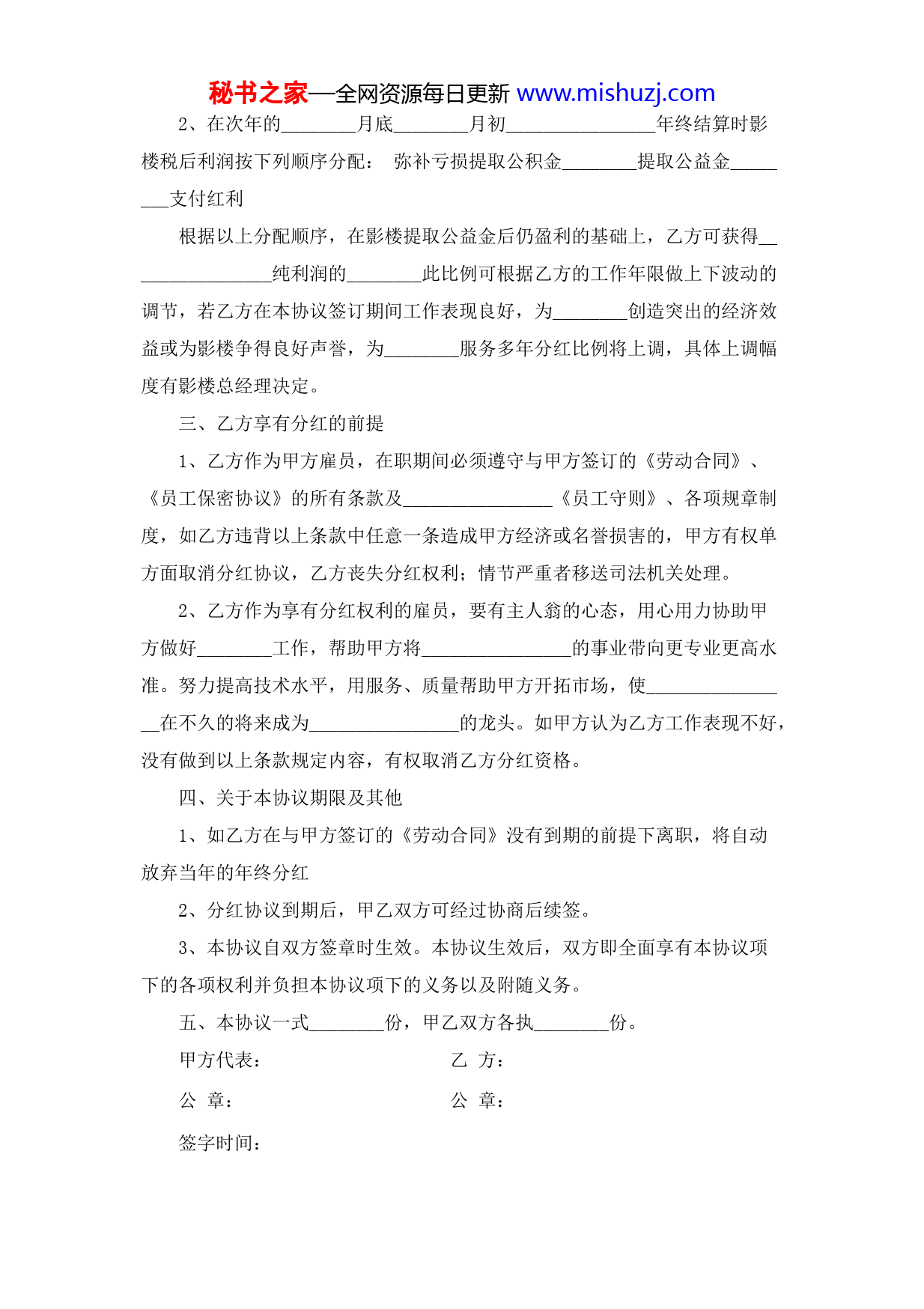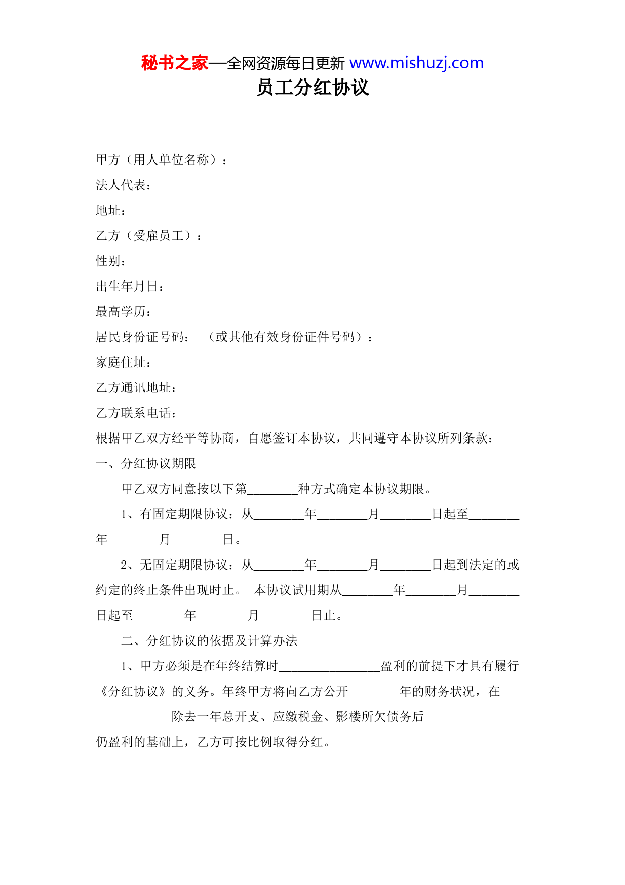 秘书之家—全网资源每日更新www.mishuzj.com员工分红协议甲方(用人单位名称):法人代表:地址:乙方(受雇员工):性别:出生年月日:最高学历:居民身份证号码:(或其他有效身份证件号码):家庭住址:乙方通讯地址:乙方联系电话:根据甲乙双方经平等协商,自愿签订本协议,共同遵守本协议所列条款:一、分红协议期限甲乙双方同意按以下第________种方式确定本协议期限。1、有固定期限协议:从________年________月________日起至________年________月________日。2、无固定期限协议:从________年________月________日起到法定的或约定的终止条件出现时止。本协议试用期从________年________月________日起至________年________月________日止。二、分红协议的依据及计算办法1、甲方必须是在年终结算时________________盈利的前提下才具有履行《分红协议》的义务。年终甲方将向乙方公开________年的财务状况,在________________除去一年总开支、应缴税金、影楼所欠债务后________________仍盈利的基础上,乙方可按比例取得分红。秘书之家—全网资源每日更新www.mishuzj.com2、在次年的________月底________月初________________年终结算时影楼税后利润按下列顺序分配:弥补亏损提取公积金________提取公益金________支付红利根据以上分配顺序,在影楼提取公益金后仍盈利的基础上,乙方可获得________________纯利润的________此比例可根据乙方的工作年限做上下波动的调节,若乙方在本协议签订期间工作表现良好,为________创造突出的经济效益或为影楼争得良好声誉,为________服务多年分红比例将上调,具体上调幅度有影楼总经理决定。三、乙方享有分红的前提1、乙方作为甲方雇员,在职期间必须遵守与甲方签订的《劳动合同》、《员工保密协议》的所有条款及________________《员工守则》、各项规章制度,如乙方违背以上条款中任意一条造成甲方经济或名誉损害的,甲方有权单方面取消分红协议,乙方丧失分红权利;情节严重者移送司法机关处理。2、乙方作为享有分红权利的雇员,要有主人翁的心态,用心用力协助甲方做好________工作,帮助甲方将________________的事业带向更专业更高水准。努力提高技术水平,用服务、质量帮助甲方开拓市场,使________________在不久的将来成为________________的龙头。如甲方认为乙方工作表现不好,没有做到以上条款规定内容,有权取消乙方分红资格。四、关于本协议期限及其他1、如乙方在与甲方签订的《劳动合同》没有到期的前提下离职,将自动放弃当年的年终分红2、分红协议到期后,甲乙双方可经过协商后续签。3、本协议自双方签章时生效。本协议生效后,双方即全面享有本协议项下的各项权利并负担本协议项下的义务以及附随义务。五、本协议一式________份,甲乙双方各执________份。甲方代表:乙方:公章:公章:签字时间:秘书之家—全网资源每日更新www.mishuzj.com