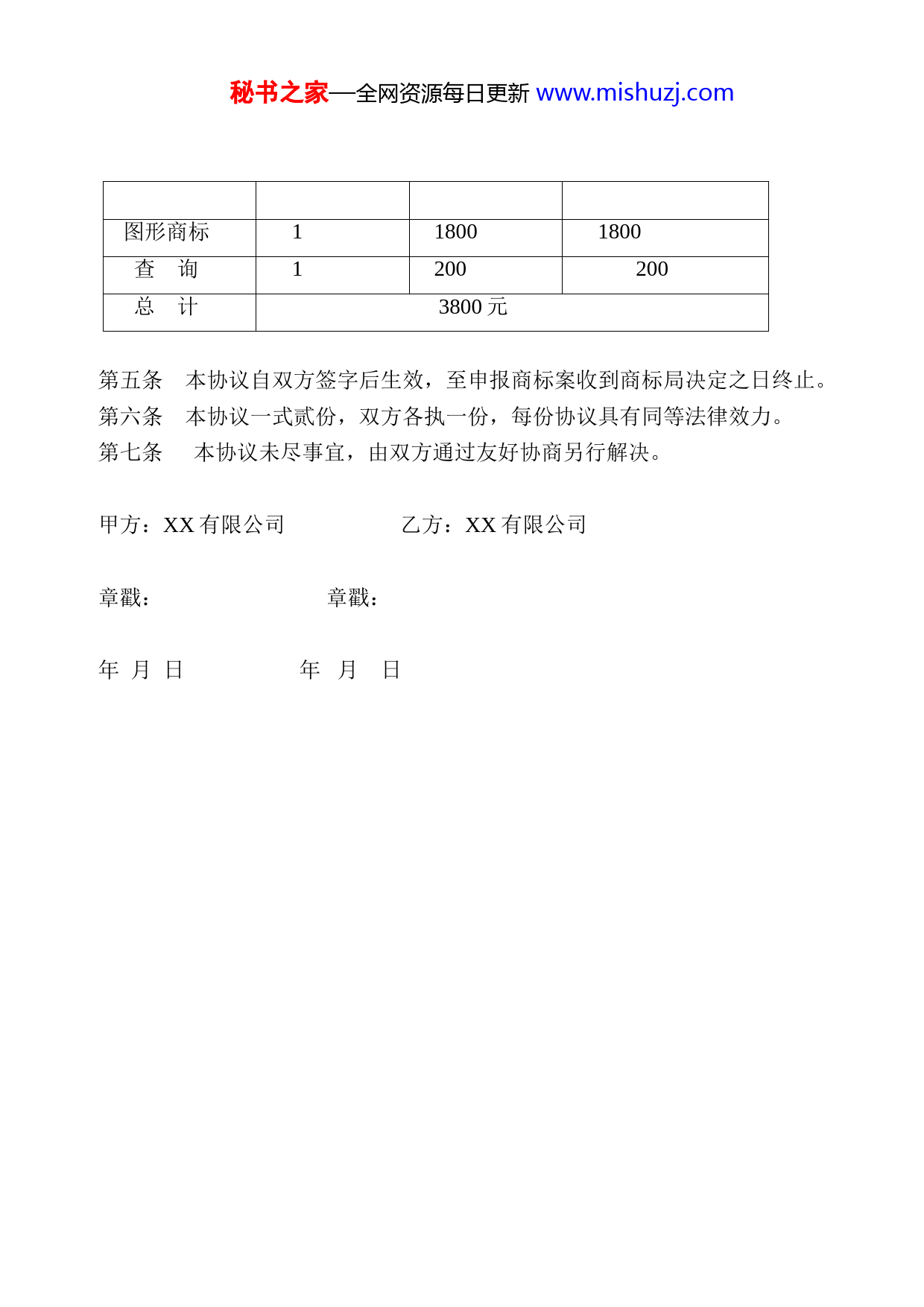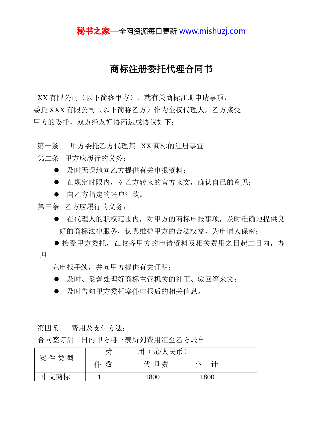 秘书之家—全网资源每日更新www.mishuzj.com商标注册委托代理合同书XX有限公司(以下简称甲方),就有关商标注册申请事项,委托XXX有限公司(以下简称乙方)作为全权代理人,乙方接受甲方的委托,双方经友好协商达成协议如下:第一条甲方委托乙方代理其XX商标的注册事宜。第二条甲方应履行的义务:及时无误地向乙方提供有关申报资料;在规定时限内,对乙方转来的官方来文,确认自已的意见;向乙方指定的帐户汇款。第三条乙方应履行的义务:在代理人的职权范围内,对甲方的商标申报事项,及时准确地提供良好的商标法律服务,认真维护甲方的合法权益,为申请人保密;接受甲方委托,在收齐甲方的申请资料及相关费用之日起二日内,办理完申报手续,并向甲方提供有关证明;及时、妥善处理好商标主管机关的补正、驳回等来文;及时告知甲方委托案件申报后的相关信息。第四条费用及支付方法:合同签订后二日内甲方将下表所列费用汇至乙方账户案件类型费用(元/人民币)件数代理费小计中文商标118001800秘书之家—全网资源每日更新www.mishuzj.com图形商标118001800200200查询13800元总计第五条本协议自双方签字后生效,至申报商标案收到商标局决定之日终止。第六条本协议一式贰份,双方各执一份,每份协议具有同等法律效力。第七条本协议未尽事宜,由双方通过友好协商另行解决。甲方:XX有限公司乙方:XX有限公司章戳:章戳:年月日年月日