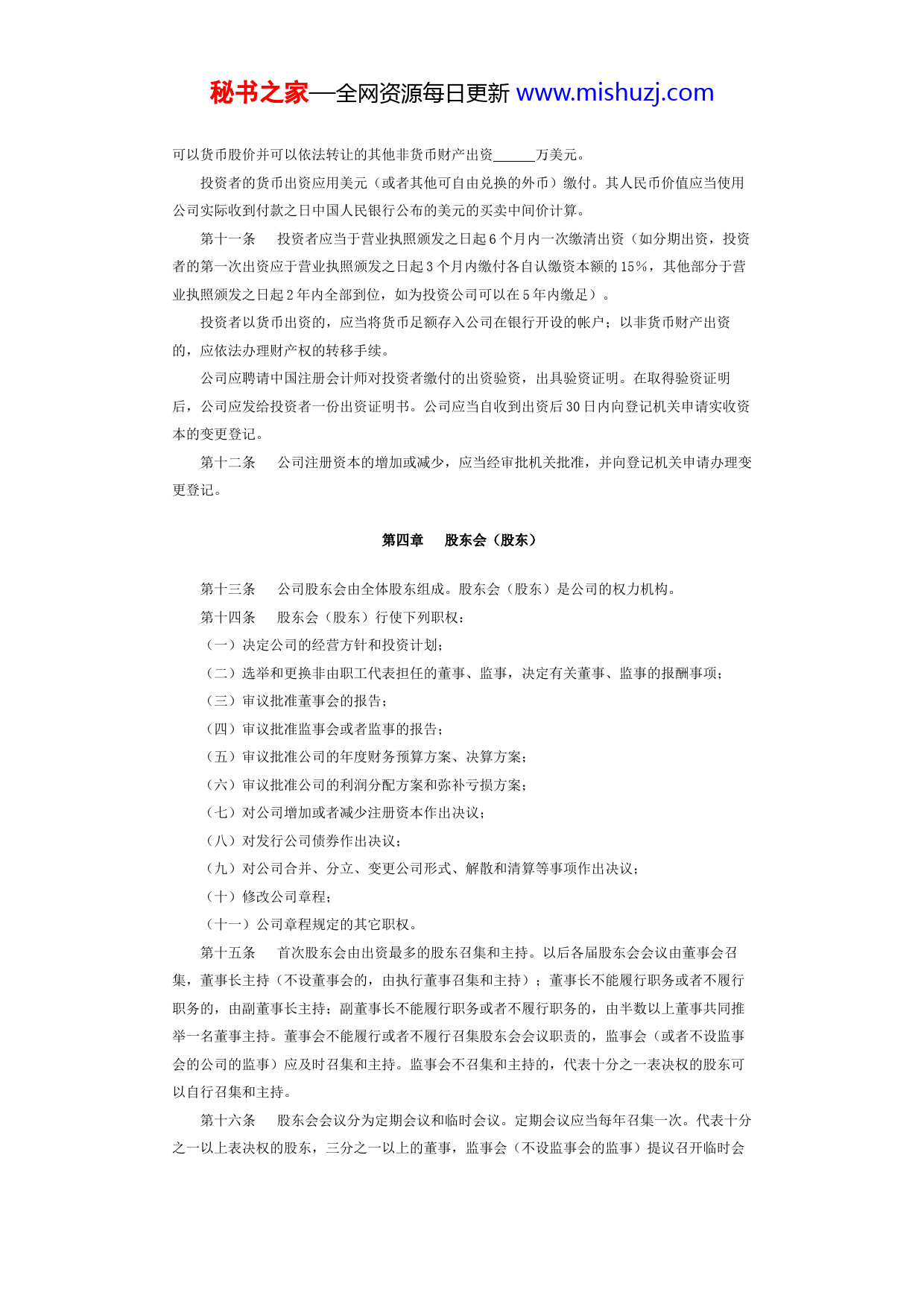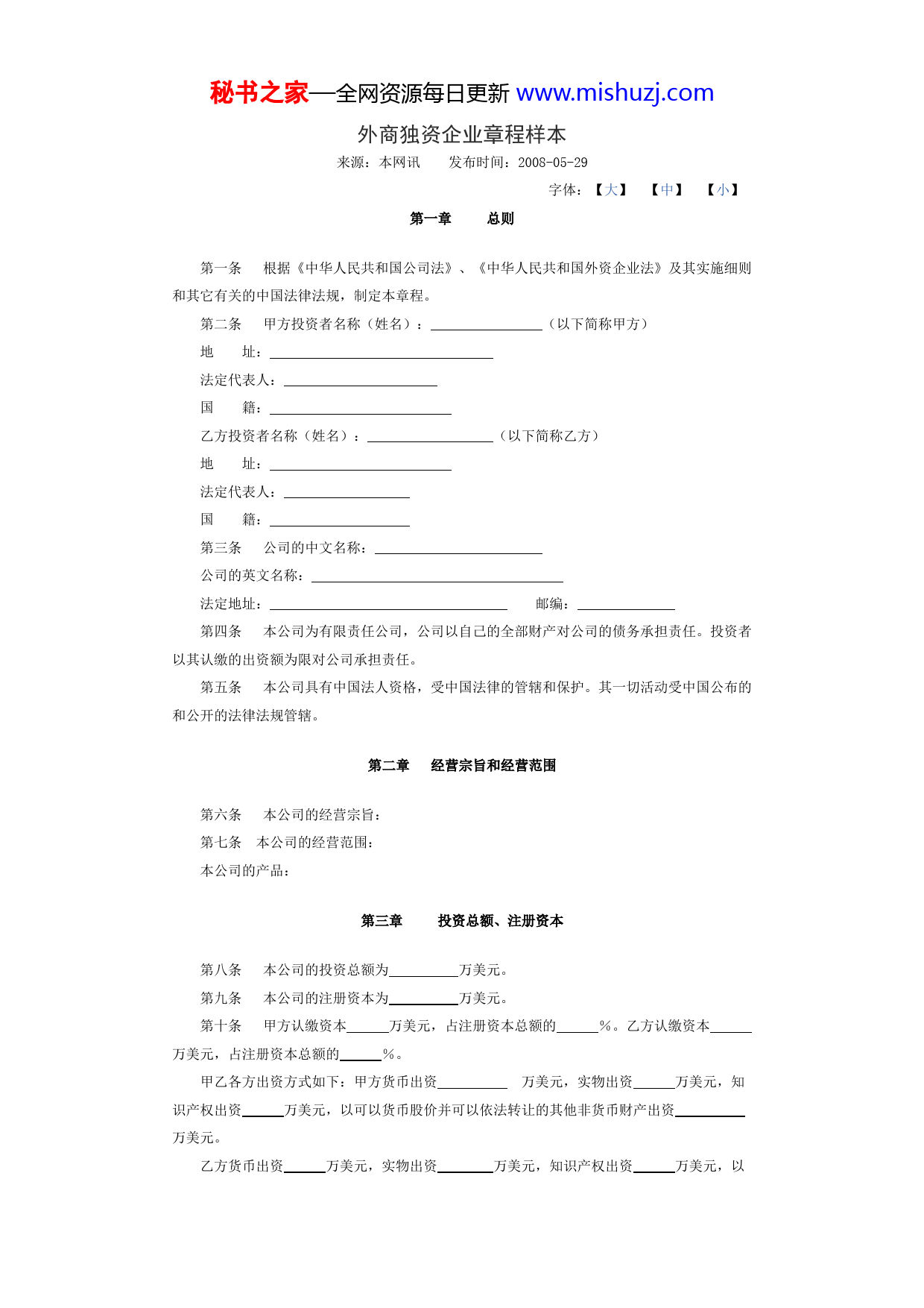 秘书之家—全网资源每日更新www.mishuzj.com外商独资企业章程样本来源:本网讯发布时间:2008-05-29字体:【大】【中】【小】第一章总则第一条根据《中华人民共和国公司法》、《中华人民共和国外资企业法》及其实施细则和其它有关的中国法律法规,制定本章程。第二条甲方投资者名称(姓名):(以下简称甲方)地址:法定代表人:国籍:乙方投资者名称(姓名):(以下简称乙方)地址:法定代表人:国籍:第三条公司的中文名称:公司的英文名称:法定地址:邮编:第四条本公司为有限责任公司,公司以自己的全部财产对公司的债务承担责任。投资者以其认缴的出资额为限对公司承担责任。第五条本公司具有中国法人资格,受中国法律的管辖和保护。其一切活动受中国公布的和公开的法律法规管辖。第二章经营宗旨和经营范围第六条本公司的经营宗旨:第七条本公司的经营范围:本公司的产品:第三章投资总额、注册资本第八条本公司的投资总额为万美元。第九条本公司的注册资本为万美元。第十条甲方认缴资本万美元,占注册资本总额的%。乙方认缴资本万美元,占注册资本总额的%。甲乙各方出资方式如下:甲方货币出资万美元,实物出资万美元,知识产权出资万美元,以可以货币股价并可以依法转让的其他非货币财产出资万美元。乙方货币出资万美元,实物出资万美元,知识产权出资万美元,以秘书之家—全网资源每日更新www.mishuzj.com可以货币股价并可以依法转让的其他非货币财产出资万美元。投资者的货币出资应用美元(或者其他可自由兑换的外币)缴付。其人民币价值应当使用公司实际收到付款之日中国人民银行公布的美元的买卖中间价计算。第十一条投资者应当于营业执照颁发之日起6个月内一次缴清出资(如分期出资,投资者的第一次出资应于营业执照颁发之日起3个月内缴付各自认缴资本额的15%,其他部分于营业执照颁发之日起2年内全部到位,如为投资公司可以在5年内缴足)。投资者以货币出资的,应当将货币足额存入公司在银行开设的帐户;以非货币财产出资的,应依法办理财产权的转移手续。公司应聘请中国注册会计师对投资者缴付的出资验资,出具验资证明。在取得验资证明后,公司应发给投资者一份出资证明书。公司应当自收到出资后30日内向登记机关申请实收资本的变更登记。第十二条公司注册资本的增加或减少,应当经审批机关批准,并向登记机关申请办理变更登记。第四章股东会(股东)第十三条公司股东会由全体股东组成。股东会(股东)是公司的权力机构。第十四条股东会(股东)行使下列职权:(一)决定公司的经营方针和投资计划;(二)选举和更换非由职工代表担任的董事、监事,决定有关董事、监事的报酬事项;(三)审议批准董事会的报告;(四)审议批准监事会或者监事的报告;(五)审议批准公司的年度财务预算方案、决算方案;(六)审议批准公司的利润分配方案和弥补亏损方案;(七)对公司增加或者减少注册资本作出决议;(八)对发行公司债券作出决议;(九)对公司合并、分立、变更公司形式、解散和清算等事项作出决议;(十)修改公司章程;(十一)公司章程规定的其它职权。第十五条首次股东会由出资最多的股东召集和主持。以后各届股东会会议由董事会召集,董事长主持(不设董事会的,由执行董事召集和主持);董事长不能履行职务或者不履行职务的,由副董事长主持;副董事长不能履行职务或者不履行职务的,由半数以上董事共同推举一名董事主持。董事会不能履行或者不履行召集股东会会议职责的,监事会(或者不设监事会的公司的监事)应及时召集和主持。监事会不召集和主持的,代表十分之一表决权的股东可以自行召集和主持。第十六条股东会会议分为定期会议和临时会议。定期会议应当每年召集一次。代表十分之一以上表决权的股东,三分之一以上的董事,监事会(不设监事会的监事)提议召开临时会秘书之家—全网资源每日更新www.mishuzj.com议的,应当召开临时会议。召开股东会会议,应当于会议召开15日以前通知全体股东,股东会应当对所议事项的决定作成会议记录,出席会议的股东应当在会议记录上签名。依照股东会所有股东的一致书面决议同意,股东会有权不经开会通过决议。第十七条股东会会议由股东按照出资比例行使表决权。下列事项的变更必须经代表三分之二表决权的股东通过:(一)修改公司章程;(二)增加或者减少注册资本的决议;(三)公司合并、分立、解散;(四)变更公司形式。上述事项以外的其他事项的变更,应由代表二分之一以上表决权的股东通过(只有一个股东的外商独资有限公司章程可以删除第十五至十七条)。第十八条:股东会应当对所议事项作成会议记录。股东会决议应包括以下内容:(一)会议届次和召开的时间、地点、方式;(二)会议通知的发出情况;(三)会议召集人和主持人;(四)会议出席情况;(五)会议审议的议题和对议题的表决意向;(六)每项议题的表决方式和表决结果;(七)需要记载的其它事项。(外商独资有限公司的股东做出第十四条所列决定时,应当采取书面形式,并由股东签名后置备于公司)第五章董事会(执行董事)第十九条公司设立董事会(公司股东较少或规模较小的可以不设董事会,设一名执行董事)。公司的营业执照签发之日为董事会成立之日。第二十条董事会由5名董事组成(可以为3-13人)。董事的产生,按照股权比