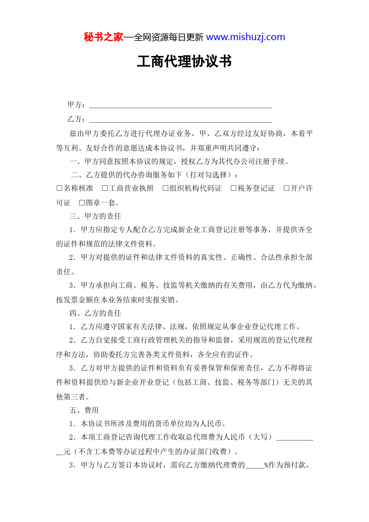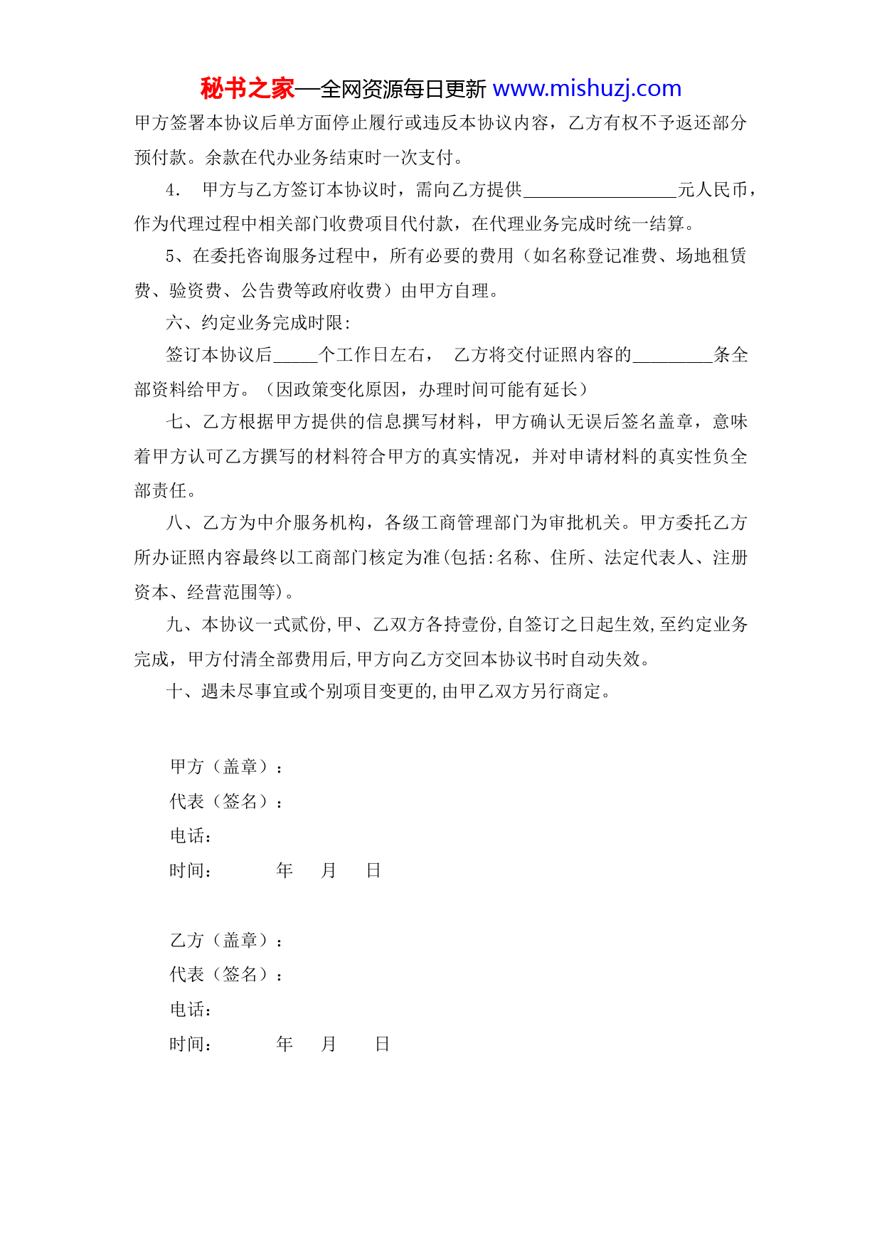 秘书之家—全网资源每日更新www.mishuzj.com工商代理协议书甲方:乙方:兹由甲方委托乙方进行代理办证业务,甲、乙双方经过友好协商,本着平等互利、友好合作的意愿达成本协议书,并郑重声明共同遵守:一、甲方同意按照本协议的规定,授权乙方为其代办公司注册手续。二、乙方提供的代办咨询服务如下(打对勾选择):□名称核准□工商营业执照□组织机构代码证□税务登记证□开户许可证□图章一套。三、甲方的责任1.甲方应指定专人配合乙方完成新企业工商登记注册等事务,并提供齐全的证件和规范的法律文件资料。2.甲方对提供的证件和法律文件资料的真实性、正确性、合法性承担全部责任。3.甲方承担向工商、税务、技监等机关缴纳的有关费用,由乙方代为缴纳,按发票金额在本业务结束时实报实销。四、乙方的责任1.乙方应遵守国家有关法律、法规,依照规定从事企业登记代理工作。2.乙方自觉接受工商行政管理机关的指导和监督,采用规范的登记代理程序和方法,协助委托方完善各类文件资料,齐全应有的证件。3.乙方对甲方提供的证件和资料负有妥善保管和保密责任,乙方不得将证件和资料提供给与新企业开业登记(包括工商、技监、税务等部门)无关的其他第三者。五、费用1.本协议书所涉及费用的货币单位均为人民币。2.本项工商登记咨询代理工作收取总代理费为人民币(大写)____________元(不含工本费等办证过程中产生的办证部门收费)。3.甲方与乙方签订本协议时,需向乙方缴纳代理费的_____%作为预付款,秘书之家—全网资源每日更新www.mishuzj.com甲方签署本协议后单方面停止履行或违反本协议内容,乙方有权不予返还部分预付款。余款在代办业务结束时一次支付。4.甲方与乙方签订本协议时,需向乙方提供元人民币,作为代理过程中相关部门收费项目代付款,在代理业务完成时统一结算。5、在委托咨询服务过程中,所有必要的费用(如名称登记准费、场地租赁费、验资费、公告费等政府收费)由甲方自理。六、约定业务完成时限:签订本协议后_____个工作日左右,乙方将交付证照内容的_________条全部资料给甲方。(因政策变化原因,办理时间可能有延长)七、乙方根据甲方提供的信息撰写材料,甲方确认无误后签名盖章,意味着甲方认可乙方撰写的材料符合甲方的真实情况,并对申请材料的真实性负全部责任。八、乙方为中介服务机构,各级工商管理部门为审批机关。甲方委托乙方所办证照内容最终以工商部门核定为准(包括:名称、住所、法定代表人、注册资本、经营范围等)。九、本协议一式贰份,甲、乙双方各持壹份,自签订之日起生效,至约定业务完成,甲方付清全部费用后,甲方向乙方交回本协议书时自动失效。十、遇未尽事宜或个别项目变更的,由甲乙双方另行商定。甲方(盖章):代表(签名):电话:时间:年月日乙方(盖章):代表(签名):电话:时间:年月日
