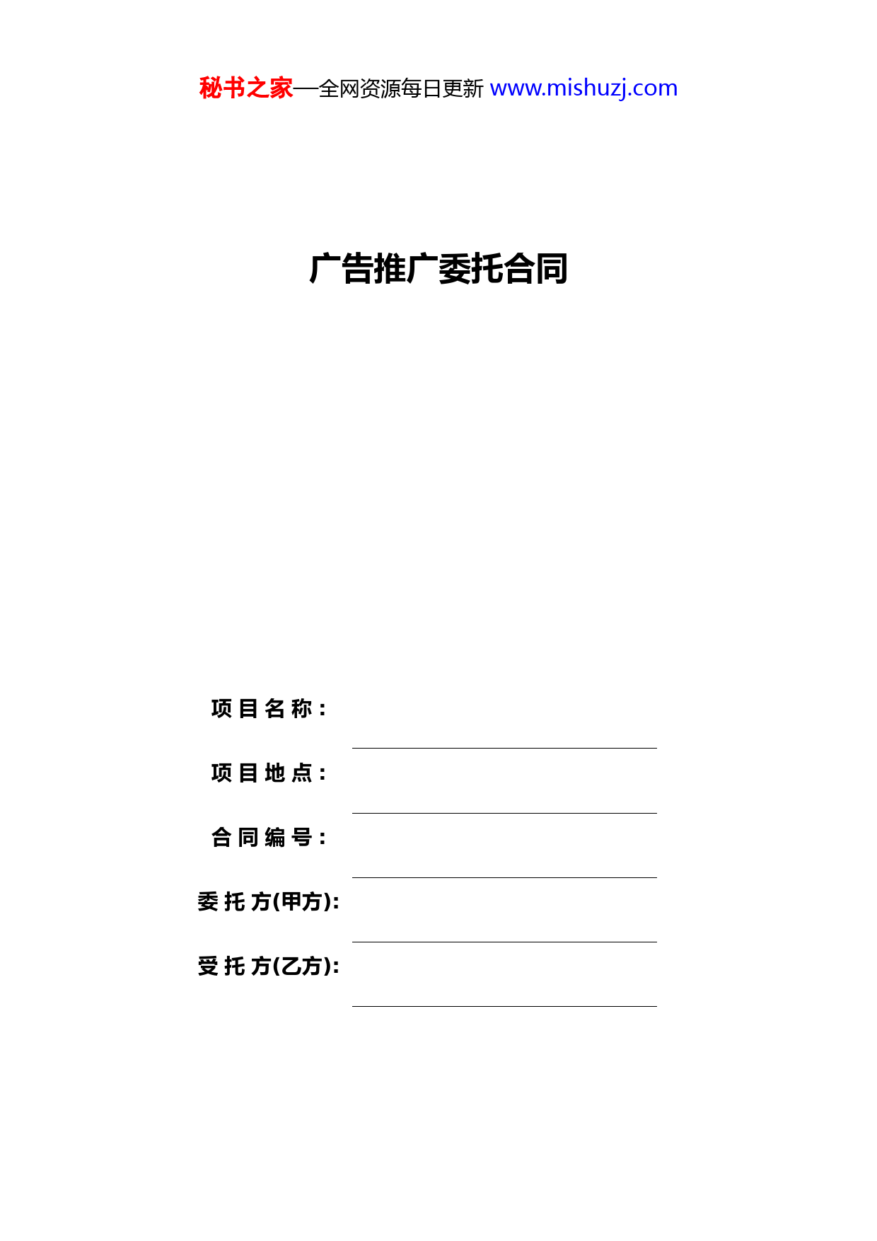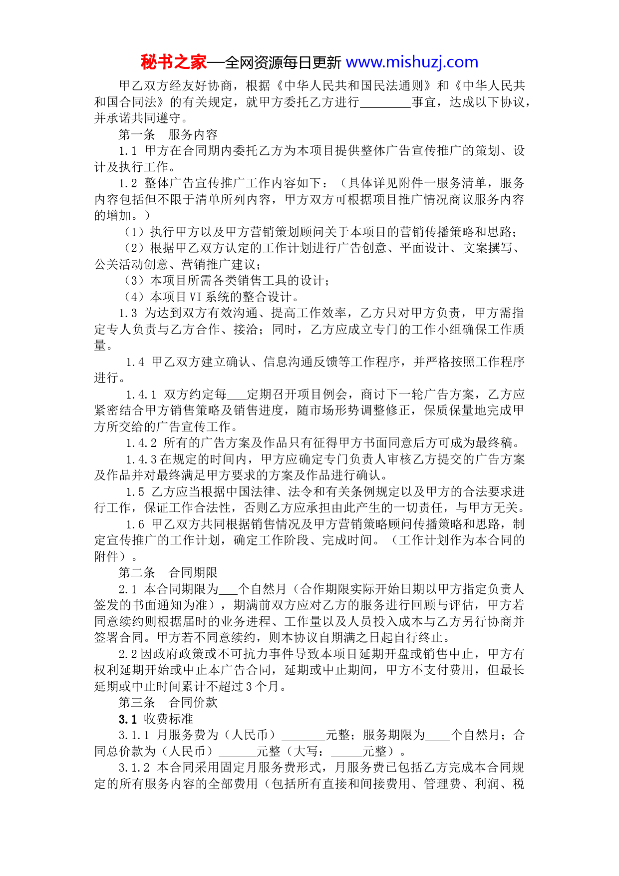 秘书之家—全网资源每日更新www.mishuzj.com广告推广委托合同项目名称:项目地点:合同编号:委托方(甲方):受托方(乙方):秘书之家—全网资源每日更新www.mishuzj.com甲乙双方经友好协商,根据《中华人民共和国民法通则》和《中华人民共和国合同法》的有关规定,就甲方委托乙方进行事宜,达成以下协议,并承诺共同遵守。第一条服务内容1.1甲方在合同期内委托乙方为本项目提供整体广告宣传推广的策划、设计及执行工作。1.2整体广告宣传推广工作内容如下:(具体详见附件一服务清单,服务内容包括但不限于清单所列内容,甲方双方可根据项目推广情况商议服务内容的增加。)(1)执行甲方以及甲方营销策划顾问关于本项目的营销传播策略和思路;(2)根据甲乙双方认定的工作计划进行广告创意、平面设计、文案撰写、公关活动创意、营销推广建议;(3)本项目所需各类销售工具的设计;(4)本项目VI系统的整合设计。1.3为达到双方有效沟通、提高工作效率,乙方只对甲方负责,甲方需指定专人负责与乙方合作、接洽;同时,乙方应成立专门的工作小组确保工作质量。1.4甲乙双方建立确认、信息沟通反馈等工作程序,并严格按照工作程序进行。1.4.1双方约定每定期召开项目例会,商讨下一轮广告方案,乙方应紧密结合甲方销售策略及销售进度,随市场形势调整修正,保质保量地完成甲方所交给的广告宣传工作。1.4.2所有的广告方案及作品只有征得甲方书面同意后方可成为最终稿。1.4.3在规定的时间内,甲方应确定专门负责人审核乙方提交的广告方案及作品并对最终满足甲方要求的方案及作品进行确认。1.5乙方应当根据中国法律、法令和有关条例规定以及甲方的合法要求进行工作,保证工作合法性,否则乙方应承担由此产生的一切责任,与甲方无关。1.6甲乙双方共同根据销售情况及甲方营销策略顾问传播策略和思路,制定宣传推广的工作计划,确定工作阶段、完成时间。(工作计划作为本合同的附件)。第二条合同期限2.1本合同期限为个自然月(合作期限实际开始日期以甲方指定负责人签发的书面通知为准),期满前双方应对乙方的服务进行回顾与评估,甲方若同意续约则根据届时的业务进程、工作量以及人员投入成本与乙方另行协商并签署合同。甲方若不同意续约,则本协议自期满之日起自行终止。2.2因政府政策或不可抗力事件导致本项目延期开盘或销售中止,甲方有权利延期开始或中止本广告合同,延期或中止期间,甲方不支付费用,但最长延期或中止时间累计不超过3个月。第三条合同价款3.1收费标准3.1.1月服务费为(人民币)元整;服务期限为个自然月;合同总价款为(人民币)元整(大写:元整)。3.1.2本合同采用固定月服务费形式,月服务费已包括乙方完成本合同规定的所有服务内容的全部费用(包括所有直接和间接费用、管理费、利润、税秘书之家—全网资源每日更新www.mishuzj.com金等,包括但不限于行政费用和服务人员的薪金、现场服务、福利、保险、交通、食宿和通讯等所有费用)。3.2付款方式在本合同履行期间内,乙方应于每月20日前向甲方做书面请款报告申请本月服务费,甲方于每月10日之前向乙方全额支付上月服务费,如遇节假日法定休息日则相应顺延。3.3付款条件3.3.1甲方在收到乙方提交的下列文件后方履行上述支付义务:(1)合法合规发票(发票金额与每次支付的实际金额相等);(2)乙方提交的书面月服务费支付申请;(3)乙方提交甲方确认的月度工作清单。3.3.2乙方应在甲方每次付款的前5日按照有关规定开具合规发票,否则导致的甲方付款延迟,甲方不承担任何责任,乙方也不得因此怠于履行本合同。3.4第三方费用3.4.1双方合作过程中涉及第三方,由甲方与第三方另行签订合同,所有发生的第三方费用由甲方承担;3.4.2乙方应对其完成的全部广告作品承担审核的义务,对于由于乙方设计的广告内容(包含合同中所述的全部工作),产生的一切违法责任和由此给甲方或第三方造成的财产损失将由乙方全部承担。3.4.3关于广告发布事宜,如最终甲方委托乙方负责代理发布,相关代理或中介费用已包含在月服务费中。乙方不再另行收取任何中介服务费,甲方有权委托专业发布代理公司进行广告版位预定和发布。3.4.4第三方角色界定:第三方涵盖为各媒体、户外广告制作公司、印刷印制公司、公关活动公司、记者发布人、自由撰稿人、自由绘画人、展览制作公司、标牌制作公司、喷绘公司、礼品公司、网络公司、电子出版物公司、正片公司、影视广告专业制作公司、摄影师或摄影公司、出片打样公司、图片租赁公司等。3.5续约价格如合同期满,甲方需与乙方续签合同,乙方承诺无论续约期限长短,均维持人民币:元整(元整/月)服务费收取标准。3.6乙方的账户信息帐户:帐号:开户行:第四条甲、乙双方的权利义务4.1甲方的权利义务4.1.1甲方拥有对乙方设计方案最终否决权。4.1.2甲方对乙方提交的设计方案有提出修改的权利。4.1.3在甲方支付本合同规定的相应服务费后,乙方的广告创意、设计成果等著作权归甲方所有,乙方应无条件向甲方提供其创意、设计成果等电子文件,同时应提供确认发布使用的成品电子文件(图片应为成品尺寸大小、300点分辨率的可修改的矢量排版文件)。4.1.4甲方应向乙方提供设计工作中所需的基础资料并接受必要的工作咨询等。秘书之家—全网资源每日更新www.mi