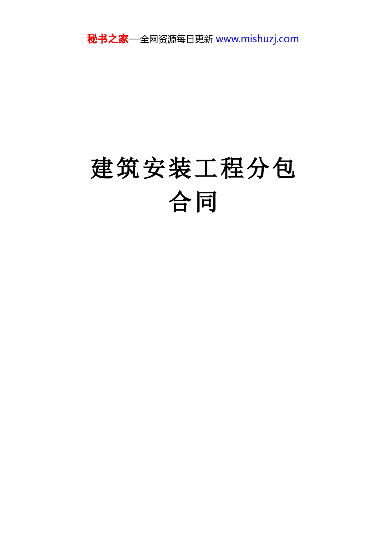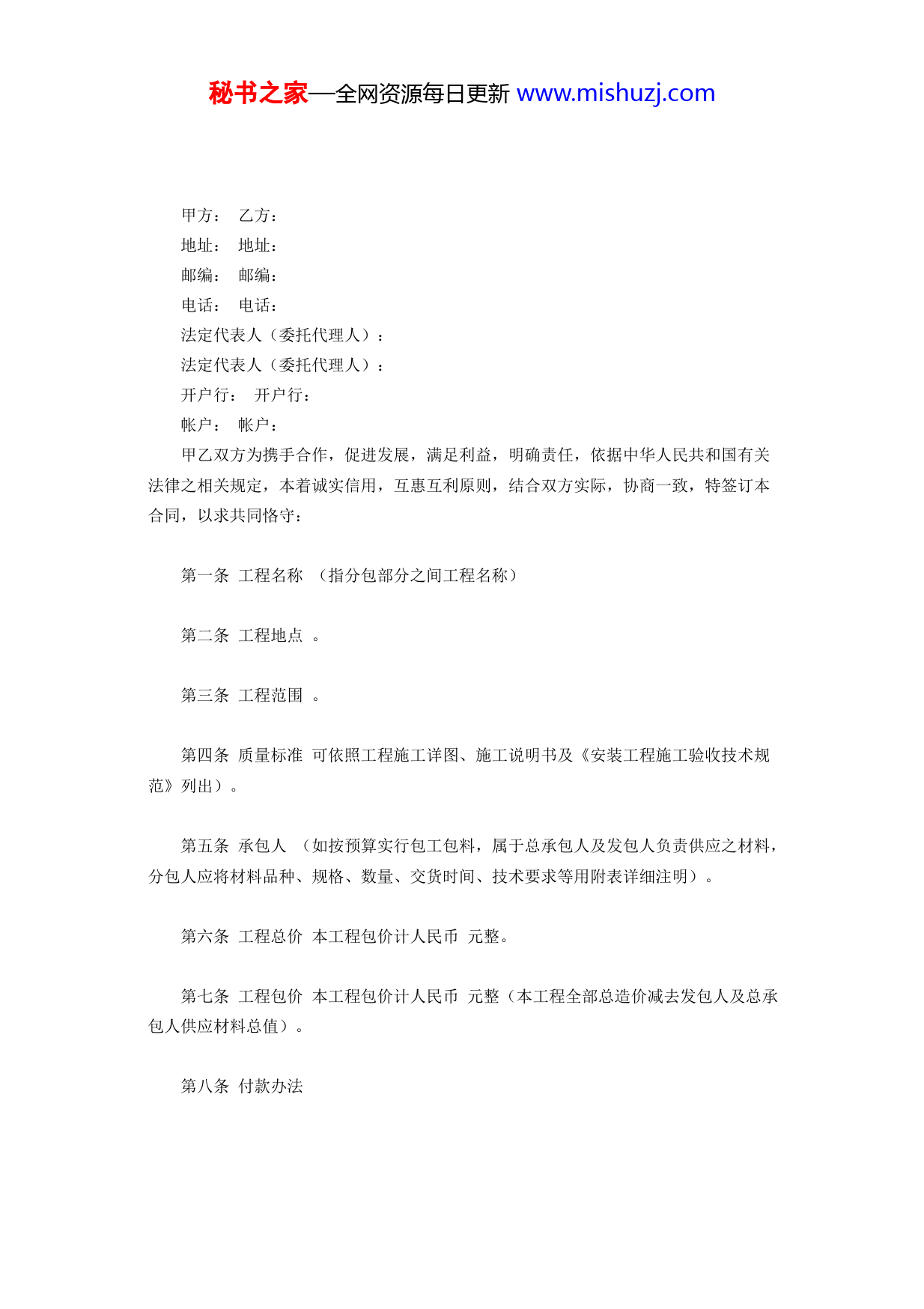 秘书之家—全网资源每日更新www.mishuzj.com建筑安装工程分包合同秘书之家—全网资源每日更新www.mishuzj.com甲方:乙方:地址:地址:邮编:邮编:电话:电话:法定代表人(委托代理人):法定代表人(委托代理人):开户行:开户行:帐户:帐户:甲乙双方为携手合作,促进发展,满足利益,明确责任,依据中华人民共和国有关法律之相关规定,本着诚实信用,互惠互利原则,结合双方实际,协商一致,特签订本合同,以求共同恪守:第一条工程名称(指分包部分之间工程名称)第二条工程地点。第三条工程范围。第四条质量标准可依照工程施工详图、施工说明书及《安装工程施工验收技术规范》列出)。第五条承包人(如按预算实行包工包料,属于总承包人及发包人负责供应之材料,分包人应将材料品种、规格、数量、交货时间、技术要求等用附表详细注明)。第六条工程总价本工程包价计人民币元整。第七条工程包价本工程包价计人民币元整(本工程全部总造价减去发包人及总承包人供应材料总值)。第八条付款办法秘书之家—全网资源每日更新www.mishuzj.com第九条工程期限按本合同第三条的工程范围自年月日开工至年月日止全部完工。第十条中间开工本工程范围内的工程,自年月日开工于年月日完成交工。第十一条双方联系制度及协作办法。第十二条关于工程保密办法。第十三条违约责任。第十四条特殊条款。第十五条合同有效期限,本合同自双方签字盖章后立即生效,在全部工程竣工,办理交工验收款项结清后失效。第十六条合同份数本合同正式两份,双方各执一份,副本份,总承包人收执份(其中送拨款银行及发包人各一份)分包方收执份。第十七条合同附件总承包人:负责人:地址:电话:分包方:负责人:地址:电话:年月日订立附表1:工程项目一览表工程预算号工程名称单位工程数量预算(概算)价值预定工期开工竣工备注附表2:总承包人(发包人)负责供应材料表品种规格单位数量交货时间交货地点备注