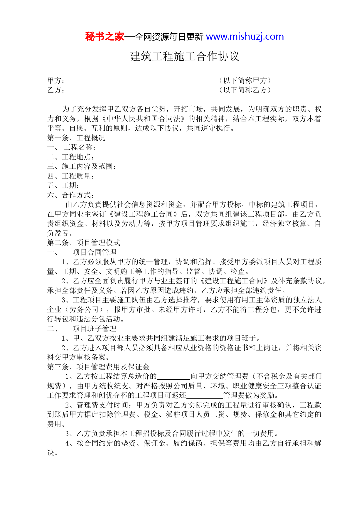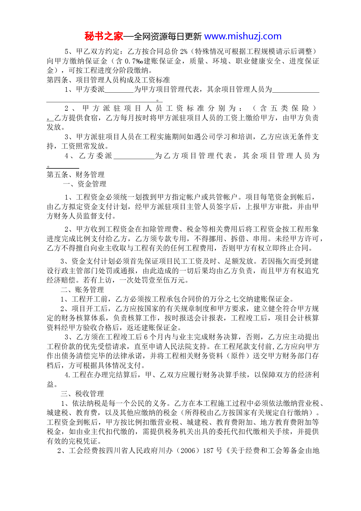 秘书之家—全网资源每日更新www.mishuzj.com建筑工程施工合作协议甲方:(以下简称甲方)乙方:(以下简称乙方)为了充分发挥甲乙双方各自优势,开拓市场,共同发展,为明确双方的职责、权力和义务,根据《中华人民共和国合同法》的相关精神,结合本工程实际,双方本着平等、自愿、互利的原则,达成以下协议,共同遵守执行。第一条、工程概况一、工程名称:二、工程地点:三、施工内容及范围:四、工程质量:五、工期:六、合作方式:由乙方负责提供社会信息资源和资金,并配合甲方投标,中标的建筑工程项目,在甲方同业主签订《建设工程施工合同》后,双方共同组建该工程项目部,由乙方负责组织资金、材料以及劳动力等,按甲方项目管理要求组织施工,经济独立核算、自负盈亏。第二条、项目管理模式一、项目合同管理1、乙方必须服从甲方的统一管理,协调和指挥、接受甲方委派项目人员对工程质量、工期、安全、文明施工等工作的指导、监督、协调、检查。2、乙方应全面负责履行甲方与业主签订的《建设工程施工合同》及补充条款协议,承担全部责任及义务。若因乙方原因造成违约,乙方应承担全部违约责任。3、工程项目主要施工队伍由乙方选择推荐,要求使用有用工主体资质的独立法人企业(劳务公司),报甲方审批。未经甲方许可,乙方不能将工程分包,更不允许进行转包和违法分包活动。二、项目班子管理1、甲、乙双方按业主要求共同组建满足施工要求的项目班子。2、乙方进入项目部人员必须具备相应从业资格的资格证书和上岗证,并将相关资料交甲方审核备案。第三条、项目管理费用及保证金1、乙方按工程结算总造价的向甲方交纳管理费(不含税金及有关部门规费),由甲方统收统支。对严格按照公司质量、环境、职业健康安全三项整合认证工作要求管理和创优夺杯的工程项目可返还管理费做为奖励。2、管理费支付时间:甲方负责对乙方实际完成的工程量进行审核确认,工程款到账后甲方据此扣除管理费、税金、派驻项目人员工资、规费、保修金和其它约定的费用。3、乙方负责承担本工程招投标及合同履行过程中发生的一切费用。4、按合同约定的垫资、保证金、履约保函、担保等费用均由乙方自行承担和解决。秘书之家—全网资源每日更新www.mishuzj.com5、甲乙双方约定:乙方按合同总价2%(特殊情况可根据工程规模请示后调整)向甲方缴纳保证金(含0.7‰建账保证金,质量、环境、职业健康安全、进度保证金),可按工程进度分阶段缴纳。第四条、项目管理人员构成及工资标准1、甲方委派为甲方项目管理代表,其余项目管理人员为。2、甲方派驻项目人员工资标准分别为:(含五类保险),乙方提供食宿,乙方每月按时将甲方派驻项目人员的工资上缴给甲方,由甲方负责发放。3、甲方派驻项目人员在工程实施期间如遇公司学习和培训,乙方应该无条件支持,工资照常发放。4、乙方委派为乙方项目管理代表,其余项目管理人员为。第五条、财务管理一、资金管理1、工程资金必须统一划拨到甲方指定帐户或共管帐户。项目每笔资金到帐后,由乙方拟定资金支付计划,经甲方派驻项目主管人员签字后,上报甲方审批,并由甲方财务人员监督支付。2、甲方收到工程资金在扣除管理费、税金等相关费用后将工程资金按工程形象进度完成比例支付给乙方,乙方须专款专用,不得挪用、拆借、串用。未经甲方许可,乙方不得擅自向业主收取与工程有关的任何工程费用,否则甲方有权立即终止合同。3、资金支付计划必须首先保证项目民工工资及时、足额发放。若因拖欠而受到建设行政主管部门处罚或通报,由此造成的一切后果均由乙方负责,而且甲方有权追究经济赔偿。若有上访,一次处罚壹至伍万元。二、账务管理1、工程开工前,乙方必须按工程承包合同价的万分之七交纳建账保证金。2、项目开工后,乙方应按国家的有关规章制度和甲方要求,建立健全符合甲方规定的财务核算体系,负责核算工作,按时报送会计报表,工程竣工后,项目会计核算资料经甲方验收合格后,返还建账保证金。3、乙方须在工程竣工后6个月内与业主完成财务决算,否则,乙方应主动提出工程价款的优先受偿请求,直至申请人民法院支持。在工程尾款支付前,乙方应向甲方作出债务清偿完毕的法律承诺,并将工程相关财务资料(原件)送交甲方财务部门存档后,方可根据具体情况支付。4.工程在办理完结算后,甲、乙双方应履行财务决算手续,以保障双方的经济利益。三、税收管理1、依法纳税是每一个公民的义务。乙方在本工程施工过程中必须依法缴纳营业税、城建税、教育费,以及其他应缴纳的税金(所得税由乙方按国家有关规定自行缴纳)。工程资金到帐后,甲方按比例扣缴营业税、城建税、教育费附加、地方教育费附加等税金,如由业主代扣代缴的,需提供税务机关出具的委托代扣代缴相关手续,并提供有效的完税凭证。2、工会经费按四川省人民政府川办(2006)187号《关于经费和工会筹备金由地秘书之家—全网资源每日更新www.mishuzj.com税部门统一代征的实施意见》工会筹备金0.3%等有关规定交甲方,由甲方统一缴纳。3、合同印花税按0.03%的合同印花税在第一笔进度款中一次性扣收。第六条、质量、安全、标化、进度及工程技术管理一、工程质量管理1、甲乙双方约定:乙方工程质量达到国家有