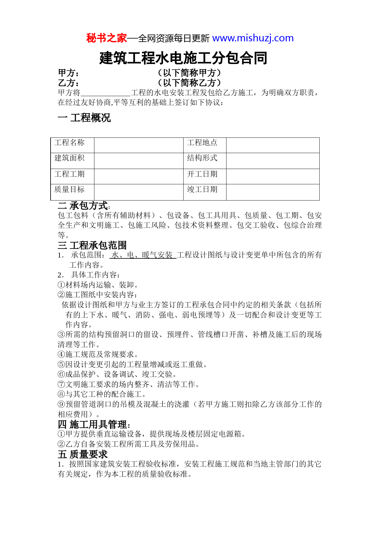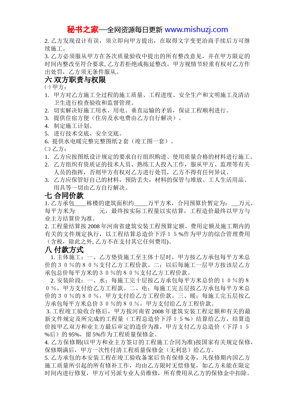秘书之家—全网资源每日更新www.mishuzj.com建筑工程水电施工分包合同甲方:(以下简称甲方)乙方:(以下简称乙方)甲方将工程的水电安装工程发包给乙方施工,为明确双方职责,在经过友好协商,平等互利的基础上签订如下协议:一工程概况工程名称工程地点建筑面积结构形式工程工期开工日期质量目标竣工日期二承包方式:包工包料(含所有辅助材料)、包设备、包工具用具、包质量、包工期、包安全生产和文明施工、包施工风险、包技术资料整理、包交工验收、包综合治理等。三工程承包范围1.承包范围:水、电、暖气安装工程设计图纸与设计变更单中所包含的所有工作内容。2.具体工作内容:①材料场内运输、装卸。②施工图纸中安装内容:依据设计图纸和甲方与业主方签订的工程承包合同中约定的相关条款(包括所有的上下水、暖气、消防、强电、弱电预埋等)及一切配合和设计变更等工作内容。③所需的结构预留洞口的留设、预埋件、管线槽口开凿、补槽及施工后的现场清理等工作。④施工规范及常规要求。⑤因设计变更引起的工程量增减或返工重做。⑥成品保护、设备调试、竣工交验。⑦文明施工要求的场内整齐、清洁等工作。⑧与其它工种的配合施工。⑨预留管道洞口的吊模及混凝土的浇灌(若甲方施工则扣除乙方该部分工作的相应费用)。四施工用具管理:①甲方提供垂直运输设备,提供现场及楼层固定电源箱。②乙方自备安装工程所需工具及劳保用品。五质量要求1.按照国家建筑安装工程验收标准,安装工程施工规范和当地主管部门的其它有关规定,作为本工程的质量验收标准。秘书之家—全网资源每日更新www.mishuzj.com2.乙方发现设计有误,须立即向甲方提出,在取得文字变更洽商手续后方可继续施工。3.乙方必须服从甲方在各次质量验收中提出的所有整改意见,并在甲方限定的时间内整改至符合要求,乙方若拒绝或拖延整改,甲方视情节轻重有权对乙方作出处罚,乙方须无条件服从。六双方职责与权限㈠甲方:1.甲方对乙方施工全过程的施工质量、工程进度、安全生产和文明施工及清洁卫生进行检查验收和监督管理。2.切实解决好施工用水、用电、垂直运输的矛盾,保证工程顺利进行。3.提供住宿方便(住房及水电费由乙方自行解决)。4.制定施工计划。5.进行技术交底、安全交底。6.提供水电暖完整完整图纸2套(竣工图一套)。㈡乙方:1.乙方应按图纸设计规定的要求自行组织购进、使用质量合格的材料进行施工。2.乙方组织有资质证的技术人员、熟练工人投入工作,服从甲方、监理等有关人员的指挥,否则甲方有权对乙方进行处罚,乙方不得有任何异议。3.乙方应保管好自己的材料,预防丢失,材料的保管与堆放、工人生活用品、用具等一切由乙方自行解决。七合同价款1.乙方承包栋楼的建筑面积约万平方米,合同预算价暂定为:万元,每平方米为元,最终按实际工程量以实结算,工程造价最终以甲方与业主方结算价为准。2.工程量结算按2008年河南省建筑安装工程预算定额、费用定额及施工期内的有关的文件规定执行,以工程结算总造价下浮15%作为甲方的综合管理费用(含税,除此之外,乙方不在支付其它任何费用)。八付款方式1.主体施工;一、乙方垫资施工至主体十层时,甲方按乙方承包每平方米总价的30%的80%支付乙方工程价款。二;以后每施工一层甲方按该层乙方承包总价每平方米的30%的80%支付乙方工程价款。2.安装阶段:一、水;每施工完十层按乙方承包每平方米总价的10%的80%,甲方支付给乙方工程款。二、电;每施工完五层按乙方承包每平方米总价的30%的80%,甲方支付给乙方工程价款。三、暖;每施工完五层按乙方承包每平方米总价30%的80%,甲方支付给乙方工程价款。3.工程竣工验收合格后,甲方按河南省2008年建筑安装工程定额和有关的最新文件规定及所完成的工程量(工程总造价下浮15%)结算给乙方,结算造价按甲乙双方和业主方最后审定的造价为准,甲方支付乙方总造价(下浮15%后)的95%,留5%作为工程质量保修金。4.乙方保修期(以甲方和业主方签订的工程施工合同为准)按国家有关规定保修,保修期满后,甲方一次性付清工程质量保修金(无利息)给乙方。5.乙方承包的本安装工程在竣工验收备案后负有保修义务,凡保修期内因乙方施工质量所引起的所有修补工作,均由乙方限时无偿修复,如乙方未能在限定时间内进行修复,甲方可另派专业人员维修,所有费用从乙方的保修金中扣除。秘书之家—全网资源每日更新www.mishuzj.com6.订立合同后乙方必须交万元给甲方作为合同履约保证金,乙方进场交万元工程履约保证金,主体结构至10层后,甲方退还给乙方履约保证金的50%,主体结顶三日内甲方退还乙方剩余的全部履约保证金。7.以上合同不包括现场变更,如遇不可抗拒自然灾害,甲方需要工期顺延,变更造价按甲方与业主方签订的施工合同的有关条款执行。8.如甲方不能及时拨付工程款造成的工程进度滞后,乙方概不负责,给乙方造成的损失由甲乙双方协商解决。附注:每平方米承包总价的分项比例为:1、主体30%2、水10%3、电30%4、暖30%。九安全责任乙方必须安全生产,文明施工,在施工过程中出现的一切安全事故,全部由乙方负责。如发生重大事故,应立即向甲方报告,甲方向上级有关部门报告。十本合同一式四份,甲乙双方各执两份,工程竣工后此协议作废。十