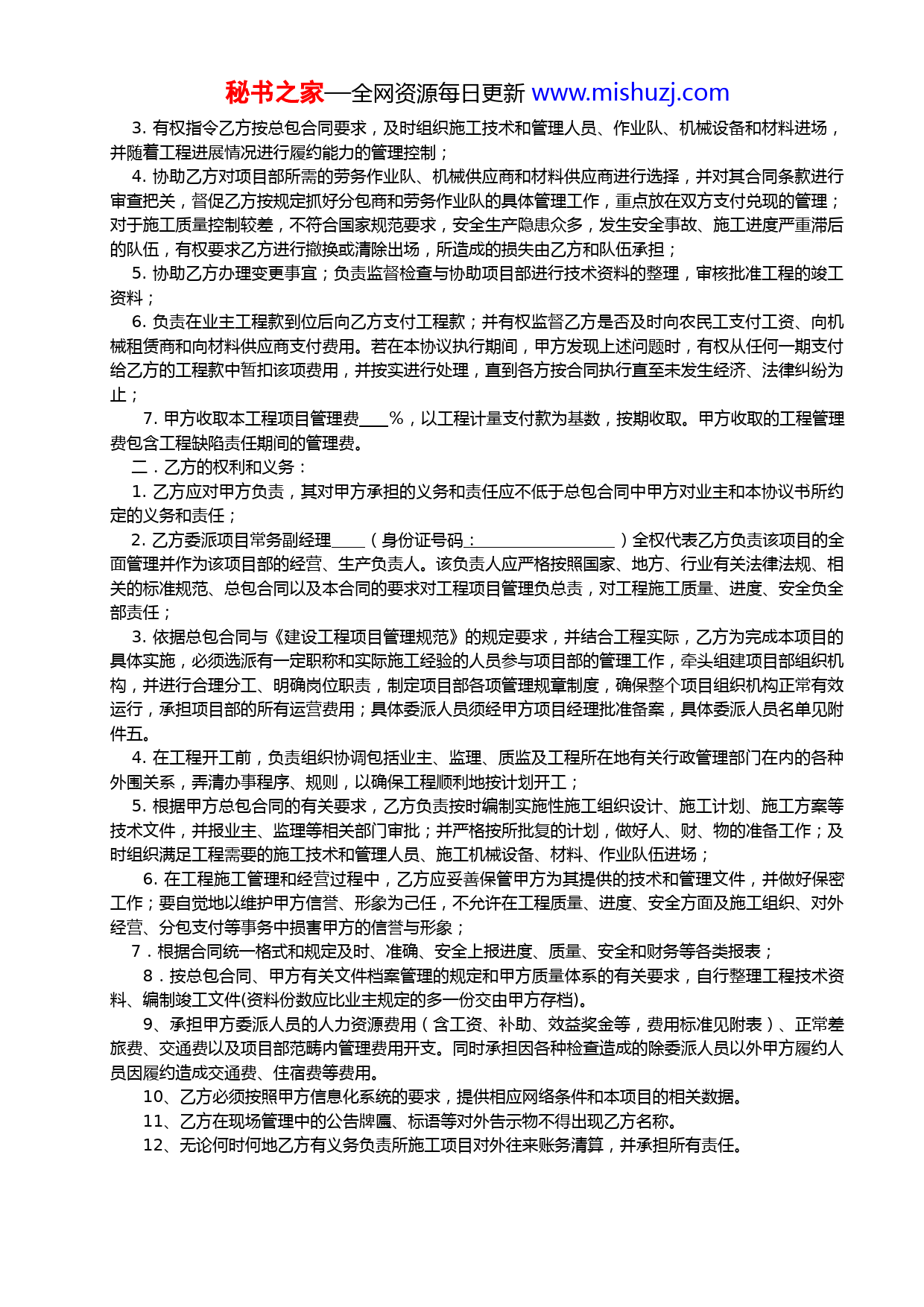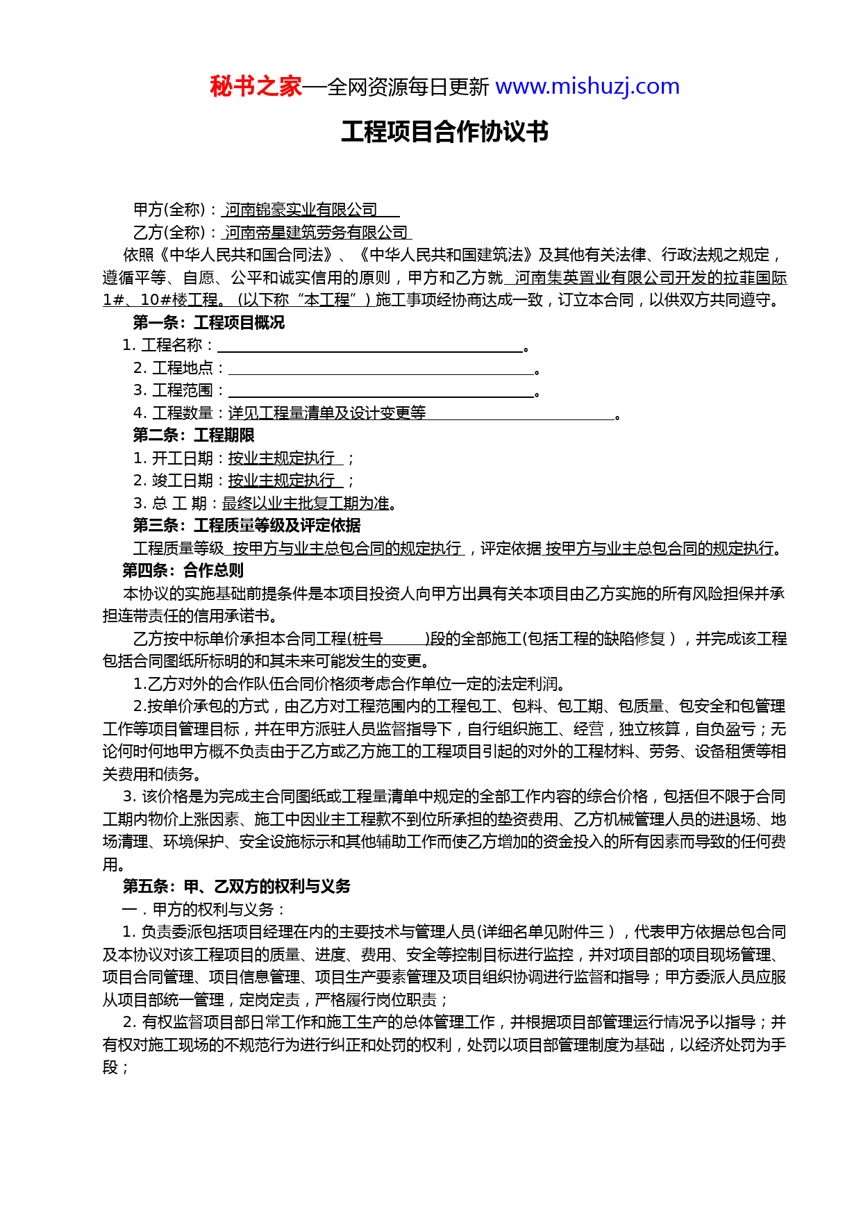 秘书之家—全网资源每日更新www.mishuzj.com工程项目合作协议书甲方(全称):河南锦豪实业有限公司乙方(全称):河南帝星建筑劳务有限公司依照《中华人民共和国合同法》、《中华人民共和国建筑法》及其他有关法律、行政法规之规定,遵循平等、自愿、公平和诚实信用的原则,甲方和乙方就河南集英置业有限公司开发的拉菲国际1#、10#楼工程。(以下称“本工程”)施工事项经协商达成一致,订立本合同,以供双方共同遵守。第一条:工程项目概况1.工程名称:。2.工程地点:。3.工程范围:。4.工程数量:详见工程量清单及设计变更等。第二条:工程期限1.开工日期:按业主规定执行;2.竣工日期:按业主规定执行;3.总工期:最终以业主批复工期为准。第三条:工程质量等级及评定依据工程质量等级按甲方与业主总包合同的规定执行,评定依据按甲方与业主总包合同的规定执行。第四条:合作总则本协议的实施基础前提条件是本项目投资人向甲方出具有关本项目由乙方实施的所有风险担保并承担连带责任的信用承诺书。乙方按中标单价承担本合同工程(桩号)段的全部施工(包括工程的缺陷修复),并完成该工程包括合同图纸所标明的和其未来可能发生的变更。1.乙方对外的合作队伍合同价格须考虑合作单位一定的法定利润。2.按单价承包的方式,由乙方对工程范围内的工程包工、包料、包工期、包质量、包安全和包管理工作等项目管理目标,并在甲方派驻人员监督指导下,自行组织施工、经营,独立核算,自负盈亏;无论何时何地甲方概不负责由于乙方或乙方施工的工程项目引起的对外的工程材料、劳务、设备租赁等相关费用和债务。3.该价格是为完成主合同图纸或工程量清单中规定的全部工作内容的综合价格,包括但不限于合同工期内物价上涨因素、施工中因业主工程款不到位所承担的垫资费用、乙方机械管理人员的进退场、地场清理、环境保护、安全设施标示和其他辅助工作而使乙方增加的资金投入的所有因素而导致的任何费用。第五条:甲、乙双方的权利与义务一.甲方的权利与义务:1.负责委派包括项目经理在内的主要技术与管理人员(详细名单见附件三),代表甲方依据总包合同及本协议对该工程项目的质量、进度、费用、安全等控制目标进行监控,并对项目部的项目现场管理、项目合同管理、项目信息管理、项目生产要素管理及项目组织协调进行监督和指导;甲方委派人员应服从项目部统一管理,定岗定责,严格履行岗位职责;2.有权监督项目部日常工作和施工生产的总体管理工作,并根据项目部管理运行情况予以指导;并有权对施工现场的不规范行为进行纠正和处罚的权利,处罚以项目部管理制度为基础,以经济处罚为手段;秘书之家—全网资源每日更新www.mishuzj.com3.有权指令乙方按总包合同要求,及时组织施工技术和管理人员、作业队、机械设备和材料进场,并随着工程进展情况进行履约能力的管理控制;4.协助乙方对项目部所需的劳务作业队、机械供应商和材料供应商进行选择,并对其合同条款进行审查把关,督促乙方按规定抓好分包商和劳务作业队的具体管理工作,重点放在双方支付兑现的管理;对于施工质量控制较差,不符合国家规范要求,安全生产隐患众多,发生安全事故、施工进度严重滞后的队伍,有权要求乙方进行撤换或清除出场,所造成的损失由乙方和队伍承担;5.协助乙方办理变更事宜;负责监督检查与协助项目部进行技术资料的整理,审核批准工程的竣工资料;6.负责在业主工程款到位后向乙方支付工程款;并有权监督乙方是否及时向农民工支付工资、向机械租赁商和向材料供应商支付费用。若在本协议执行期间,甲方发现上述问题时,有权从任何一期支付给乙方的工程款中暂扣该项费用,并按实进行处理,直到各方按合同执行直至未发生经济、法律纠纷为止;7.甲方收取本工程项目管理费%,以工程计量支付款为基数,按期收取。甲方收取的工程管理费包含工程缺陷责任期间的管理费。二.乙方的权利和义务:1.乙方应对甲方负责,其对甲方承担的义务和责任应不低于总包合同中甲方对业主和本协议书所约定的义务和责任;2.乙方委派项目常务副经理(身份证号码:)全权代表乙方负责该项目的全面管理并作为该项目部的经营、生产负责人。该负责人应严格按照国家、地方、行业有关法律法规、相关的标准规范、总包合同以及本合同的要求对工程项目管理负总责,对工程施工质量、进度、安全负全部责任;3.依据总包合同与《建设工程项目管理规范》的规定要求,并结合工程实际,乙方为完成本项目的具体实施,必须选派有一定职称和实际施工经验的人员参与项目部的管理工作,牵头组建项目部组织机构,并进行合理分工、明确岗位职责,制定项目部各项管理规章制度,确保整个项目组织机构正常有效运行,承担项目部的所有运营费用;具体委派人员须经甲方项目经理批准备案,具体委派人员名单见附件五。4.在工程开工前,负责组织协调包括业主、监理、质监及工程所在地有关行政管理部门在内的各种外围关系,弄清办事程序、规则,以确保工程顺利地按计划开工;5.根据甲方总包合同的有关要求,乙方负责按时编制实施性施工组织设计、施工计划、施工方案等技术文件,并报业主、监理等相关部门审批;并严格按所批复的计划,做好人、财、物的准备工作;及时组织满