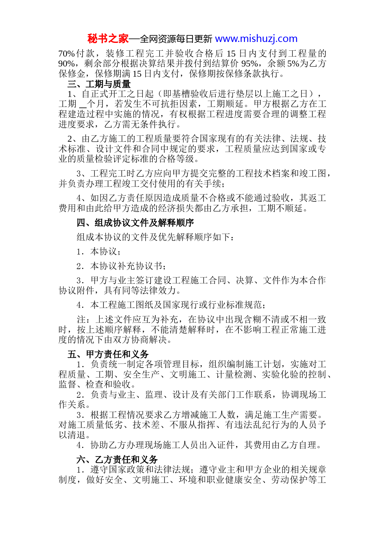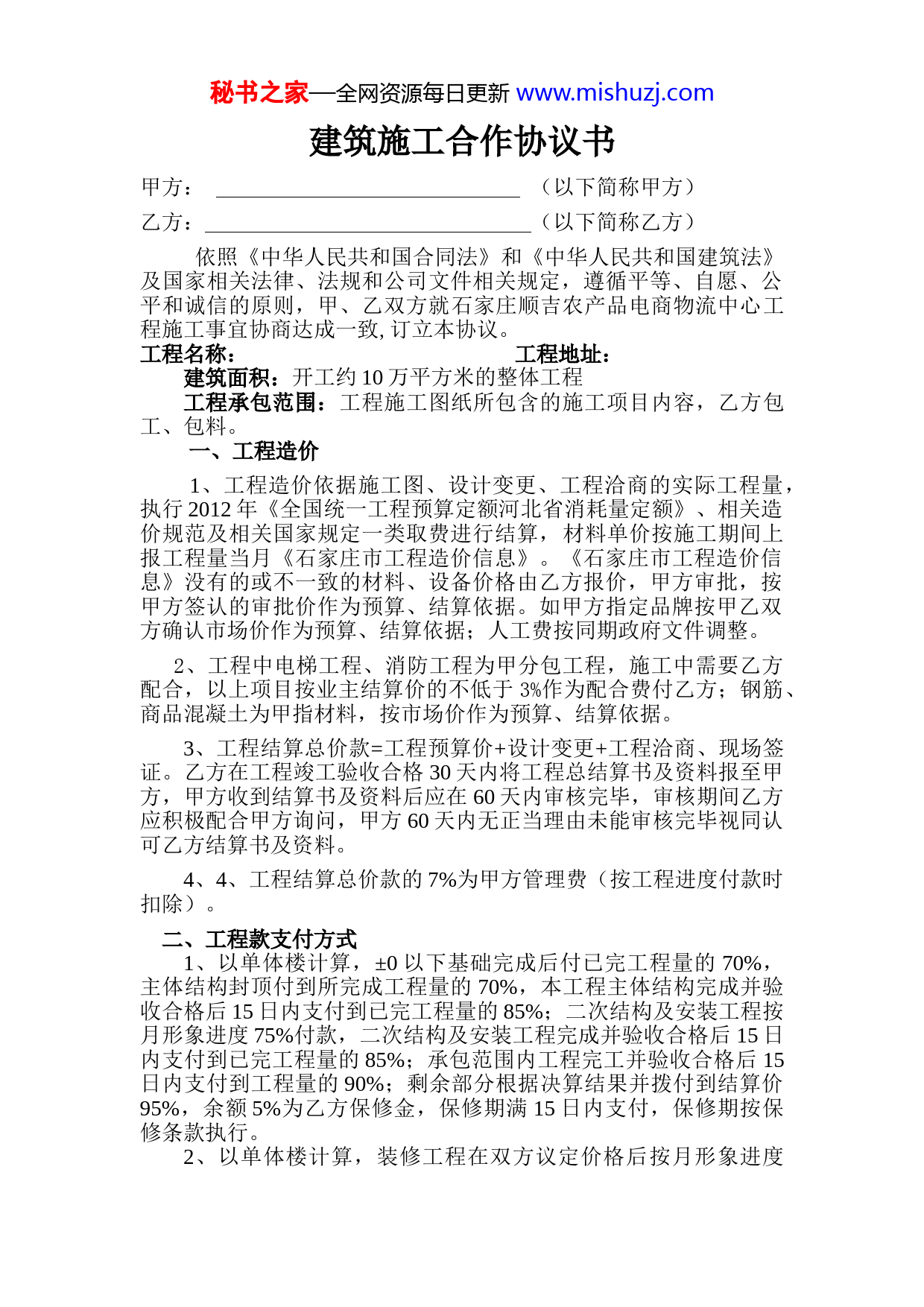 秘书之家—全网资源每日更新www.mishuzj.com建筑施工合作协议书甲方:(以下简称甲方)乙方:(以下简称乙方)依照《中华人民共和国合同法》和《中华人民共和国建筑法》及国家相关法律、法规和公司文件相关规定,遵循平等、自愿、公平和诚信的原则,甲、乙双方就石家庄顺吉农产品电商物流中心工程施工事宜协商达成一致,订立本协议。工程名称:工程地址:建筑面积:开工约10万平方米的整体工程工程承包范围:工程施工图纸所包含的施工项目内容,乙方包工、包料。一、工程造价1、工程造价依据施工图、设计变更、工程洽商的实际工程量,执行2012年《全国统一工程预算定额河北省消耗量定额》、相关造价规范及相关国家规定一类取费进行结算,材料单价按施工期间上报工程量当月《石家庄市工程造价信息》。《石家庄市工程造价信息》没有的或不一致的材料、设备价格由乙方报价,甲方审批,按甲方签认的审批价作为预算、结算依据。如甲方指定品牌按甲乙双方确认市场价作为预算、结算依据;人工费按同期政府文件调整。2、工程中电梯工程、消防工程为甲分包工程,施工中需要乙方配合,以上项目按业主结算价的不低于3%作为配合费付乙方;钢筋、商品混凝土为甲指材料,按市场价作为预算、结算依据。3、工程结算总价款=工程预算价+设计变更+工程洽商、现场签证。乙方在工程竣工验收合格30天内将工程总结算书及资料报至甲方,甲方收到结算书及资料后应在60天内审核完毕,审核期间乙方应积极配合甲方询问,甲方60天内无正当理由未能审核完毕视同认可乙方结算书及资料。4、4、工程结算总价款的7%为甲方管理费(按工程进度付款时扣除)。二、工程款支付方式1、以单体楼计算,±0以下基础完成后付已完工程量的70%,主体结构封顶付到所完成工程量的70%,本工程主体结构完成并验收合格后15日内支付到已完工程量的85%;二次结构及安装工程按月形象进度75%付款,二次结构及安装工程完成并验收合格后15日内支付到已完工程量的85%;承包范围内工程完工并验收合格后15日内支付到工程量的90%;剩余部分根据决算结果并拨付到结算价95%,余额5%为乙方保修金,保修期满15日内支付,保修期按保修条款执行。2、以单体楼计算,装修工程在双方议定价格后按月形象进度秘书之家—全网资源每日更新www.mishuzj.com70%付款,装修工程完工并验收合格后15日内支付到工程量的90%,剩余部分根据决算结果并拨付到结算价95%,余额5%为乙方保修金,保修期满15日内支付,保修期按保修条款执行。三、工期与质量1、自正式开工之日起(即基槽验收后进行垫层以上施工之日),工期个月,若发生不可抗拒因素,工期顺延。甲方根据乙方在工程建造过程中实施的情况,有权根据工程进度需要合理的调整工程进度要求,乙方需无条件执行。2、由乙方施工的工程质量要符合国家现有的有关法律、法规、技术标准、设计文件和合同中规定的要求,工程质量应达到国家或专业的质量检验评定标准的合格等级。3、工程完工时乙方应向甲方提交完整的工程技术档案和竣工图,并负责办理工程竣工交付使用的有关手续;4、如因乙方责任原因造成质量不合格或不能通过验收,其返工费用和由此给甲方造成的经济损失都由乙方承担,工期不顺延。四、组成协议文件及解释顺序组成本协议的文件及优先解释顺序如下:1.本协议;2.本协议补充协议书;3.甲方与业主签订建设工程施工合同、决算、文件作为本合作协议附件,具有同等法律效力。4.本工程施工图纸及国家现行或行业标准规范;注:上述文件应互为补充,在协议中出现含糊不清或不相一致时,按上述顺序解释,不能清楚解释时,在不影响工程正常施工进度的情况下由双方协商解决。五、甲方责任和义务1.负责统一制定各项管理目标,组织编制施工计划,实施对工程质量、工期、安全生产、文明施工、计量检测、实验化验的控制、监督、检查和验收。2.负责与业主、监理、设计及有关部门工作联系,协调现场工作关系。3.根据工程情况要求乙方增减施工人数,满足施工生产需要。对施工质量低劣、技术差、不服从指挥、有违法乱纪行为的人员予以清退。4.协助乙方办理现场施工人员出入证件,其费用由乙方自理。六、乙方责任和义务1.遵守国家政策和法律法规;遵守业主和甲方企业的相关规章制度,做好安全、文明施工、环境和职业健康安全、劳动保护等工秘书之家—全网资源每日更新www.mishuzj.com作。2.严格按照设计图纸、施工验收规范、有关技术要求及施工组织设计精心组织施工,确保工程质量达到约定的标准,根据业主或甲方的计划要求(包括调整后的计划),合理组织,科学安排作业计划,投入足够的人力和物力、保证工期;承担由于自身责任造成的质量返修、工期拖延损失及各种罚款。3.应按招标文件要求和承诺的管理人员、安全员(持证)保质保量到位。技术工人必须按国家规定持证上岗,技工必须有职业技能操作证,持证率达到100%。特殊工种必须有特种作业操作证,持证率达到100%。4.服从甲方和业主的监督、检查、管理;接受甲方和业主有关人员对质量、进度、技术、安全生产、文明施工、环境保护等方面的管理:接受甲方随时检查其设备、材料保管、使用情况及其操作人员的有效证件、持证上岗情况。5.做好施工场地周围建筑物、构筑物和地下管线和已