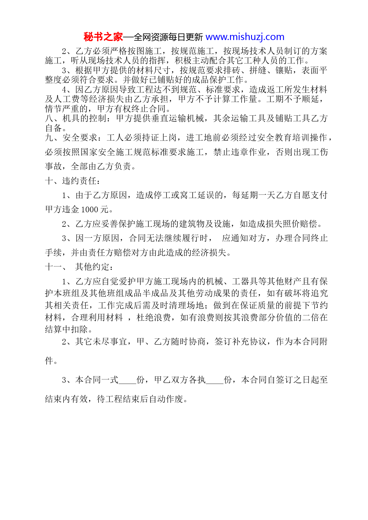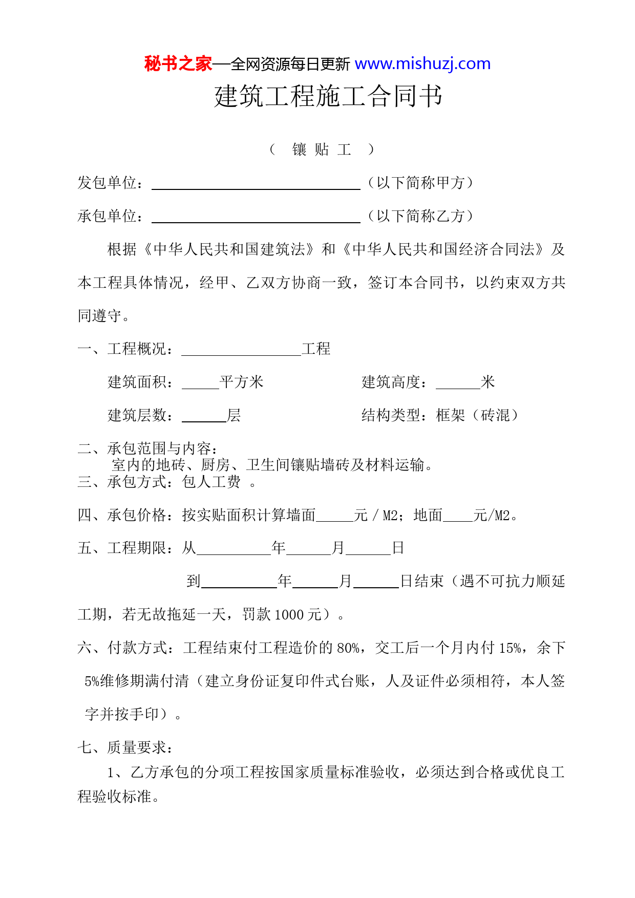 秘书之家—全网资源每日更新www.mishuzj.com建筑工程施工合同书(镶贴工)发包单位:(以下简称甲方)承包单位:(以下简称乙方)根据《中华人民共和国建筑法》和《中华人民共和国经济合同法》及本工程具体情况,经甲、乙双方协商一致,签订本合同书,以约束双方共同遵守。一、工程概况:工程建筑面积:平方米建筑高度:米建筑层数:层结构类型:框架(砖混)二、承包范围与内容:室内的地砖、厨房、卫生间镶贴墙砖及材料运输。三、承包方式:包人工费。四、承包价格:按实贴面积计算墙面元/M2;地面元/M2。五、工程期限:从年月日到年月日结束(遇不可抗力顺延工期,若无故拖延一天,罚款1000元)。六、付款方式:工程结束付工程造价的80%,交工后一个月内付15%,余下5%维修期满付清(建立身份证复印件式台账,人及证件必须相符,本人签字并按手印)。七、质量要求:1、乙方承包的分项工程按国家质量标准验收,必须达到合格或优良工程验收标准。秘书之家—全网资源每日更新www.mishuzj.com2、乙方必须严格按图施工,按规范施工,按现场技术人员制订的方案施工,听从现场技术人员的指挥,积极主动配合其它工种人员的工作。3、根据甲方提供的材料尺寸,按规范要求排砖、拼缝、镶贴,表面平整度必须符合要求。并做好已铺贴好的成品保护工作。4、因乙方原因导致工程达不到规范、标准要求,造成返工所发生材料及人工费等经济损失由乙方承担,甲方不予计算工作量。工期不予顺延,情节严重的,甲方有权终止合同。八、机具的控制:甲方提供垂直运输机械,其余运输工具及铺贴工具乙方自备。九、安全要求:工人必须持证上岗,进工地前必须经过安全教育培训操作,必须按照国家安全施工规范标准要求施工,禁止违章作业,否则出现工伤事故,全部由乙方负责。十、违约责任:1、由于乙方原因,造成停工或窝工延误的,每延期一天乙方自愿支付甲方违金1000元。2、乙方应妥善保护施工现场的建筑物及设施,如造成损失照价赔偿。3、因一方原因,合同无法继续履行时,应通知对方,办理合同终止手续,并由责任方赔偿对方由此造成的经济损失。十一、其他约定:1、乙方应自觉爱护甲方施工现场内的机械、工器具等其他财产且有保护本班组及其他班组成品半成品及其他劳动成果的责任,如有破坏将追究其相关责任,工作完成后需及时清理场地;做到在保证质量的前提下节约材料,合理利用材料,杜绝浪费,如有浪费则按其浪费部分价值的二倍在结算中扣除。2、其它未尽事宜,甲、乙方随时协商,签订补充协议,作为本合同附件。3、本合同一式份,甲乙双方各执份,本合同自签订之日起至结束内有效,待工程结束后自动作废。秘书之家—全网资源每日更新www.mishuzj.com甲方:乙方:法定代表人或委托人:法定代表人或委托人:年月日年月日