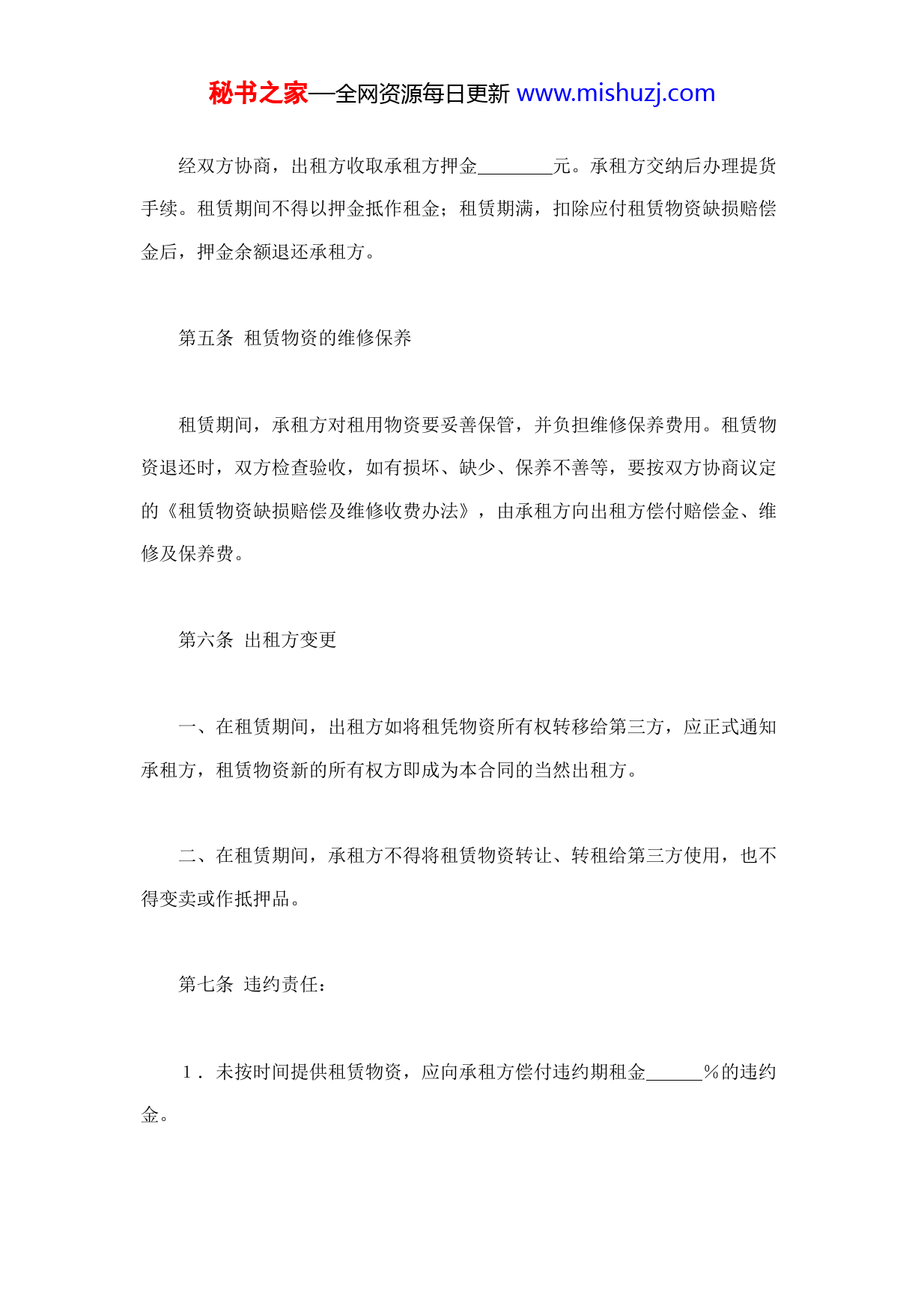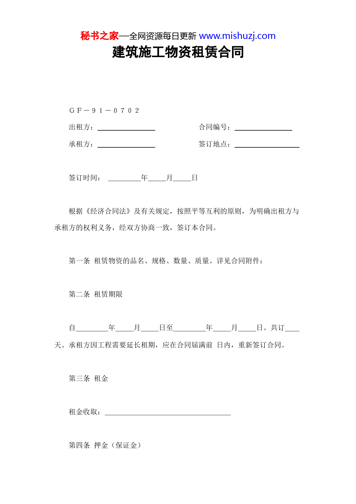 秘书之家—全网资源每日更新www.mishuzj.com建筑施工物资租赁合同GF-91-0702合同编号:出租方:签订地点:承租方:签订时间:年月日根据《经济合同法》及有关规定,按照平等互利的原则,为明确出租方与承租方的权利义务,经双方协商一致,签订本合同。第一条租赁物资的品名、规格、数量、质量。详见合同附件:第二条租赁期限自年月日至年月日。共订天。承租方因工程需要延长租期,应在合同届满前日内,重新签订合同。第三条租金租金收取:第四条押金(保证金)秘书之家—全网资源每日更新www.mishuzj.com经双方协商,出租方收取承租方押金元。承租方交纳后办理提货手续。租赁期间不得以押金抵作租金;租赁期满,扣除应付租赁物资缺损赔偿金后,押金余额退还承租方。第五条租赁物资的维修保养租赁期间,承租方对租用物资要妥善保管,并负担维修保养费用。租赁物资退还时,双方检查验收,如有损坏、缺少、保养不善等,要按双方协商议定的《租赁物资缺损赔偿及维修收费办法》,由承租方向出租方偿付赔偿金、维修及保养费。第六条出租方变更一、在租赁期间,出租方如将租凭物资所有权转移给第三方,应正式通知承租方,租赁物资新的所有权方即成为本合同的当然出租方。二、在租赁期间,承租方不得将租赁物资转让、转租给第三方使用,也不得变卖或作抵押品。第七条违约责任:1.未按时间提供租赁物资,应向承租方偿付违约期租金%的违约金。秘书之家—全网资源每日更新www.mishuzj.com2.未按质量提供租赁物资,应向承租方偿付违约期租金%的违约金。3.未按数量提供租赁物资,致使承租方不能如期正常使用的,除按规定如数补齐外,还应偿付违约期租金%的违约金。4.其它违约行为。二、承租方违约责任:1.不按时交纳租金,应向出租方偿付违约期租金%违约金。2.逾期不还租赁物资,应向出租方偿付违约期租金%的违约金。3.如有转让、转租或将租赁物资变卖、抵押等行为,除出租方有权解除合同,限期如数收回租赁物资外,承租方还应向出租方偿付违约期租金%的违约金。4.其它违约行为。第八条争议的解决方式第九条其它约定事项第十条本合同一式份,合同双方各执份。本合同附件份都秘书之家—全网资源每日更新www.mishuzj.com是合同的组成部分,与合同具有同等效力。出租方(章)承租方(章)单位地址:单位地址:法定代表人:法定代表人:(或委托代理人)(或委托代理人)电话:电话:邮政编码:邮政编码:开户行:开户行:帐号:帐号: