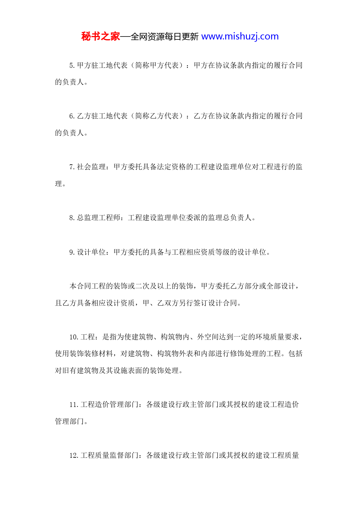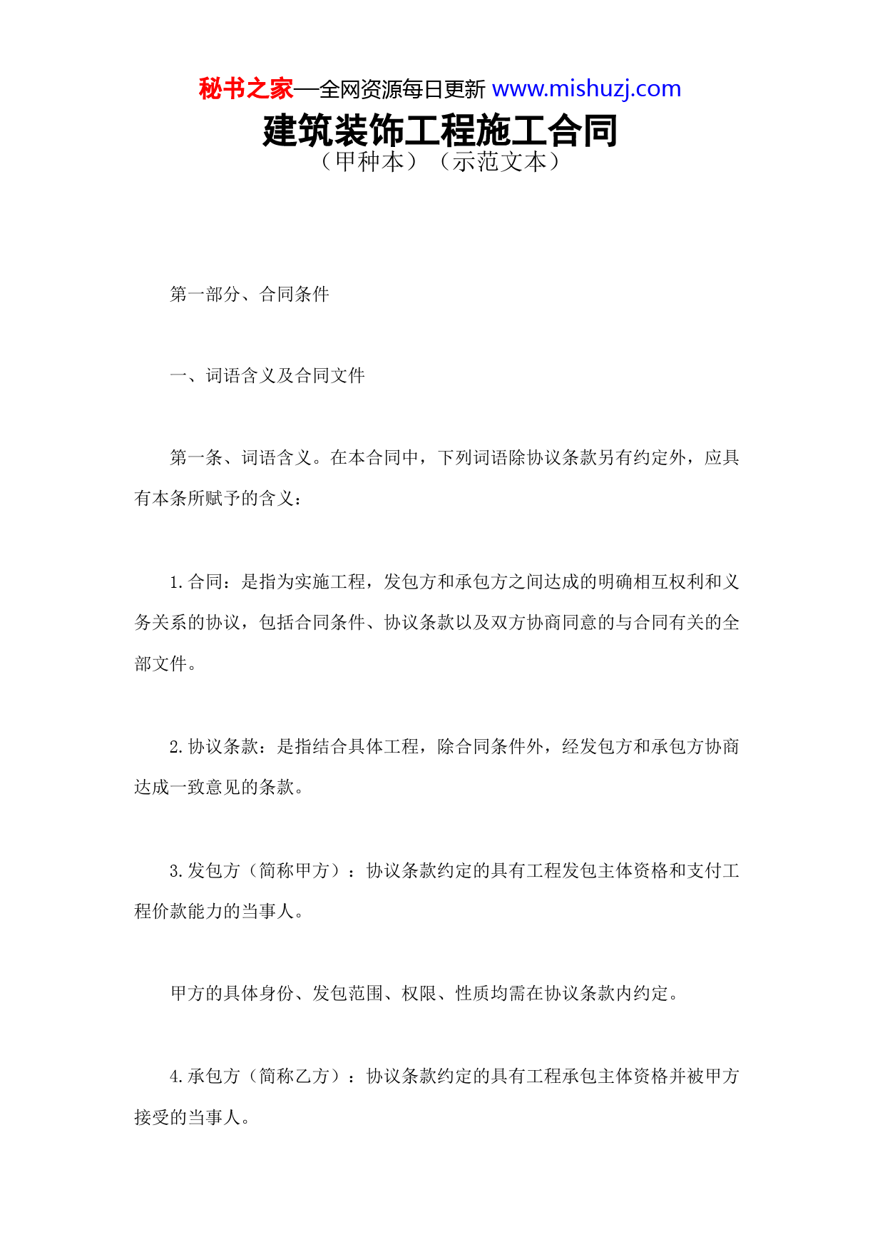 秘书之家—全网资源每日更新www.mishuzj.com建筑装饰工程施工合同(甲种本)(示范文本)第一部分、合同条件一、词语含义及合同文件第一条、词语含义。在本合同中,下列词语除协议条款另有约定外,应具有本条所赋予的含义:1.合同:是指为实施工程,发包方和承包方之间达成的明确相互权利和义务关系的协议,包括合同条件、协议条款以及双方协商同意的与合同有关的全部文件。2.协议条款:是指结合具体工程,除合同条件外,经发包方和承包方协商达成一致意见的条款。3.发包方(简称甲方):协议条款约定的具有工程发包主体资格和支付工程价款能力的当事人。甲方的具体身份、发包范围、权限、性质均需在协议条款内约定。4.承包方(简称乙方):协议条款约定的具有工程承包主体资格并被甲方接受的当事人。秘书之家—全网资源每日更新www.mishuzj.com5.甲方驻工地代表(简称甲方代表):甲方在协议条款内指定的履行合同的负责人。6.乙方驻工地代表(简称乙方代表):乙方在协议条款内指定的履行合同的负责人。7.社会监理:甲方委托具备法定资格的工程建设监理单位对工程进行的监理。8.总监理工程师:工程建设监理单位委派的监理总负责人。9.设计单位:甲方委托的具备与工程相应资质等级的设计单位。本合同工程的装饰或二次及以上的装饰,甲方委托乙方部分或全部设计,且乙方具备相应设计资质,甲、乙双方另行签订设计合同。10.工程:是指为使建筑物、构筑物内、外空间达到一定的环境质量要求,使用装饰装修材料,对建筑物、构筑物外表和内部进行修饰处理的工程。包括对旧有建筑物及其设施表面的装饰处理。11.工程造价管理部门:各级建设行政主管部门或其授权的建设工程造价管理部门。12.工程质量监督部门:各级建设行政主管部门或其授权的建设工程质量秘书之家—全网资源每日更新www.mishuzj.com监督机构。13.合同价款:甲、乙双方在协议条款内约定的、用以支付乙方按照合同要求完成全部工程内容的价款总额。招标工程的合同价款为中标价格。14.追加合同价款:在施工中发生的、经甲方确认后按计算合同价款的方法增加的合同价款。15.费用:甲方在合同价款之外需要直接支付的开支或乙方应承担的开支。16.工期:协议条款约定的、按总日历天数(包括一切法定节假日在内)计算的工期天数。17.开工日期:协议条款约定的绝对或相对的工程开工日期。18.竣工日期:协议条款约定的绝对或相对的工程竣工日期。19.图纸:由甲方提供或乙方提供经甲方代表批准,乙方用以施工的所有图纸(包括配套说明和有关资料)。20.分段或分部工程:协议条款约定构成全部工程的任何分段或分部工程。21.施工场地:由甲方提供,并在协议条款内约定,供乙方施工、操作、运输、堆放材料的场地及乙方施工涉及的周围场地(包括一切通道)。秘书之家—全网资源每日更新www.mishuzj.com22.施工设备和设施:按协议条款约定,由甲方提供给乙方施工和管理使用的设备和设施。23.工程量清单:发包方在招标文件中提供的、按法定的工程量计算方法(规则)计算的全部工程的分部分项工程量明细清单。24.书面形式:根据合同发生的手写、打印、复写、印刷的各种通知、证明、证书、签证、协议、备忘录、函件及经过确认的会议纪要、电报、电传等。25.不可抗力:指因战争、动乱、空中飞行物坠落或其它非甲乙方责任造成的爆炸、火灾,以及协议条款约定的自然灾害等。第二条、合同文件及解释顺序。合同文件应能互相解释,互为说明。除合同另有约定外,其组成和解释顺序如下:1.协议条款;2.合同条件;3.洽商、变更等明确双方权利、义务的纪要、协议;4.建设工程施工合同;5.监理合同;秘书之家—全网资源每日更新www.mishuzj.com6.招标发包工程的招标文件、投标书和中标通知书;7.工程量清单或确定工程造价的工程预算书和图纸;8.标准、规范和其它有关的技术经济资料、要求;当合同文件出现含糊不清或不一致时,由双方协商解决,协商不成时,按协议条款第35条约定的办法解决。第三条、合同文件使用的语言文字、标准和适用法律。合同文件使用汉语或协议条款约定的少数民族语言书写、解释和说明。施工中必须使用协议条款约定的国家标准、规范。没有国家标准、规范时,有行业标准、规范的,使用行业标准、规范;没有国家和行业标准、规范的,使用地方的标准、规范。甲方应按协议条款约定的时间向乙方提供一式两份约定的标准、规范。国内没有相应标准、规范时,乙方应按协议条款约定的时间和要求提出施工工艺,经甲方代表和设计单位批准后执行。甲方要求使用国外标准、规范的,应负责提供中文译本。本条所发生购买、翻译和制定标准、规范的费用,均由甲方承担。适用于合同文件的法律是国家的法律、法规(含地方法规),及协议条款约定的规章。秘书之家—全网资源每日更新www.mishuzj.com第四条、图纸。甲方在开工日期7天之前按协议条款约定的日期和份数,向乙方提供完整的施工图纸。乙方需要超过协议条款双方约定的图纸份数,甲方应代为复制,复制费用由乙方承担。使用国外或境外图纸,不能满足施工需要时,双方在协议条款内约定复制、重新绘制、翻译、购买标准图纸等的责任和费用承担。二、双方一般责任第五条、甲方代表。甲方代表按照以下要求,行使合同约定的