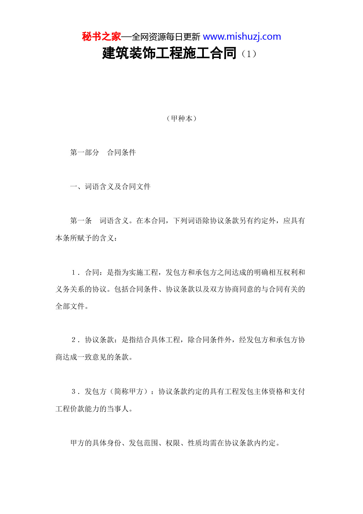 秘书之家—全网资源每日更新www.mishuzj.com建筑装饰工程施工合同(1)(甲种本)第一部分合同条件一、词语含义及合同文件第一条词语含义。在本合同,下列词语除协议条款另有约定外,应具有本条所赋予的含义:1.合同:是指为实施工程,发包方和承包方之间达成的明确相互权利和义务关系的协议。包括合同条件、协议条款以及双方协商同意的与合同有关的全部文件。2.协议条款:是指结合具体工程,除合同条件外,经发包方和承包方协商达成一致意见的条款。3.发包方(简称甲方):协议条款约定的具有工程发包主体资格和支付工程价款能力的当事人。甲方的具体身份、发包范围、权限、性质均需在协议条款内约定。秘书之家—全网资源每日更新www.mishuzj.com4.承包方(简称乙方):协议条款约定的具有工程承包主体资料并被甲方接受的当事人。5.甲方驻工地代表(简称甲方代表):甲方在协议条款内指定的履行合同的负责人。6.乙方驻工地代表(称简乙方代表):乙方在协议条款内指定的履行合同的负责人。7.社会监理:甲方委托具备法定资格的工程建设监理单位对工程进行的监理。8.总监理工程师:工程建设监理单位委派的监理总负责人。9.设计单位:甲方委托的具备与工程相应资质等级的设计单位。本合同工程的装饰或二次及以上的装饰,甲方委托乙方部分或全部设计,且乙方具备相应设计资质,甲、乙双方另行签订设计合同。10.工程:是指为使建筑物、构筑物内、外空间达到一定的环境质量要求,使用装饰装修材料,对建筑物、构筑物外表和内部进行修饰处理的工程。包括对旧有建筑物及其设施表面的装饰处理。11.工程造价管理部门:各级建设行政主管部门或其授权的建设工程造价管理部门。秘书之家—全网资源每日更新www.mishuzj.com12.工程质量监督部门:各级建设行政主管部门或其授权的建设工程质量监督机构。13.合同价款:甲、乙双方在协议条款内约定的、用以支付乙方按照合同要求完成全部工程内容的价款总额。招标工程的合同价款为中标价格。14.追加合同价款:在施工中发生的、经甲方确认后按计算合同价款的方法增加的合同价款。15.费用:甲方在合同价款之外需要直接支付的开支或乙方应承担的开支。16.工期:协议条款约定的、按总日历天数(包括一切法定节假日在内)计算的工期天数。17.开工日期:协议条款约定的绝对或相对的工程开工日期。18.竣工日期:协议条款约定的绝对或相对的工程竣工日期。19.图纸:由甲方提供或乙方提供经甲方代表批准,乙方用以施工的所有图纸(包括配套说明和有关资料)。20.分段或分部工程:协议条款约定构成全部工程的任何分段或分部工程。秘书之家—全网资源每日更新www.mishuzj.com21.施工场地:由甲方提供,并在协议条款内约定,供乙方施工、操作、运输、堆放材料的场地及乙方施工涉及的周围场地(包括一切通道)。22.施工设备和设施:按协议条款约定,由甲方提供给乙方施工和管理使用的设备或设施。23.工程量清单:发包方在招标文件中提供的、按法定的工程量计算方法(规则)计算的全部工程的分部分项工程量明细清单。24.书面形式:根据合同发生的手写、打印、复写、印刷的各种通知、证明、证书、签证、协议、备忘录、函件及经过确认的会议纪要、电报、电传等。25.不可抗力:指因战争、动乱、空中飞行物坠落或其它非甲乙方责任造成的瀑炸、火灾,以及协议条款约定的自然灾害等。第二条合同文件及解释顺序。合同文件应能互相解释,互为说明。除合同另有约定外,其组成和解释顺序如下:1.协议条款;2.合同条件;3.洽商、变更等明确双方权利、义务的纪要、协议;4.建设工程施工合同;5.监理合同;秘书之家—全网资源每日更新www.mishuzj.com6.招标发包工程的招标文件、投标书和中标通知书;7.工程量清单或确定工程造价的工程预算书和图纸;8.标准、规范和其它有关的技术经济资料、要求;当合同文件出现含糊不清或不一致时,由双方协商解释,协商不成时,按协议条款第35条约定的办法解决。第三条合同文件使用的语言文字、标准和适用法律。合同文件使用汉语或协议条款约定的少数民族语言书写、解释和说明。施工中必须使用协议条款约定的国家标准、规范。没有国家标准、规范时,有行业标准、规范的,使用行业标准、规范;没有国家和行业标准、规范的,使用地方的标准、规范。甲方应按协议条款约定的时间向乙方提供一式两份约定的标准、规范。国内没有相应标准、规范时,乙方应按协议条款约定的时间和要求提出施工工艺,经甲方代表和设计单位批准后执行。甲方要求使用国外标准、规范的,应负责提供中文译本。本条所发生购买、翻译和制定标准、规范的费用,均由甲方承担。适用于合同文件的法律是国家的法律、法规(含地方法规),及协议条款约定的规章。第四条图纸。甲方在开工日期7天之前按协议条款约定的日期和份数,向乙方提供完整的施工图纸。乙方需要超过协议条款双方约定的图纸份数,甲秘书之家—全网资源每日更新www.mishuzj.com方应代为复制,复制费用由乙方承担。使用国外或境外图纸,不能满足施工需要时,双方在协议条款内约定复制、重新绘制、翻译、购买标准图纸等的责任和费用承担。二、双方一般责任第五条甲方代表。甲方代表按照以下要求,行使合同约定的权利,履行合同约定的义
