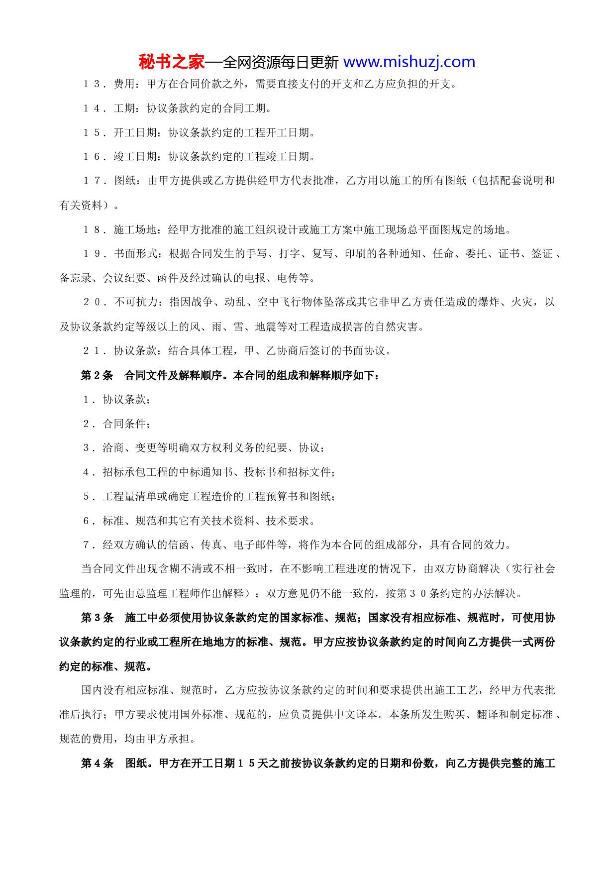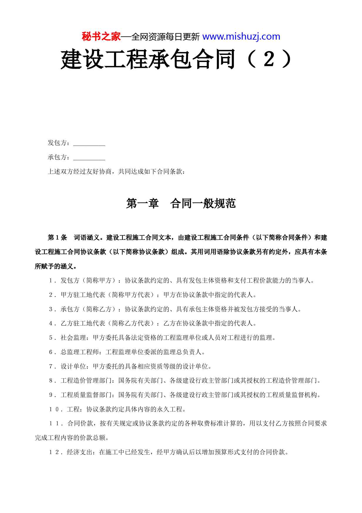 秘书之家—全网资源每日更新www.mishuzj.com建设工程承包合同(2)发包方:_____承包方:_____上述双方经过友好协商,共同达成如下合同条款:第一章合同一般规范第1条词语涵义。建设工程施工合同文本,由建设工程施工合同条件(以下简称合同条件)和建设工程施工合同协议条款(以下简称协议条款)组成。其用词用语除协议条款另有约定外,应具有本条所赋予的涵义。1.发包方(简称甲方):协议条款约定的、具有发包主体资格和支付工程价款能力的当事人。2.甲方驻工地代表(简称甲方代表):甲方在协议条款中指定的代表人。3.承包方(简称乙方):协议条款约定的、具有承包主体资格并被发包方接受的当事人。4.乙方驻工地代表(简称乙方代表):乙方在协议条款中指定的代表人。5.社会监理:甲方委托具备法定资格的工程监理单位或人员对工程进行的监理。6.总监理工程师:工程监理单位委派的监理总负责人。7.设计单位:甲方委托的具备相应资质等级的设计单位。8.工程造价管理部门:国务院有关部门、各级建设行政主管部门或其授权的工程造价管理部门。9.工程质量监督部门:国务院有关部门、各级建设行政主管部门或其授权的工程质量监督机构。10.工程:协议条款约定具体内容的永久工程。11.合同价款,按有关规定或协议条款约定的各种取费标准计算的,用以支付乙方按照合同要求完成工程内容的价款总额。12.经济支出:在施工中已经发生,经甲方确认后以增加预算形式支付的合同价款。秘书之家—全网资源每日更新www.mishuzj.com13.费用:甲方在合同价款之外,需要直接支付的开支和乙方应负担的开支。14.工期:协议条款约定的合同工期。15.开工日期:协议条款约定的工程开工日期。16.竣工日期:协议条款约定的工程竣工日期。17.图纸:由甲方提供或乙方提供经甲方代表批准,乙方用以施工的所有图纸(包括配套说明和有关资料)。18.施工场地:经甲方批准的施工组织设计或施工方案中施工现场总平面图规定的场地。19.书面形式:根据合同发生的手写、打字、复写、印刷的各种通知、任命、委托、证书、签证、备忘录、会议纪要、函件及经过确认的电报、电传等。20.不可抗力:指因战争、动乱、空中飞行物体坠落或其它非甲乙方责任造成的爆炸、火灾,以及协议条款约定等级以上的风、雨、雪、地震等对工程造成损害的自然灾害。21.协议条款:结合具体工程,甲、乙协商后签订的书面协议。第2条合同文件及解释顺序。本合同的组成和解释顺序如下:1.协议条款;2.合同条件;3.洽商、变更等明确双方权利义务的纪要、协议;4.招标承包工程的中标通知书、投标书和招标文件;5.工程量清单或确定工程造价的工程预算书和图纸;6.标准、规范和其它有关技术资料、技术要求。7.经双方确认的信函、传真、电子邮件等,将作为本合同的组成部分,具有合同的效力。当合同文件出现含糊不清或不相一致时,在不影响工程进度的情况下,由双方协商解决(实行社会监理的,可先由总监理工程师作出解释);双方意见仍不能一致的,按第30条约定的办法解决。第3条施工中必须使用协议条款约定的国家标准、规范;国家没有相应标准、规范时,可使用协议条款约定的行业或工程所在地地方的标准、规范。甲方应按协议条款约定的时间向乙方提供一式两份约定的标准、规范。国内没有相应标准、规范时,乙方应按协议条款约定的时间和要求提供出施工工艺,经甲方代表批准后执行;甲方要求使用国外标准、规范的,应负责提供中文译本。本条所发生购买、翻译和制定标准、规范的费用,均由甲方承担。第4条图纸。甲方在开工日期15天之前按协议条款约定的日期和份数,向乙方提供完整的施工秘书之家—全网资源每日更新www.mishuzj.com图纸,乙方按协议条款要求做好图纸保密工作。需要特殊保密的措施费用由甲方承担。乙方需要增加图纸份数,甲方应代为复制,复制费用由乙方承担。第二章双方一般责任第5条甲方代表。甲方任命驻施工现场的代表,按照以下要求,行使合同约定的权力,履行合同约定的职责:1.甲方代表可委派有关具体管理人员,承担自己部分权力和职责,并可在任何时候撤回这种委派。委派和撤回均应提前5天通知乙方。2.甲方代表的指令、通知由其本人签字后,以书面形式交给乙方代表,乙方代表在回执上签署姓名和收到时间后生效。确有必要时,甲方代表可发出口头指令,并在48小时内给予书面确认,乙方对甲方代表的指令应予执行。甲方代表不能及时给予书面确认,乙方应于甲方代表发出口头指令后3天内提出书面确认要求,甲方代表在乙方提出确认要求后3天内不予答复,应视为乙方要求已被确认。乙方认为甲方代表指令不合一,应在收到指令后24小时内提出书面电告,甲方代表在收到乙方电告后24小时内作出修改指令或继续执行原指令的决定,以书面形式通知乙方。紧急情况下,甲方代表要求乙方立即执行的指令或乙方虽有异议,但甲方代表决定仍继续执行的指令,乙方应予执行。因指令错误发生的费用和给乙方造成的损失由甲方承担,延误的工期相应顺延。3.甲方代表按合同约定,及时向乙方提供所需指令、批准、图纸并履行其它约定的义务,否则乙方在约定时间后24小时将具体要求、需要的理由和迟误的后果通知甲方代表,甲方代表收到通知后48小时内不予答复,应承担由此造成的经济支出