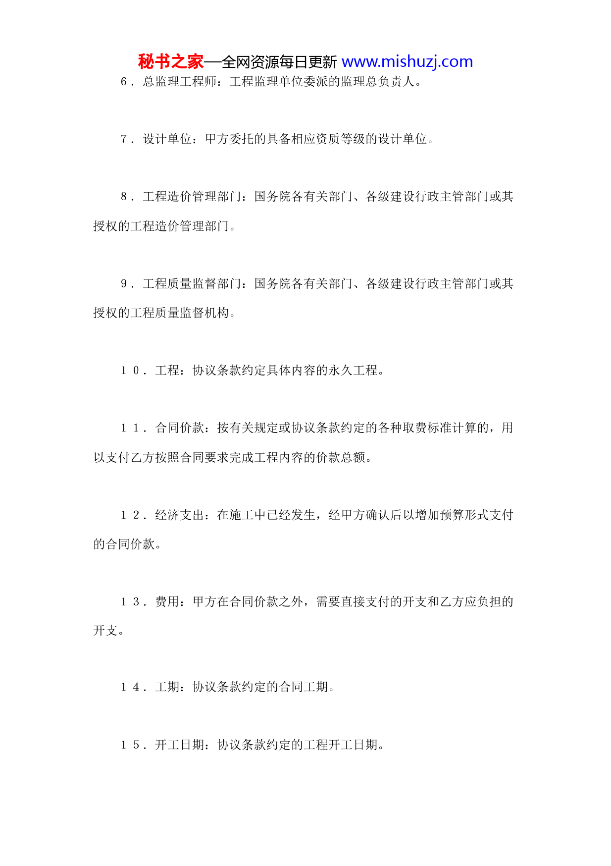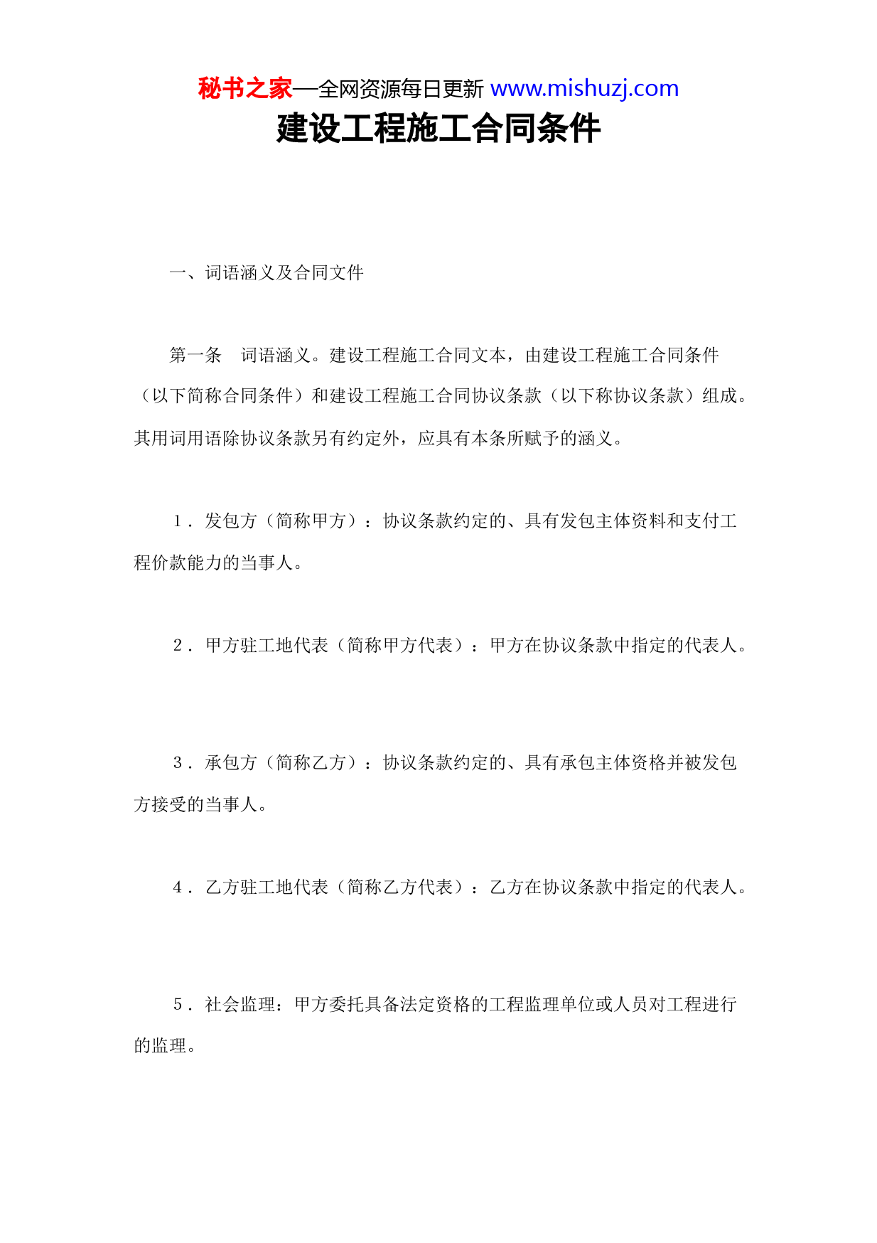 秘书之家—全网资源每日更新www.mishuzj.com建设工程施工合同条件一、词语涵义及合同文件第一条词语涵义。建设工程施工合同文本,由建设工程施工合同条件(以下简称合同条件)和建设工程施工合同协议条款(以下称协议条款)组成。其用词用语除协议条款另有约定外,应具有本条所赋予的涵义。1.发包方(简称甲方):协议条款约定的、具有发包主体资料和支付工程价款能力的当事人。2.甲方驻工地代表(简称甲方代表):甲方在协议条款中指定的代表人。3.承包方(简称乙方):协议条款约定的、具有承包主体资格并被发包方接受的当事人。4.乙方驻工地代表(简称乙方代表):乙方在协议条款中指定的代表人。5.社会监理:甲方委托具备法定资格的工程监理单位或人员对工程进行的监理。秘书之家—全网资源每日更新www.mishuzj.com6.总监理工程师:工程监理单位委派的监理总负责人。7.设计单位:甲方委托的具备相应资质等级的设计单位。8.工程造价管理部门:国务院各有关部门、各级建设行政主管部门或其授权的工程造价管理部门。9.工程质量监督部门:国务院各有关部门、各级建设行政主管部门或其授权的工程质量监督机构。10.工程:协议条款约定具体内容的永久工程。11.合同价款:按有关规定或协议条款约定的各种取费标准计算的,用以支付乙方按照合同要求完成工程内容的价款总额。12.经济支出:在施工中已经发生,经甲方确认后以增加预算形式支付的合同价款。13.费用:甲方在合同价款之外,需要直接支付的开支和乙方应负担的开支。14.工期:协议条款约定的合同工期。15.开工日期:协议条款约定的工程开工日期。秘书之家—全网资源每日更新www.mishuzj.com16.竣工日期:协议条款约定的工程竣工日期。17.图纸:由甲方提供或乙方提供经甲方代表批准,乙方用以施工的所有图纸(包括配套说明和有关资料)。18.施工现场:经甲方批准的施工组织设计或施工方案中施工现场总平面图规定的场地。19.书面形式:根据合同发生的手写、打字、复写、印刷的各种通知、任命、委托、证书、签证、备忘录、会议纪要、函件及经过确认的电报、电传等。20.不可抗力:指因战争、动乱、空中飞行物体坠落或其他非甲乙方责任造成的爆炸、火灾,以及协议条款约定等级以上的风、雨、雪、震等对工程造成损害的自然灾害。21.协议条款:结合具体工程,甲、乙方协商后签订的书面协议。第二条合同文件及解释顺序合同文件应能互相解释,互为说明。除合同另有约定外,其组成和解释顺序如下:1.协议条款;2.合同条件;秘书之家—全网资源每日更新www.mishuzj.com3.洽商、变更等明确双方权利义务的纪要、协议;4.招标承包工程的中标通知书、投标书和招标文件;5.工程量清单或确定工程造价的工程预算书和图纸;6.标准、规范和其他有关技术资料、技术要求;7.双方确认的往来信函、传真、电子邮件。当合同文件出现含糊不清或不相一致时,在不影响工程进度的情况下,由双方协商解决(实行社会监理的,可先由总监理工程师作出解释);双方意见仍不能一致的,按第30条约定的办法解决。第三条合同文件使用的语言文字、标准和适用法律。合同文件使用汉语或协议条款约定的少数民族语言书写和解释、说明。适用于合同文件的法律是国家的法律、法规及协议条款约定的部门规章或工程所在地的地方法规。施工中必须使用协议条款约定的国家标准、规范;国家没有相应标准、规范时,可使用协议条款约定的专业或工程所在地地方的标准、规范。甲方应按协议条款约定的时间向乙方提供一式两份约定的标准、规范。国内没有相应标准、规范时,乙方应按协议条款约定的时间和要求提出施工工艺,经甲方代表批准后执行;甲方要求使用国外标准、规范的,应负责提供中文译本。本条所发生购买、翻译和制定标准、规范的费用,均由甲方承担。秘书之家—全网资源每日更新www.mishuzj.com第四条图纸。甲方在开工日期15天之前按协议条款约定的日期和份数,向乙方提供完整的施工图纸,乙方按协议条款要求做好图纸保密工作。需要特殊保密的措施费用由甲方承担。乙方需要增加图纸份数,甲方应代为复制,复制费用由乙方承担。双方一般责任第五条甲方代表甲方任命驻施工现场的代表,按照以下要求,行使合同约定的权力,履行合同约定的职责:1.甲方代表可委派有关具体管理人员,承担自己部分权力和职责,并可在任何时候撤回这种派。委派和撤回均应提前5天通知乙方。2.甲方代表的指令、通知由其本人签字后,以书面形成交给乙方代表,乙方代表在回执是签署姓名和收到时间后生效。确有必要时,甲方代表可发出口头指令,并在48小时内给予书面确认,乙方对甲方代表的指令应予执行。甲方代表不能及时给予书面确认,乙方应于甲方代表发出口头指令后3天内提出书面确认要求,甲方代表在乙方提出确认要求后3天内不予答复,应视为乙方要求已被确认。乙方认为甲方代表指令不合理,应在收到指令后24小时内提出书面申告,甲方代表在收到乙方申告后24小时内作出修改指令或继续执行原指令的决定,以书面形式通知乙方。紧急情况下,甲方代表要求乙方立即执行的指令或乙方虽有异议,但甲方代表决定仍继续执行的指令,乙方应予执行。因指令错误发生的费用和给乙方造成的损失由甲方承担,延误的工期相应秘书之家