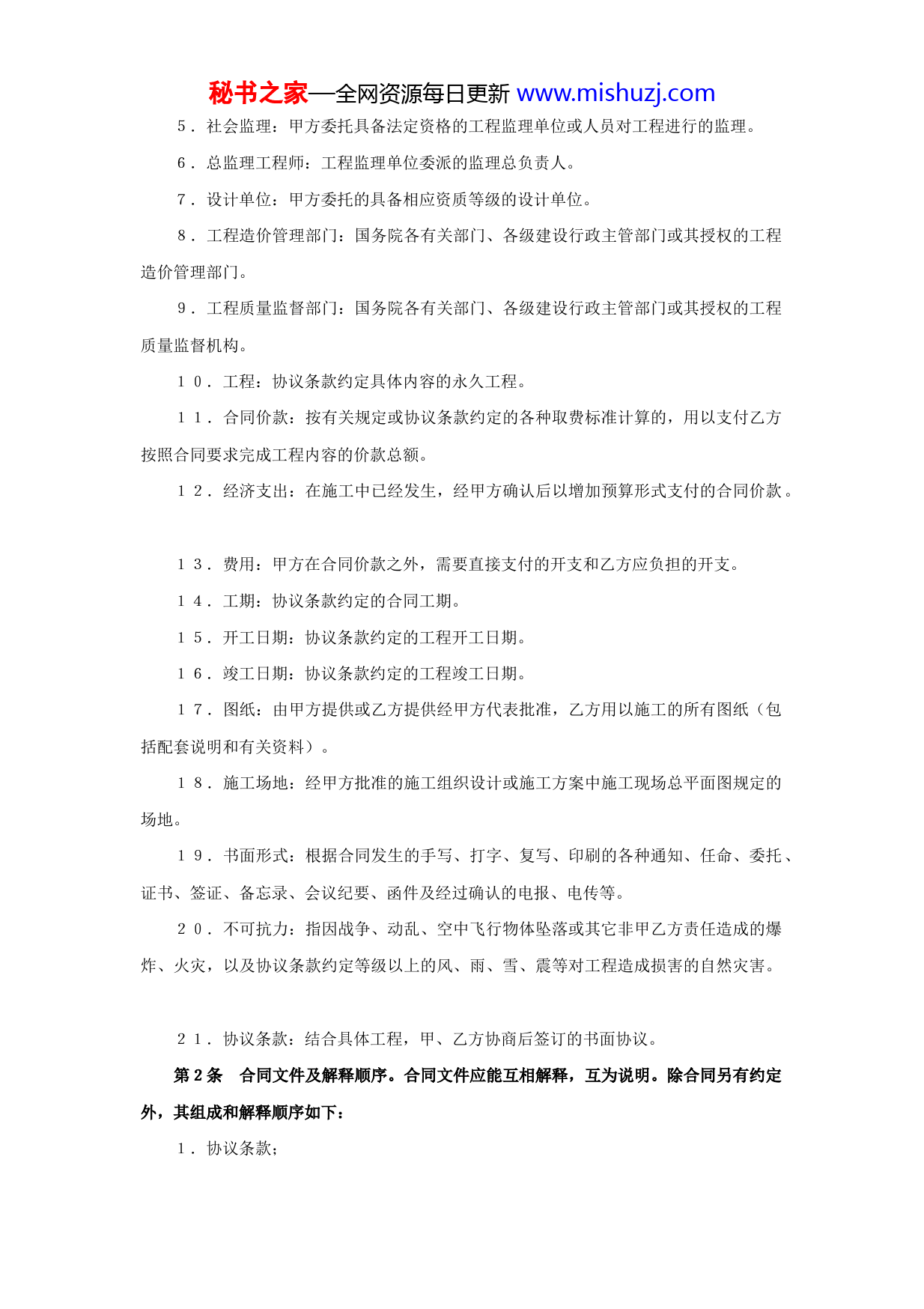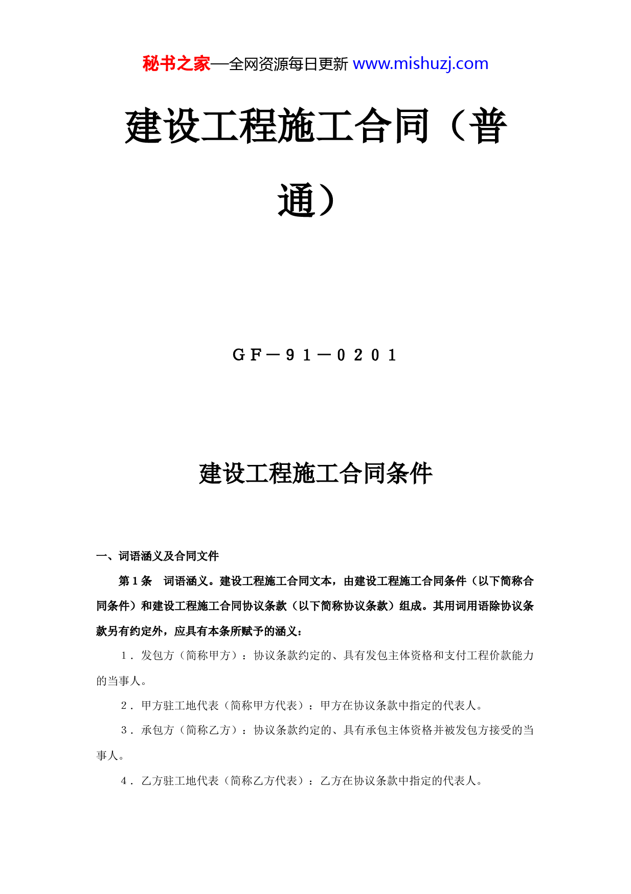 秘书之家—全网资源每日更新www.mishuzj.com建设工程施工合同(普通)GF-91-0201建设工程施工合同条件一、词语涵义及合同文件第1条词语涵义。建设工程施工合同文本,由建设工程施工合同条件(以下简称合同条件)和建设工程施工合同协议条款(以下简称协议条款)组成。其用词用语除协议条款另有约定外,应具有本条所赋予的涵义:1.发包方(简称甲方):协议条款约定的、具有发包主体资格和支付工程价款能力的当事人。2.甲方驻工地代表(简称甲方代表):甲方在协议条款中指定的代表人。3.承包方(简称乙方):协议条款约定的、具有承包主体资格并被发包方接受的当事人。4.乙方驻工地代表(简称乙方代表):乙方在协议条款中指定的代表人。秘书之家—全网资源每日更新www.mishuzj.com5.社会监理:甲方委托具备法定资格的工程监理单位或人员对工程进行的监理。6.总监理工程师:工程监理单位委派的监理总负责人。7.设计单位:甲方委托的具备相应资质等级的设计单位。8.工程造价管理部门:国务院各有关部门、各级建设行政主管部门或其授权的工程造价管理部门。9.工程质量监督部门:国务院各有关部门、各级建设行政主管部门或其授权的工程质量监督机构。10.工程:协议条款约定具体内容的永久工程。11.合同价款:按有关规定或协议条款约定的各种取费标准计算的,用以支付乙方按照合同要求完成工程内容的价款总额。12.经济支出:在施工中已经发生,经甲方确认后以增加预算形式支付的合同价款。13.费用:甲方在合同价款之外,需要直接支付的开支和乙方应负担的开支。14.工期:协议条款约定的合同工期。15.开工日期:协议条款约定的工程开工日期。16.竣工日期:协议条款约定的工程竣工日期。17.图纸:由甲方提供或乙方提供经甲方代表批准,乙方用以施工的所有图纸(包括配套说明和有关资料)。18.施工场地:经甲方批准的施工组织设计或施工方案中施工现场总平面图规定的场地。19.书面形式:根据合同发生的手写、打字、复写、印刷的各种通知、任命、委托、证书、签证、备忘录、会议纪要、函件及经过确认的电报、电传等。20.不可抗力:指因战争、动乱、空中飞行物体坠落或其它非甲乙方责任造成的爆炸、火灾,以及协议条款约定等级以上的风、雨、雪、震等对工程造成损害的自然灾害。21.协议条款:结合具体工程,甲、乙方协商后签订的书面协议。第2条合同文件及解释顺序。合同文件应能互相解释,互为说明。除合同另有约定外,其组成和解释顺序如下:1.协议条款;秘书之家—全网资源每日更新www.mishuzj.com2.合同条件;3.洽商、变更等明确双方权利义务的纪要、协议;4.招标承包工程的中标通知书、投标书和招标文件;5.工程量清单或确定工程造价的工程预算书和图纸;6.标准、规范和其它有关技术资料、技术要求。当合同文件出现含糊不清或不相一致时,在不影响工程进度的情况下,由双方协商解决(实行社会监理的,可先由总监理工程师作出解释);双方意见仍不能一致的,按第30条约定的办法解释。第3条合同文件使用的语言文字,标准和适用法律。合同文件使用汉语或协议条款约定的少数民族语言书写和解释、说明。适用于合同文件的法律是国家的法律、法规,及协议条款约定的部门规章或工程所在地的地方法规。施工必须使用协议条款约定的国家标准、规范;国家没有相应标准、规范时,可使用协议条款约定的行专业或工程所在地地方的标准、规范。甲方应按协议条款约定的时间向乙方提供一式两份约定的标准、规范。国内没有相应标准、规范时,乙方应按协议条款约定的时间和要求提出施工工艺,经甲方代表批准后执行;甲方要求使用国外标准、规范的,应负责提供中文译本。本条所发生购买、翻译和制定标准、规范的费用,均由甲方承担。第4条图纸。甲方在开工日期15天之前按协议条款约定的日期和份数,向乙方提供完整的施工图纸,乙方按协议条款要求做好图纸保密工作。需要特殊保密的措施费用由甲方承担。乙方需要增加图纸份数,甲方应代为复制,复制费用由乙方承担。二、双方一般责任第5条甲方代表。甲方任命驻施工现场的代表,按照以下要求,行使合同约定的权力,履行合同约定的职责:1.甲方代表可委派有关具体管理人员,承担自己部分权力和职责,并可以任何时候撤回这种委派。委派和撤回均应提前5天通知乙方。2.甲方代表的指令、通知由其本人签字后,以书面形式交给乙方代表,乙方代表在回执上签署姓名和收到时间后生效。确有必要时,甲方代表可发出口头指令,并在48小秘书之家—全网资源每日更新www.mishuzj.com时内给予书面确认,乙方对甲方代表的指令应予执行。甲方代表不能及时给予书面确认,乙方应于甲方代表发出口头指令后3天内提出书面确认要求,甲方代表在乙方提出确认要求后3天内不予答复,应视为乙方要求已被确认。乙方认为甲方代表指令不合理,应在收到指令后24小时内提出书面申告,甲方代表在收到乙方申告后24小时内作出修改指令或继续执行原指令的决定,以书面形式通知乙方。紧急情况下,甲方代表要求乙方立即执行的指令或乙方虽有异议,但甲方代表决定仍继续执行的指令,乙方应予执行。因指令错误发生的费用和给乙方造成的损失由甲方承担,延误的工期相应顺延。3.甲方代表按合同约定,及时向乙方提供所需指令