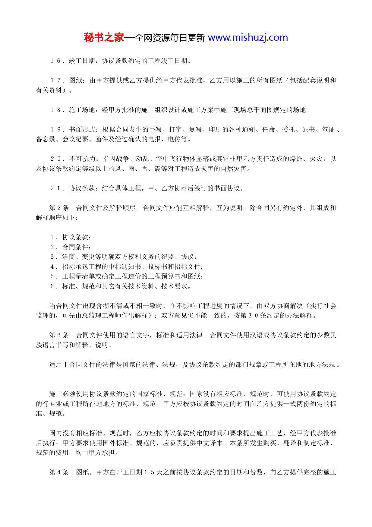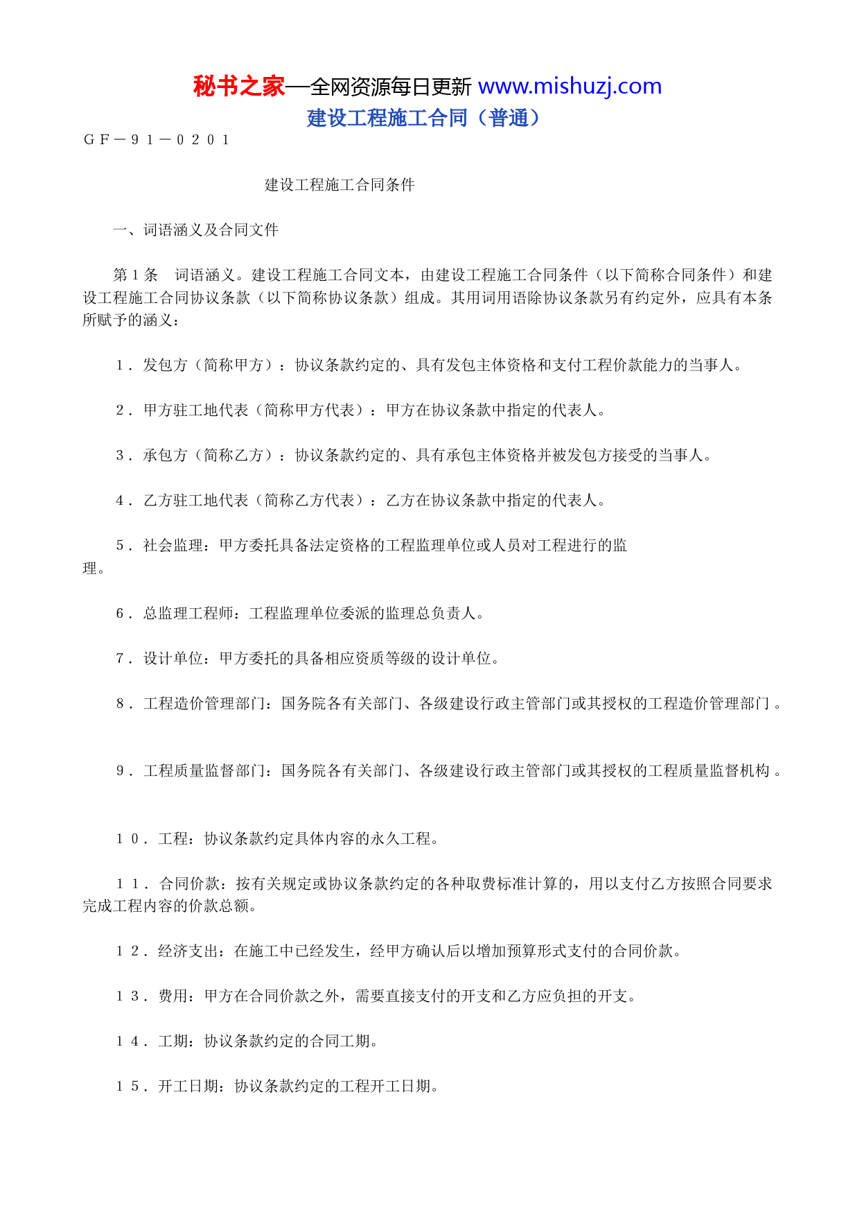 秘书之家—全网资源每日更新www.mishuzj.com建设工程施工合同(普通)GF-91-0201建设工程施工合同条件一、词语涵义及合同文件第1条词语涵义。建设工程施工合同文本,由建设工程施工合同条件(以下简称合同条件)和建设工程施工合同协议条款(以下简称协议条款)组成。其用词用语除协议条款另有约定外,应具有本条所赋予的涵义:1.发包方(简称甲方):协议条款约定的、具有发包主体资格和支付工程价款能力的当事人。2.甲方驻工地代表(简称甲方代表):甲方在协议条款中指定的代表人。3.承包方(简称乙方):协议条款约定的、具有承包主体资格并被发包方接受的当事人。4.乙方驻工地代表(简称乙方代表):乙方在协议条款中指定的代表人。5.社会监理:甲方委托具备法定资格的工程监理单位或人员对工程进行的监理。6.总监理工程师:工程监理单位委派的监理总负责人。7.设计单位:甲方委托的具备相应资质等级的设计单位。8.工程造价管理部门:国务院各有关部门、各级建设行政主管部门或其授权的工程造价管理部门。9.工程质量监督部门:国务院各有关部门、各级建设行政主管部门或其授权的工程质量监督机构。10.工程:协议条款约定具体内容的永久工程。11.合同价款:按有关规定或协议条款约定的各种取费标准计算的,用以支付乙方按照合同要求完成工程内容的价款总额。12.经济支出:在施工中已经发生,经甲方确认后以增加预算形式支付的合同价款。13.费用:甲方在合同价款之外,需要直接支付的开支和乙方应负担的开支。14.工期:协议条款约定的合同工期。15.开工日期:协议条款约定的工程开工日期。秘书之家—全网资源每日更新www.mishuzj.com16.竣工日期:协议条款约定的工程竣工日期。17.图纸:由甲方提供或乙方提供经甲方代表批准,乙方用以施工的所有图纸(包括配套说明和有关资料)。18.施工场地:经甲方批准的施工组织设计或施工方案中施工现场总平面图规定的场地。19.书面形式:根据合同发生的手写、打字、复写、印刷的各种通知、任命、委托、证书、签证、备忘录、会议纪要、函件及经过确认的电报、电传等。20.不可抗力:指因战争、动乱、空中飞行物体坠落或其它非甲乙方责任造成的爆炸、火灾,以及协议条款约定等级以上的风、雨、雪、震等对工程造成损害的自然灾害。21.协议条款:结合具体工程,甲、乙方协商后签订的书面协议。第2条合同文件及解释顺序。合同文件应能互相解释,互为说明。除合同另有约定外,其组成和解释顺序如下:1.协议条款;2.合同条件;3.洽商、变更等明确双方权利义务的纪要、协议;4.招标承包工程的中标通知书、投标书和招标文件;5.工程量清单或确定工程造价的工程预算书和图纸;6.标准、规范和其它有关技术资料、技术要求。当合同文件出现含糊不清或不相一致时,在不影响工程进度的情况下,由双方协商解决(实行社会监理的,可先由总监理工程师作出解释);双方意见仍不能一致的,按第30条约定的办法解释。第3条合同文件使用的语言文字,标准和适用法律。合同文件使用汉语或协议条款约定的少数民族语言书写和解释、说明。适用于合同文件的法律是国家的法律、法规,及协议条款约定的部门规章或工程所在地的地方法规。施工必须使用协议条款约定的国家标准、规范;国家没有相应标准、规范时,可使用协议条款约定的行专业或工程所在地地方的标准、规范。甲方应按协议条款约定的时间向乙方提供一式两份约定的标准、规范。国内没有相应标准、规范时,乙方应按协议条款约定的时间和要求提出施工工艺,经甲方代表批准后执行;甲方要求使用国外标准、规范的,应负责提供中文译本。本条所发生购买、翻译和制定标准、规范的费用,均由甲方承担。第4条图纸。甲方在开工日期15天之前按协议条款约定的日期和份数,向乙方提供完整的施工秘书之家—全网资源每日更新www.mishuzj.com图纸,乙方按协议条款要求做好图纸保密工作。需要特殊保密的措施费用由甲方承担。乙方需要增加图纸份数,甲方应代为复制,复制费用由乙方承担。二、双方一般责任第5条甲方代表。甲方任命驻施工现场的代表,按照以下要求,行使合同约定的权力,履行合同约定的职责:1.甲方代表可委派有关具体管理人员,承担自己部分权力和职责,并可以任何时候撤回这种委派。委派和撤回均应提前5天通知乙方。2.甲方代表的指令、通知由其本人签字后,以书面形式交给乙方代表,乙方代表在回执上签署姓名和收到时间后生效。确有必要时,甲方代表可发出口头指令,并在48小时内给予书面确认,乙方对甲方代表的指令应予执行。甲方代表不能及时给予书面确认,乙方应于甲方代表发出口头指令后3天内提出书面确认要求,甲方代表在乙方提出确认要求后3天内不予答复,应视为乙方要求已被确认。乙方认为甲方代表指令不合理,应在收到指令后24小时内提出书面申告,甲方代表在收到乙方申告后24小时内作出修改指令或继续执行原指令的决定,以书面形式通知乙方。紧急情况下,甲方代表要求乙方立即执行的指令或乙方虽有异议,但甲方代表决定仍继续执行的指令,乙方应予执行。因指令错误发生的费用和给乙方造成的损失由甲方承担,延误的工期相应顺延。3.甲方代表按合同约定,及时向乙方提供所需指令、批准、图纸并履行其它约定的义务,否则