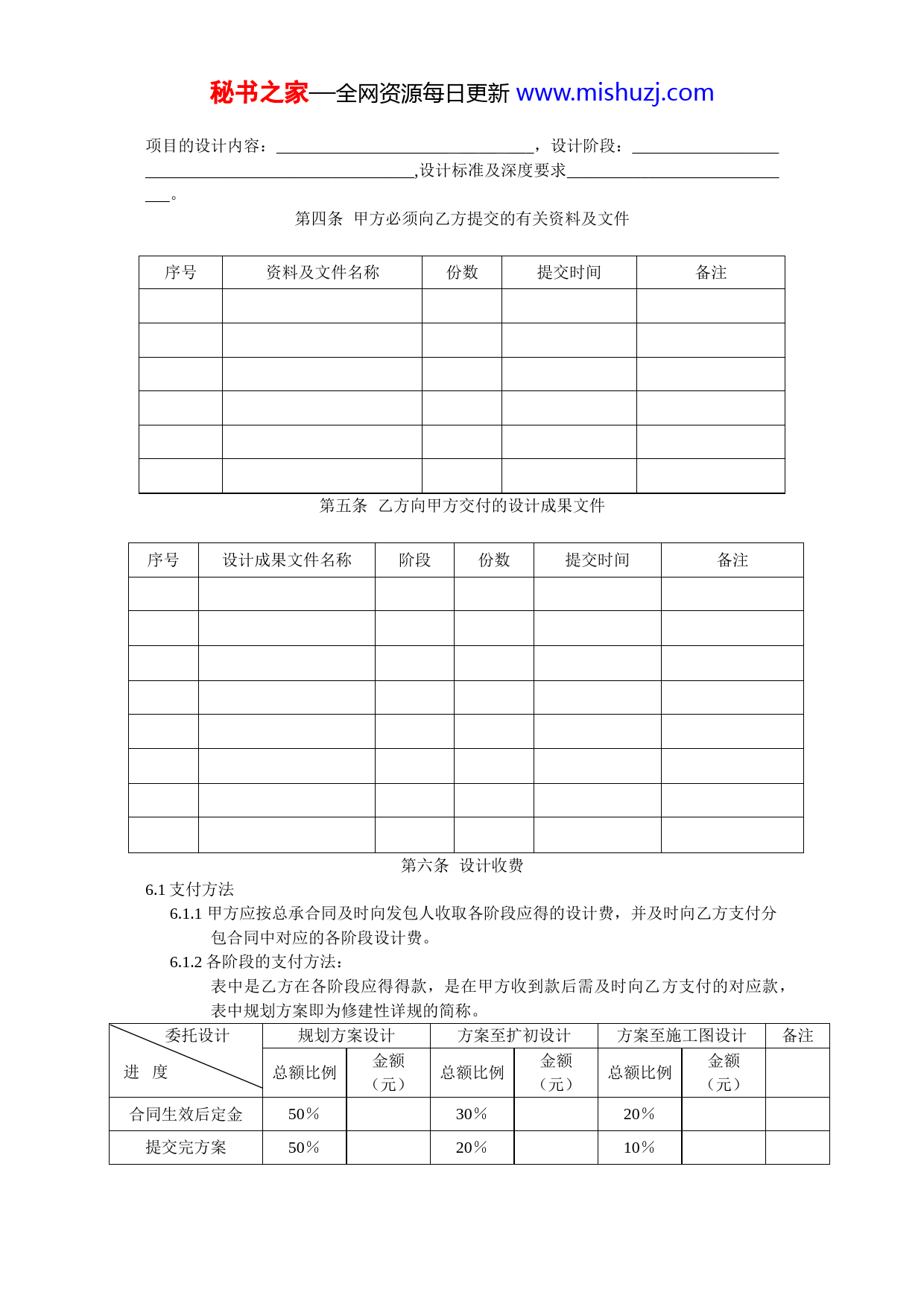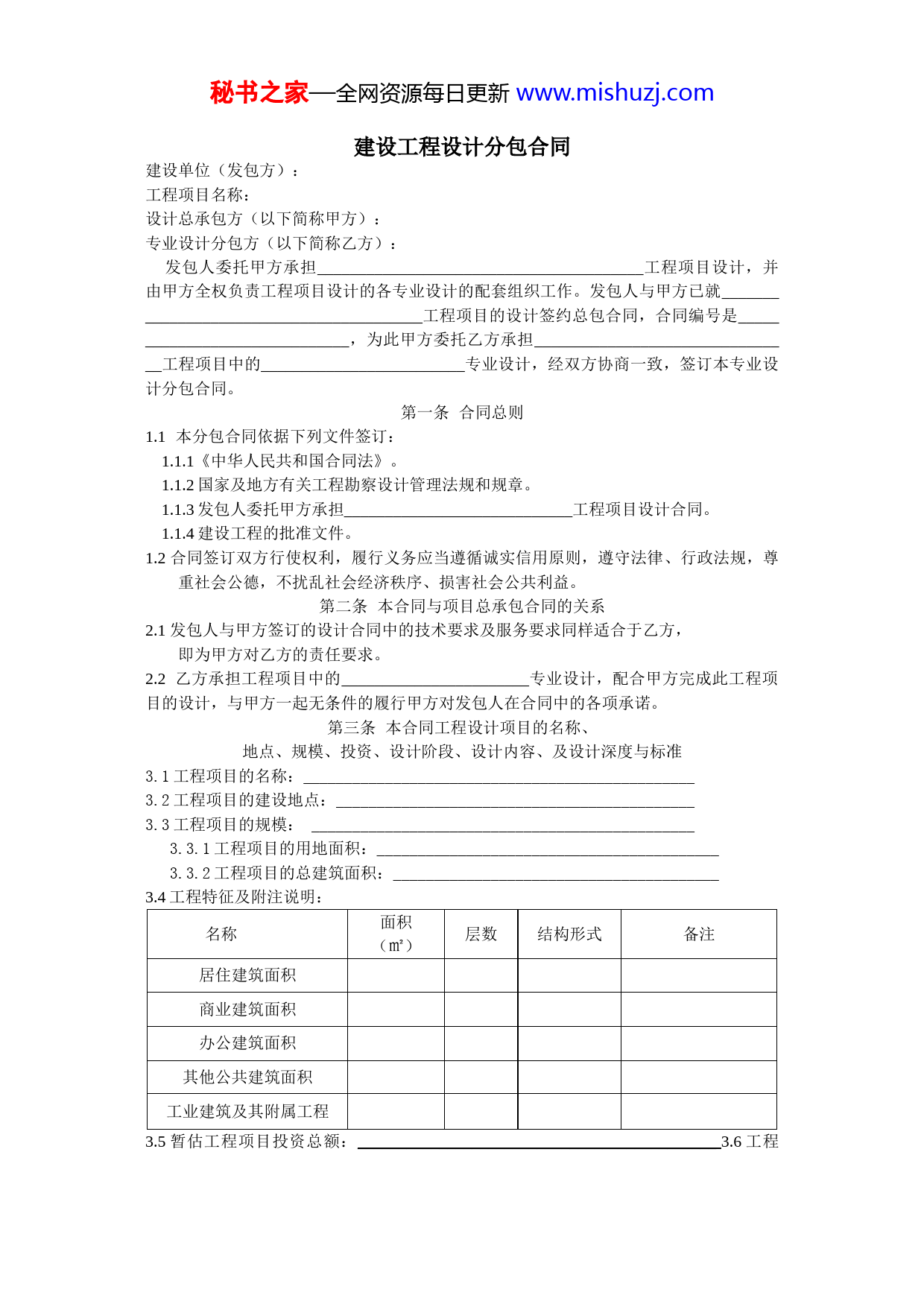 秘书之家—全网资源每日更新www.mishuzj.com建设工程设计分包合同建设单位(发包方):工程项目名称:设计总承包方(以下简称甲方):专业设计分包方(以下简称乙方):发包人委托甲方承担________________________________________工程项目设计,并由甲方全权负责工程项目设计的各专业设计的配套组织工作。发包人与甲方已就_________________________________________工程项目的设计签约总包合同,合同编号是______________________________,为此甲方委托乙方承担________________________________工程项目中的_________________________专业设计,经双方协商一致,签订本专业设计分包合同。第一条合同总则1.1本分包合同依据下列文件签订:1.1.1《中华人民共和国合同法》。1.1.2国家及地方有关工程勘察设计管理法规和规章。1.1.3发包人委托甲方承担____________________________工程项目设计合同。1.1.4建设工程的批准文件。1.2合同签订双方行使权利,履行义务应当遵循诚实信用原则,遵守法律、行政法规,尊重社会公德,不扰乱社会经济秩序、损害社会公共利益。第二条本合同与项目总承包合同的关系2.1发包人与甲方签订的设计合同中的技术要求及服务要求同样适合于乙方,即为甲方对乙方的责任要求。2.2乙方承担工程项目中的_______________________专业设计,配合甲方完成此工程项目的设计,与甲方一起无条件的履行甲方对发包人在合同中的各项承诺。第三条本合同工程设计项目的名称、地点、规模、投资、设计阶段、设计内容、及设计深度与标准3.1工程项目的名称:________________________________________________3.2工程项目的建设地点:____________________________________________3.3工程项目的规模:_______________________________________________3.3.1工程项目的用地面积:__________________________________________3.3.2工程项目的总建筑面积:________________________________________3.4工程特征及附注说明:名称面积层数结构形式备注(㎡)居住建筑面积商业建筑面积办公建筑面积其他公共建筑面积工业建筑及其附属工程3.5暂估工程项目投资总额:____________________________________________3.6工程秘书之家—全网资源每日更新www.mishuzj.com项目的设计内容:____________________________,设计阶段:___________________________________________________,设计标准及深度要求_____________________________。第四条甲方必须向乙方提交的有关资料及文件序号资料及文件名称份数提交时间备注第五条乙方向甲方交付的设计成果文件序号设计成果文件名称阶段份数提交时间备注第六条设计收费6.1支付方法6.1.1甲方应按总承合同及时向发包人收取各阶段应得的设计费,并及时向乙方支付分包合同中对应的各阶段设计费。6.1.2各阶段的支付方法:表中是乙方在各阶段应得得款,是在甲方收到款后需及时向乙方支付的对应款,表中规划方案即为修建性详规的简称。委托设计规划方案设计方案至扩初设计方案至施工图设计备注进度总额比例金额总额比例金额总额比例金额(元)(元)(元)合同生效后定金50%30%20%提交完方案50%20%10%秘书之家—全网资源每日更新www.mishuzj.com提交完扩初30%10%扩初审批通过20%20%提交完施工图20%施工图审图通过10%工程项目100%100%10%竣工验收后100%合计第七条双方责任7.1甲方与乙方共同责任7.1.1本分包合同是以发包人与甲方签订的工程项目设计合同为母本。分包合同中的甲、乙双方均应受母本合同的责任约束和履行。7.1.2甲方在母本合同承诺的事项,乙方在签订本分包合同时也应承诺。合同生效之月起甲方、乙方即为一整体共同承担责任与义务,甲方在母本中享有的权利乙方也同时享有。7.1.3专业设计分包的技术协调应视为双方内部事务,应双方协商解决一切问题,共同保证承接的工程项目质量。7.2甲方与乙方之间的责任7.2.1甲方按本合同第四条规定的内容,在规定的时间内向乙方提交资料及设计调借文件,并对其完整性,正确性及时限责任。7.2.2专业设计间互提设计资料时,甲方应协调与确认,及时制定工作进度计划,经双方确认后签章作为本合同的附件。7.2.3甲方有权利根据母本合同中发包人对工程项目设计承包者的要求来管理和要求乙方协同完成设计工作。7.2.4在合同履行期间,发包人提出解除合同(母本合同)同时,本分包合同也随之自行解除,所发生的经济问题处理同母本合同一致。乙方也享有向甲方索赔的权利。7.2.5乙方应按确认的进度计划完成设计规定的内容,时间及份数向甲方交付设计文件。7.2.6乙方应对自己专业设计文件出现的遗漏或错误负责修改或补充。由于乙方设计错误造成的工程质量事故损失,乙方除负责采取补救措施外,应免收部分的设计费,并根据损失程度向甲方偿付赔偿金,赔偿金最多按现行的法规执行。7.2.7合同生效后,乙方单方提出解除合同的,乙方应双倍返还定金,还应当按照有关规定赔偿发包人损失。