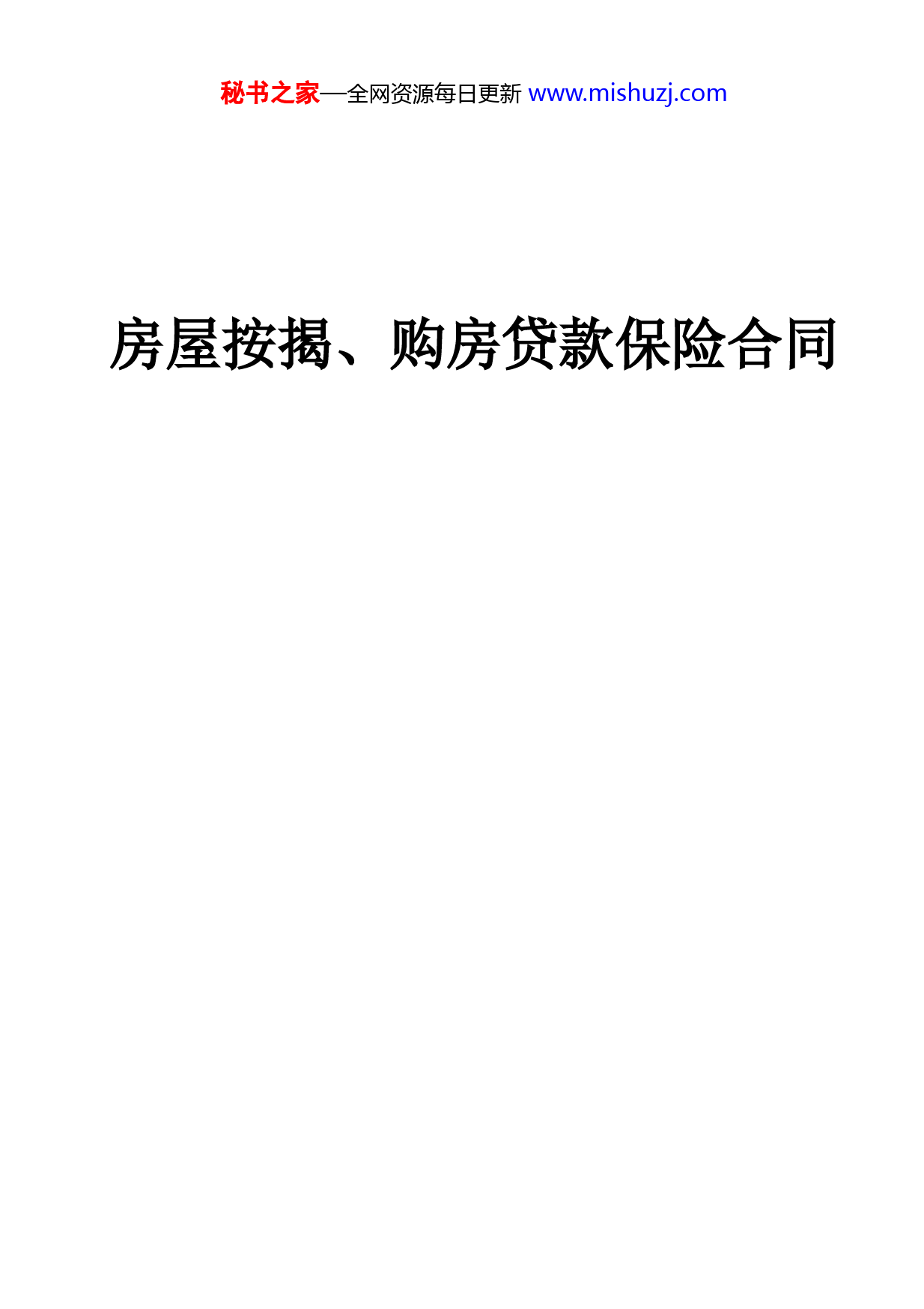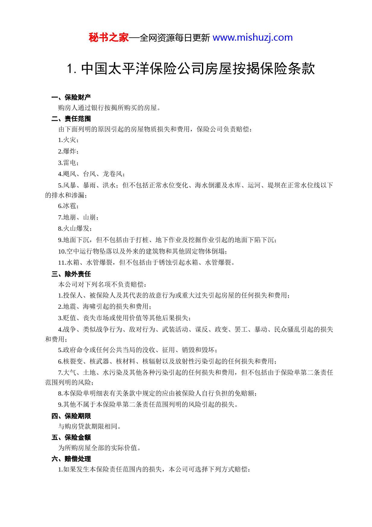 秘书之家—全网资源每日更新www.mishuzj.com房屋按揭、购房贷款保险合同秘书之家—全网资源每日更新www.mishuzj.com1.中国太平洋保险公司房屋按揭保险条款一、保险财产购房人通过银行按揭所购买的房屋。二、责任范围由下面列明的原因引起的房屋物质损失和费用,保险公司负责赔偿:1.火灾;2.爆炸;3.雷电;4.飓风、台风、龙卷风;5.风暴、暴雨、洪水;但不包括正常水位变化、海水倒灌及水库、运河、堤坝在正常水位线以下的排水和渗漏;6.冰雹;7.地崩、山崩;8.火山爆发;9.地面下沉,但不包括由于打桩、地下作业及挖掘作业引起的地面下陷下沉;10.空中运行物坠落以及外来的建筑物和其他固定物体倒塌;11.水箱、水管爆裂,但不包括由于锈蚀引起水箱、水管爆裂。三、除外责任本公司对下列名项不负责赔偿:1.投保人、被保险人及其代表的故意行为或重大过失引起房屋的任何损失和费用;2.地震、海啸引起的损失和费用;3.贬值、丧失市场或使用价值等其他后果损失;4.战争、类似战争行为、敌对行为、武装活动、谋反、政变、罢工、暴动、民众骚乱引起的损失和费用;5.政府命令或任何公共当局的没收、征用、销毁和毁坏;6.核裂变、核武器、核材料、核辐射以及放射性污染引起的任何损失和费用;7.大气、土地、水污染及其他各种污染引起的任何损失和费用,但不包括由于保险单第二条责任范围列明的风险;8.本保险单明细表有关条款中规定的应由被保险人自行负担的免赔额;9.其他不属于本保险单第二条责任范围列明的风险引起的损失。四、保险期限与购房贷款期限相同。五、保险金额为所购房屋全部的实际价值。六、赔偿处理1.如果发生本保险责任范围内的损失,本公司可选择下列方式赔偿:秘书之家—全网资源每日更新www.mishuzj.com(1)按受损财产的价值赔偿;(2)赔付受损财产基本恢复原状的修理、修复费用;(3)修理、恢复受损财产,使之达到与同类财产基本一致的状况。2.受损财产的赔偿损失按当时的市价计算。市价低于保险金额时,赔偿按市价计算;市价高于保险金额时,赔偿按保险金额与市价的比例计算。如本保险所载项目不止一项时,赔款按本规定逐项计算。3.保险项目发生损失后,如本公司按全部损失赔付,其残值应在赔款中扣除,本公司有权不接受被保险人对受损财产的委付。4.任何属于成对或成套的项目,若发生损失,本公司的赔偿责任不超过该受损项目在所属整对或整套基础上的保险金额中所占的比例。5.发生损失后,被保险人为减少损失而采取必要的措施后产生的合理费用,本公司予以赔偿,但本项费用以保险财产的保险金额为限。6.本公司赔偿损失后,由本公司出具批单将保险金额从损失发生之日起相应减少,并且不退还保险金额减少部分的保险费。如被保险人要求恢复至原保险金额,应按约定的保险费率加缴恢复部分从损失发生之日起至保险期限终止之日起按日比例计算的保险费。7.被保险人的索赔期限,从损失发生之日起,不得超过2年。七、被保险人义务被保险人及其代表应严格履行下列义务:1.在投保时,被保险人及其代表应对投保申请书中列明的事项以及本公司提出的其他事项作出真实、详尽的说明或描述;2.被保险人投保时一次交清保险费;3.保险期限内,被保险人应采取一切合理的预防措施,包括认真考虑并付诸实施本公司代表提出的合理的防损建议,由此产生的一切费用,均由被保险人承担;4.在发生引起或可能引起本保险单项下索赔的损失时,被保险人及其代表应:(1)立即通知本公司,并在7天或经本公司书面同意延长的期限内以书面报告提供事故发生的经过、原因和损失程度;(2)采取一切必要措施防止损失的进一步扩大并将损失减少到最低程度;(3)在本公司的代表或检验师进行勘查之前,保留事故现场及有关实物证据;(4)根据本公司的要求提供作为索赔依据的所有证明文件、资料和单据。八、特别约定在保险期限内,购房人还贷完毕,由贷款人出具证明,贷款人的保险权益丧失,保险人出具批单,保险人继续负责本保单项下的保险责任。九、争议处理被保险人与本公司之间的一切有关本保险的争议应通过友好协商解决。如果协商不成,按()项办法解决:(1)向仲裁机关申请仲裁;(2)向法院提出诉讼。2.中国太平洋保险公司购房贷款借贷者人身保险条款第一条合同构成本保险合同(以下简称“本合同”)由保险单或其他保险凭证及所附条款、投保单、与本合同有关的投保文件、合法有效的声明、批注、附贴批单、其他书面协议构成。第二条投保范围秘书之家—全网资源每日更新www.mishuzj.com一、投保人:凡年满18周岁,具有完全民事行为能力的人,可为符合投保条件本人或其配偶、直系亲属向中国太平洋保险公司(以下简称“保险人”)投保本保险;凡开办购房贷款业务的金融机构也可作为投保人,为其购房贷款者投保本保险。非本人投保时必须经被保险人书面同意。二、被保险人:凡年满在18周岁至55周岁,身体健康,能正常工作和劳动,具备购房贷款条件并向金融机构申请并获得购房贷款的个人,均可作为本保险的被保险人。第三条保险责任被保险人在保险有效期内,因疾病、遭受意外伤害事故所致身故或高度残疾,无法继续偿还购房贷款,保险人于事故发生后的第一个贷款归还日,按照贷款合同约定,将被保险人在此时的贷款余额(含本息)一次付清(若