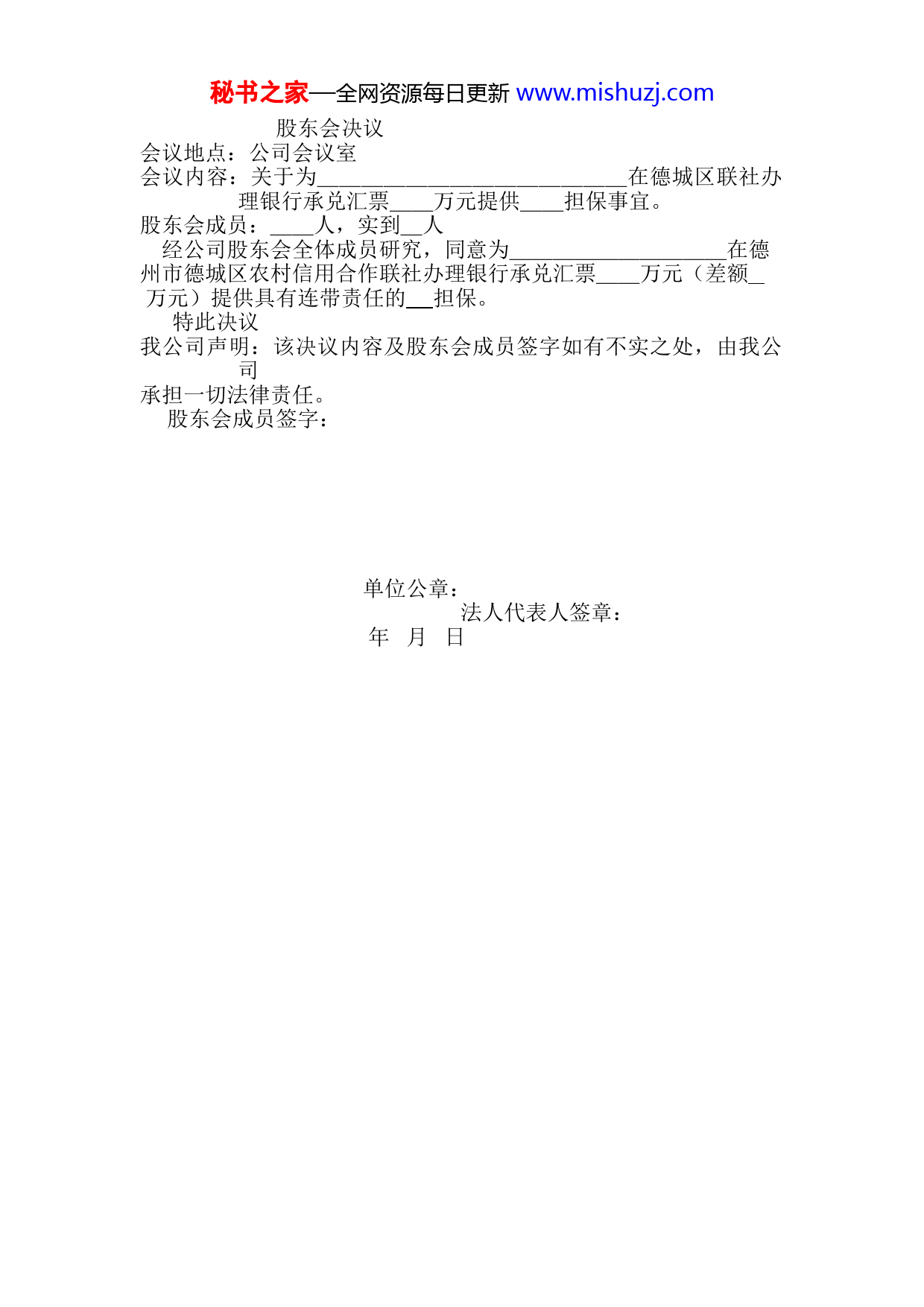 秘书之家—全网资源每日更新www.mishuzj.com股东会决议会议地点:公司会议室会议内容:关于为______________在德城区联社办理银行承兑汇票__万元提供__担保事宜。股东会成员:__人,实到_人经公司股东会全体成员研究,同意为__________在德州市德城区农村信用合作联社办理银行承兑汇票__万元(差额万元)提供具有连带责任的担保。特此决议我公司声明:该决议内容及股东会成员签字如有不实之处,由我公司承担一切法律责任。股东会成员签字:单位公章:法人代表人签章:年月日