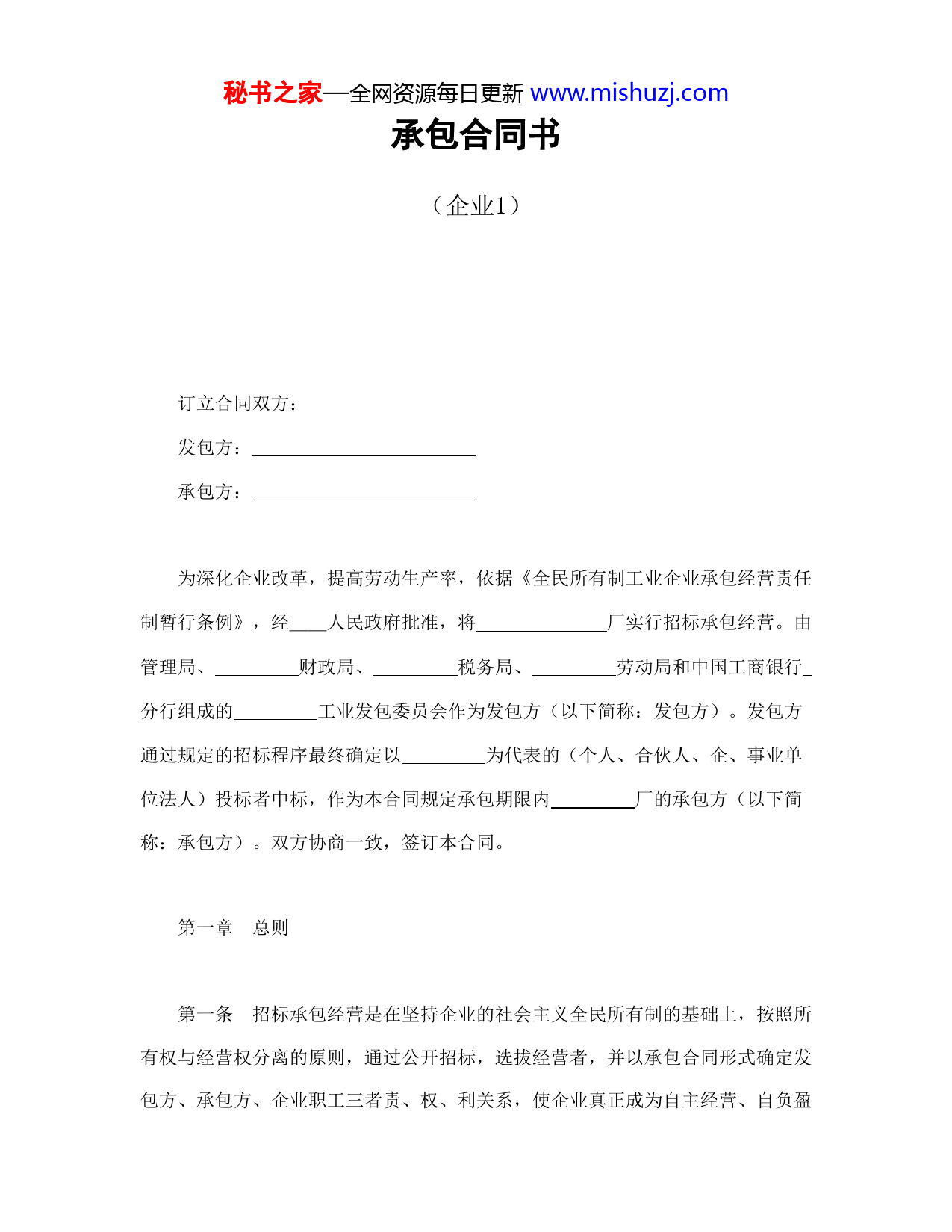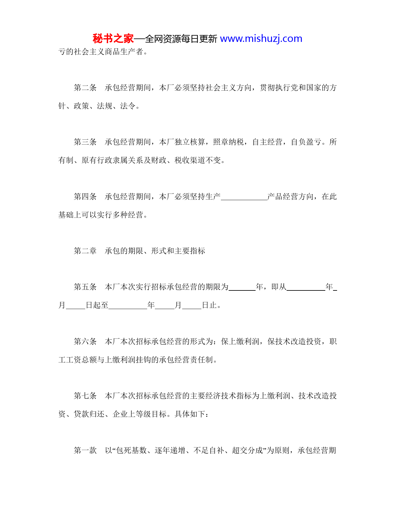 秘书之家—全网资源每日更新www.mishuzj.com承包合同书(企业1)订立合同双方:发包方:承包方:为深化企业改革,提高劳动生产率,依据《全民所有制工业企业承包经营责任制暂行条例》,经__人民政府批准,将厂实行招标承包经营。由管理局、财政局、税务局、劳动局和中国工商银行分行组成的工业发包委员会作为发包方(以下简称:发包方)。发包方通过规定的招标程序最终确定以为代表的(个人、合伙人、企、事业单位法人)投标者中标,作为本合同规定承包期限内厂的承包方(以下简称:承包方)。双方协商一致,签订本合同。第一章总则第一条招标承包经营是在坚持企业的社会主义全民所有制的基础上,按照所有权与经营权分离的原则,通过公开招标,选拔经营者,并以承包合同形式确定发包方、承包方、企业职工三者责、权、利关系,使企业真正成为自主经营、自负盈秘书之家—全网资源每日更新www.mishuzj.com亏的社会主义商品生产者。第二条承包经营期间,本厂必须坚持社会主义方向,贯彻执行党和国家的方针、政策、法规、法令。第三条承包经营期间,本厂独立核算,照章纳税,自主经营,自负盈亏。所有制、原有行政隶属关系及财政、税收渠道不变。第四条承包经营期间,本厂必须坚持生产产品经营方向,在此基础上可以实行多种经营。第二章承包的期限、形式和主要指标第五条本厂本次实行招标承包经营的期限为年,即从年月日起至年月日止。第六条本厂本次招标承包经营的形式为:保上缴利润,保技术改造投资,职工工资总额与上缴利润挂钩的承包经营责任制。第七条本厂本次招标承包经营的主要经济技术指标为上缴利润、技术改造投资、贷款归还、企业上等级目标。具体如下:第一款以“包死基数、逐年递增、不足自补、超交分成”为原则,承包经营期秘书之家—全网资源每日更新www.mishuzj.com间上缴利润总额为万元,其中年为万元,年为万元,年为万元,年为万元,……。第二款承包经营期间,保技术改造项目完成,技术改造投资总额为万。其中年为万元,年为万元,年为万元,年为万元。……第三款承包经营期间,归还银行贷款总额为万元。其中年为年为万元,年为万元,万元,年为万元,……。第四款本厂企业上等级目标为年底以前达到国家(市)级企业标准。第三章承包方的权利与义务第一节承包方的权利第八条承包经营期间,承包个人或合伙承包的第一承包人(以下简称:第一承包人)为该厂法人代表,当然厂长,享受厂长负责制和本合同赋予厂长的全部权秘书之家—全网资源每日更新www.mishuzj.com利,并承担其全部义务,如企、事业法人承包则由其指派的承包代理人(仅限一人)作为本厂的法人代表,行使厂长的职权,并代表承包方履行本合同。第九条承包方在承包期间,对本厂的经营管理有如下权利:第一款有权按国家规定自主聘任副厂长及副厂级行政干部,组成本厂的领导机构,并报主管局备案,承包期满或合同解除后,该领导机构即告解体。第二款有权决定本厂的机构设置、人事任免和专业技术人员的聘任。第三款有权依照有关规定奖惩、招用职工和辞退违纪职工。第四款有权改革本厂内部分配制度,在上级核定的工资总额范围内有权自选工资形式,自定工资标准。第五款有权根据实际需要购置新设备。第六款在不违反本合同第四条的前提下,有权开发新产品。第十条承包方有权依据本合同规定,取得其应得的合法收入。第二节承包方的义务秘书之家—全网资源每日更新www.mishuzj.com第十一条承包方在承包期间应尽义务如下:第一款对本厂的物质文明建设和精神文明建设负有全面责任。第二款必须依照国家有关规定,按期如数缴纳应缴纳的各种税、费和统筹基金。第三款必须按期完成本合同规定的各项经济技术指标和各项附加指标。第四款在承包期间,应保证本厂厂房设备的完好,并按国家规定,分类按比例提取固定资产折旧基金和大修理基金,做到专款专用。第五款应完成国家给本厂下达的各项指令性计划。第六款应负责继续履行本厂与其它单位已签订的一切有效经济合同,并应承担本厂与其它单位一切原有合法债权、债务。第七款自觉接受本厂党组织和本厂职工的监督,尊重和保护本厂职工的民主权利,定期向本厂职代会报告工作,听取职工的意见和建议。第八款维护本厂职工的合法权益,改善职工的劳动条件,在不断提高经济效益的前提下,逐步提高本厂职工收入,不断改善职工福利待遇。秘书之家—全网资源每日更新www.mishuzj.com第十二条承包方须以一定的自有资金做抵押(或担保)。承包方的抵押金(或担保金)额为元。第十三条承包方必须全面履行本合同中应由承包方履行的全部条款。第四章发包方的权利与义务第十四条发包方的权利如下:第一款有权维护国家利益和本厂利益不受损害。第二款有权监督本厂的产品经营方向。第三款对本厂有财务监督权、审计权和产品质量检查权。第四款有权按国家法律、法规和本合同规定维护本厂职工的合法权益。第十五条发包方的义务如下:第一款不得违反本合同规定,干涉承包方的经营自主权。第二款不得平调本厂资产。秘书之家—全网资源每日更新www.mishuzj.com第三款必须按本合同规定保障承包方的合法权益。第四款必须全面履行本合同中应由发包方履行的全部条款。第五章承包方的收入第十六条承包经营