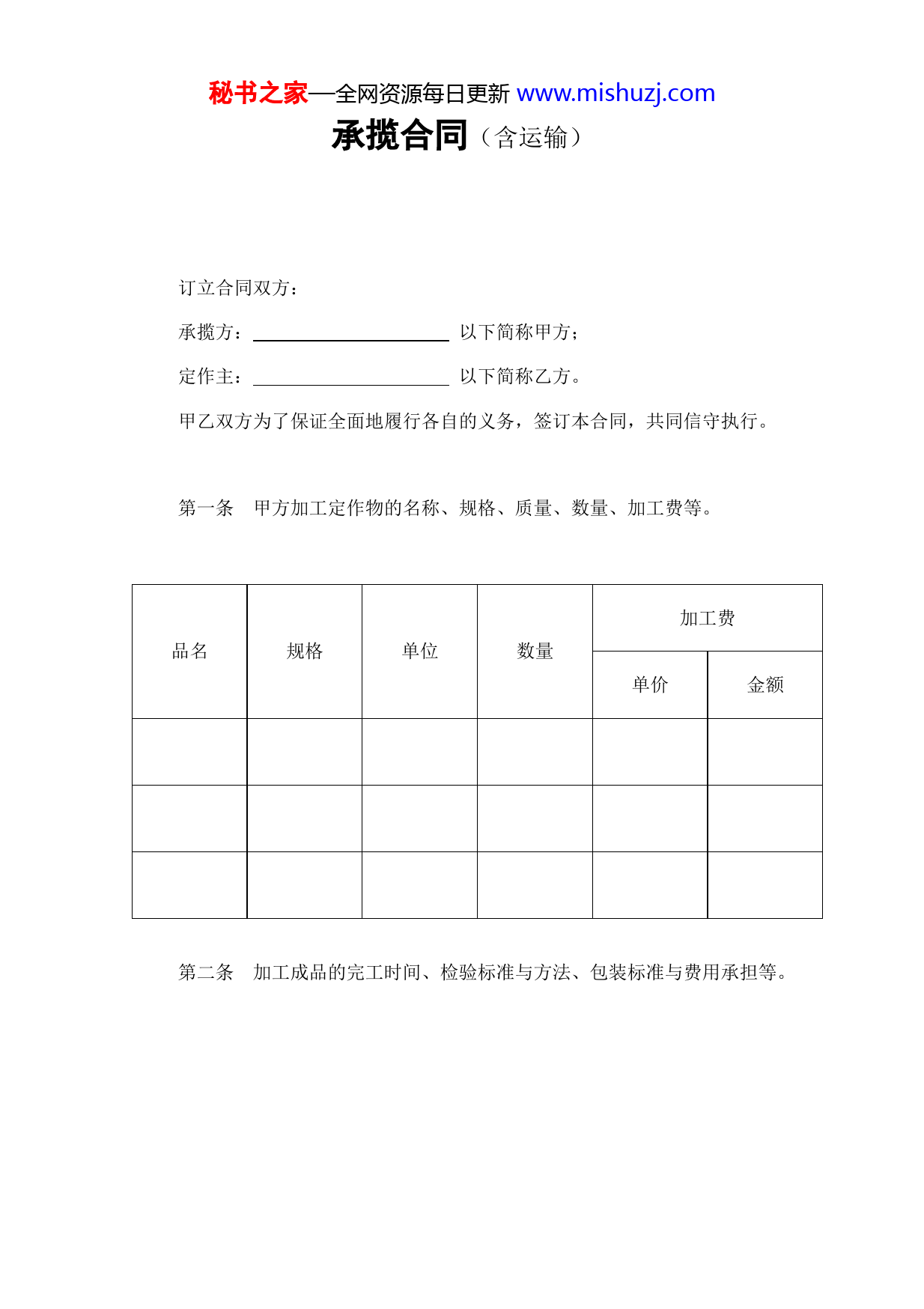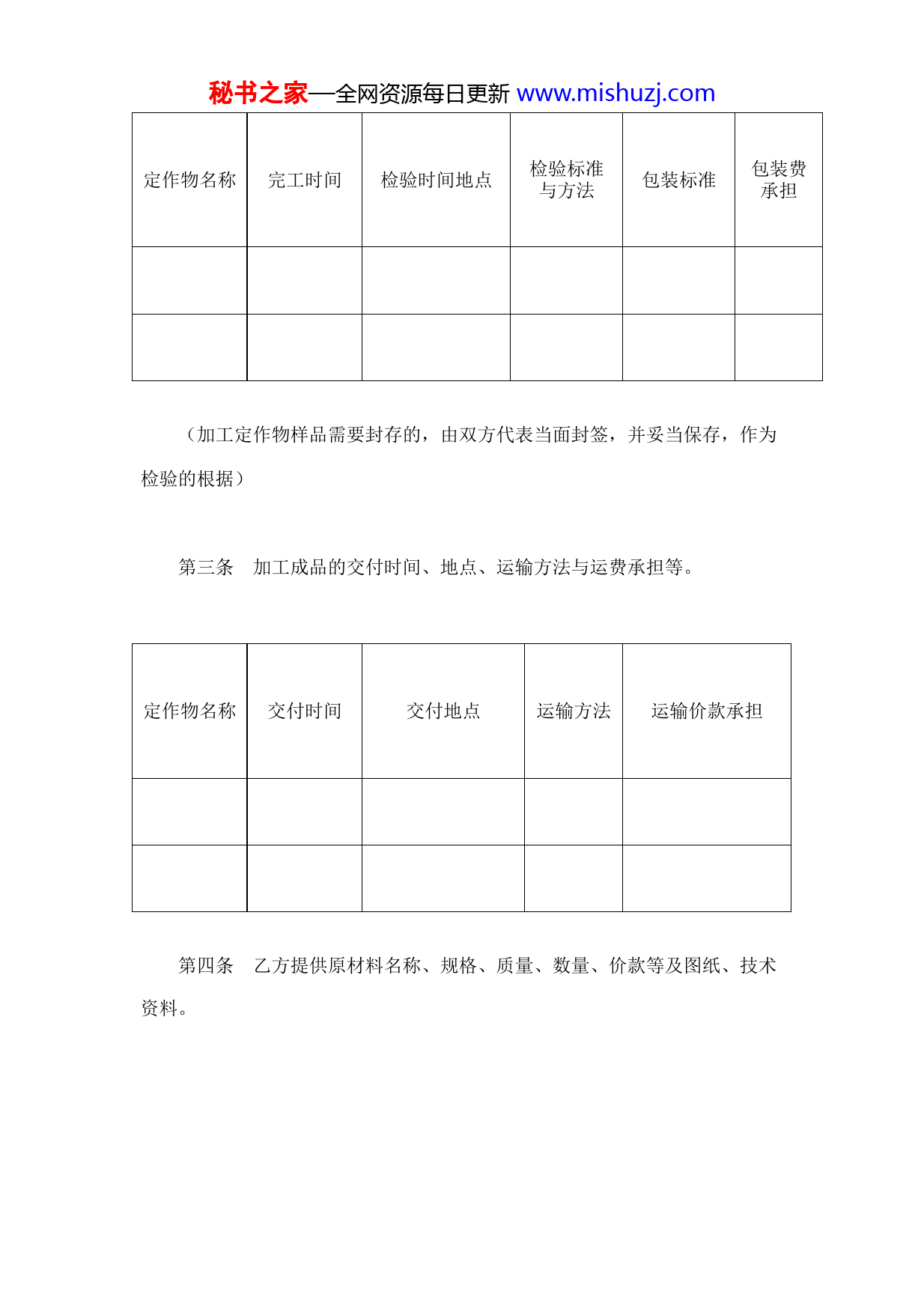 秘书之家—全网资源每日更新www.mishuzj.com承揽合同(含运输)订立合同双方:承揽方:以下简称甲方;定作主:以下简称乙方。甲乙双方为了保证全面地履行各自的义务,签订本合同,共同信守执行。第一条甲方加工定作物的名称、规格、质量、数量、加工费等。加工费品名规格单位数量单价金额第二条加工成品的完工时间、检验标准与方法、包装标准与费用承担等。秘书之家—全网资源每日更新www.mishuzj.com定作物名称完工时间检验时间地点检验标准包装标准包装费与方法承担(加工定作物样品需要封存的,由双方代表当面封签,并妥当保存,作为检验的根据)第三条加工成品的交付时间、地点、运输方法与运费承担等。定作物名称交付时间交付地点运输方法运输价款承担第四条乙方提供原材料名称、规格、质量、数量、价款等及图纸、技术资料。秘书之家—全网资源每日更新www.mishuzj.com材料名称型号规格质要量求计单量位数量单价总价图料纸及、交技付术时资间第五条原材料交付时间、地点、包装、检验方法、运输等。材料名称交付时间交付地点交付包装要求检验方法运输方法数量和运费承担第六条加工费结算办法与时间。第七条乙方应于年月日前向甲方交付定金元;乙方应于年月日前向甲方交付预付款元。乙方不履行合同的,无权请求返还定金。甲方不履行合同的,除承担违约责任外,必须如数返还预付款。乙方不履行合同的,可以把预付款抵作违约金和赔偿金,有余款可以请求返还。秘书之家—全网资源每日更新www.mishuzj.com第八条甲方的违约责任1.甲方如未按合同规定的质量交付定作物,乙方同意利用的,应当按质论价;不同意利用的,甲方应当负责修理或调换,并承担逾期交付的责任;经过修整或调整后,仍不符合合同规定的有权拒收,由此造成的损失由甲方赔偿。2.甲方交付定作物的数量少于合同规定的,乙方仍然需要的,甲方应当照数补齐,补交部分按逾期交付处理;乙方不再需要的,有权解除合同,因此造成的损失由甲方赔偿。3.因甲方包装不善造成定作物毁损的,由甲方赔偿损失。4.甲方逾期交付定作物,应当向乙方偿付违约金,每逾期一天,按逾期交付部分的价款总额的‰偿付违约金。5.甲方不能交付定作物的,应向乙方偿付不能交付定作物部分价款总值%的违约金。6.由甲方负责送货的,如运输中造成定作物损坏,甲方应当负责修理,达到合同规定的质量要求,否则乙方有权拒收。第九条乙方的违约责任1.乙方如中途变更定作物的数量、规格、质量或设计等,应当赔偿甲方秘书之家—全网资源每日更新www.mishuzj.com因此造成的损失。2.乙方如中途废止合同,应偿付甲方未履行部分定作物价款总值%的违约金。3.乙方如未按合同规定的时间向甲方提供图纸和其它技术资料,除交付定作物的日期得以顺延外,乙方应当偿付甲方因停工待料的损失。4.乙方如超过合同规定日期付款,应当比照中国人民银行有关延期付款的规定,向甲方偿付违约金。5.乙方如无故拒绝接收定作物,应当赔偿甲方因此造成的损失。6.乙方如变更交付定作物地点,应承担因此而多支出的费用。第十条不可抗力在合同规定的履行期内,由于不可抗力致使定作物或原材料毁损、灭失的,甲方在经有关部门证明后,可免予承担违约责任。但甲方应当采取积极措施,尽量减少损失,如不可抗力的损失是在合同规定的履行期以外发生的,不得免除甲方责任;在乙方迟延接受或无故拒收期间发生的,乙方应当承担责任,并赔偿甲方因此造成的损失。第十一条本合同发生纠纷时,双方协商解决;协商不成时,可以向人民法院起诉。秘书之家—全网资源每日更新www.mishuzj.com本合同于年月日生效,合同履行完毕即失效。本合同一式份,甲乙双方各执一份,公证处、物价局、建设银行各存一份。承揽方:定作方:地址:地址:法定代表人:法定代表人:签约日期:年月日