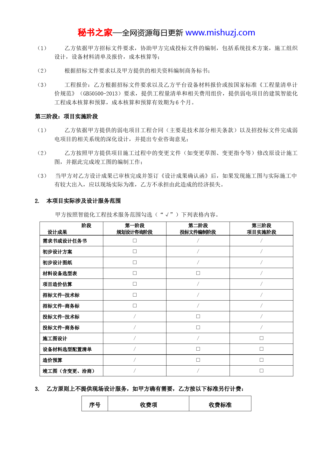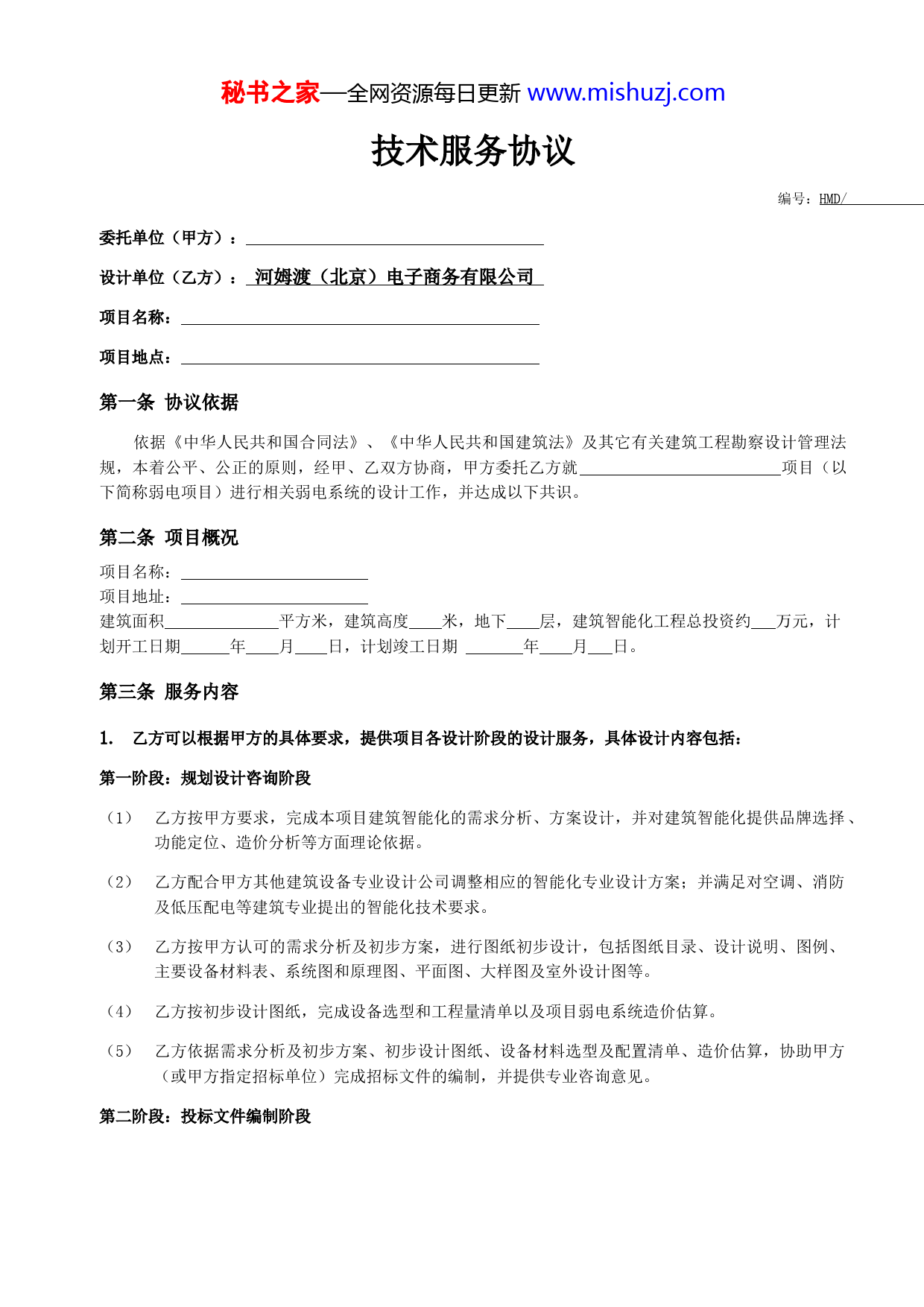 秘书之家—全网资源每日更新www.mishuzj.com技术服务协议编号:HMD/委托单位(甲方):设计单位(乙方):河姆渡(北京)电子商务有限公司项目名称:项目地点:第一条协议依据依据《中华人民共和国合同法》、《中华人民共和国建筑法》及其它有关建筑工程勘察设计管理法规,本着公平、公正的原则,经甲、乙双方协商,甲方委托乙方就项目(以下简称弱电项目)进行相关弱电系统的设计工作,并达成以下共识。第二条项目概况项目名称:项目地址:建筑面积平方米,建筑高度米,地下层,建筑智能化工程总投资约万元,计划开工日期年月日,计划竣工日期年月日。第三条服务内容1.乙方可以根据甲方的具体要求,提供项目各设计阶段的设计服务,具体设计内容包括:第一阶段:规划设计咨询阶段(1)乙方按甲方要求,完成本项目建筑智能化的需求分析、方案设计,并对建筑智能化提供品牌选择、功能定位、造价分析等方面理论依据。(2)乙方配合甲方其他建筑设备专业设计公司调整相应的智能化专业设计方案;并满足对空调、消防及低压配电等建筑专业提出的智能化技术要求。(3)乙方按甲方认可的需求分析及初步方案,进行图纸初步设计,包括图纸目录、设计说明、图例、主要设备材料表、系统图和原理图、平面图、大样图及室外设计图等。(4)乙方按初步设计图纸,完成设备选型和工程量清单以及项目弱电系统造价估算。(5)乙方依据需求分析及初步方案、初步设计图纸、设备材料选型及配置清单、造价估算,协助甲方(或甲方指定招标单位)完成招标文件的编制,并提供专业咨询意见。第二阶段:投标文件编制阶段秘书之家—全网资源每日更新www.mishuzj.com(1)乙方依据甲方招标文件要求,协助甲方完成投标文件的编制,包括系统技术方案,施工组织设计,设备材料清单及报价,成本核算等;(2)根据招标文件要求以及甲方提供的相关资料编制商务标书;(3)工程报价:乙方根据招标文件要求以及乙方平台设备材料报价或按国家标准《工程量清单计价规范》(GB50500-2013)要求,提供工程量清单和相关费用组价,提供弱电项目的建筑智能化工程成本核算和预算,成本核算和预算有效期为6个月。第三阶段:项目实施阶段(1)乙方依据甲方提供的弱电项目工程合同(主要是技术部分相关条款)以及招投标文件完成弱电项目的相关系统的深化设计,并提出专业咨询意见;(2)乙方按照甲方提供项目施工过程中的变更文件(如变更草图、变更指令等)修改原设计施工图,并据此完成竣工图的编制工作;(3)当甲方对乙方设计成果已审核完成并签订《设计成果确认函》后,如果发现施工图与实际施工中有较大出入,应以现场实际为准,乙方不承担由此造成的经济损失。2.本项目实际涉及设计服务范围甲方按照智能化工程技术服务范围勾选(“√”)下列表格内容。阶段第一阶段第二阶段第三阶段设计成果规划设计咨询阶段投标文件编制阶段项目实施阶段需求书或设计任务书□///初步设计方案□///初步设计图纸□///材料设备选型表□□//项目造价估算□//□招标文件-技术标□/□□招标文件-商务标□/□投标文件-技术标/□投标文件-商务标/□施工图设计//设备材料选型配置清单/□造价预算/□竣工图(含变更、洽商)//3.乙方原则上不提供现场设计服务,如甲方确有需要,乙方按以下标准另行计费:序号收费项收费标准秘书之家—全网资源每日更新www.mishuzj.com1往返差旅费(元/人、次)实报实销实报实销2现场住宿费(元/人、天)500.00元3现场服务费(元/人、天)4.本项目约定乙方现场服务次数:设计阶段服务需求备注规划设计咨询阶段人次投标文件编制阶段人次人次项目实施阶段第四条设计进度1.设计成果所需要的时间(1)乙方各设计阶段设计成果核定设计时间如下:阶段第一阶段第二阶段第三阶段设计成果规划设计咨询阶段投标文件编制阶段项目实施阶段需求书或设计任务书5工作日初步设计方案5工作日初步设计图纸材料设备选型表3工作日10工作日10工作日7工作日2工作日项目造价估算2工作日招标文件-技术标2工作日招标文件-商务标投标文件-技术标投标文件-商务标施工图设计设备材料选型配置清单造价预算竣工图(含变更、洽商)(2)甲方在购买设计服务产品时,需要了解上述时间表,初步判断上述时间能否满足项目设计要求。(3)上表约定所需设计时间自本合同签订且甲方已向乙方递交满足设计需求的全部资料时开始起计;(4)以上均为十万平米以下的标准建筑智能化系统技术服务所需时间,如甲方委托项目为超过十万平米及如智慧城市、智慧社区、平安城市、大型数据中心等特种项目,设计时间按工作量评估决定设计成果交付时间。2.设计成果的交付时间秘书之家—全网资源每日更新www.mishuzj.com(1)本项目设计成果约定交付时间一览表:设计成果阶段第一阶段第二阶段第三阶段规划设计咨询投标文件编制项目实施需求书或设计任务书年月日初步设计方案年月日初步设计图纸材料设备选型表年月日年月日项目造价估算招标文件-技术标年月日招标文件-商务标年月日投标文件-技术标年月日投标文件-商务标年月日施工图设计年月日设备材料选型配置清单造价预算竣工图(含变更、洽商)(2)若约定设计成果交付时间超出乙方核定时间,视同选择加急服务,甲方承诺按设计服务费总额的15%支付设计服务加急费,且加急服务设计成果所需要的