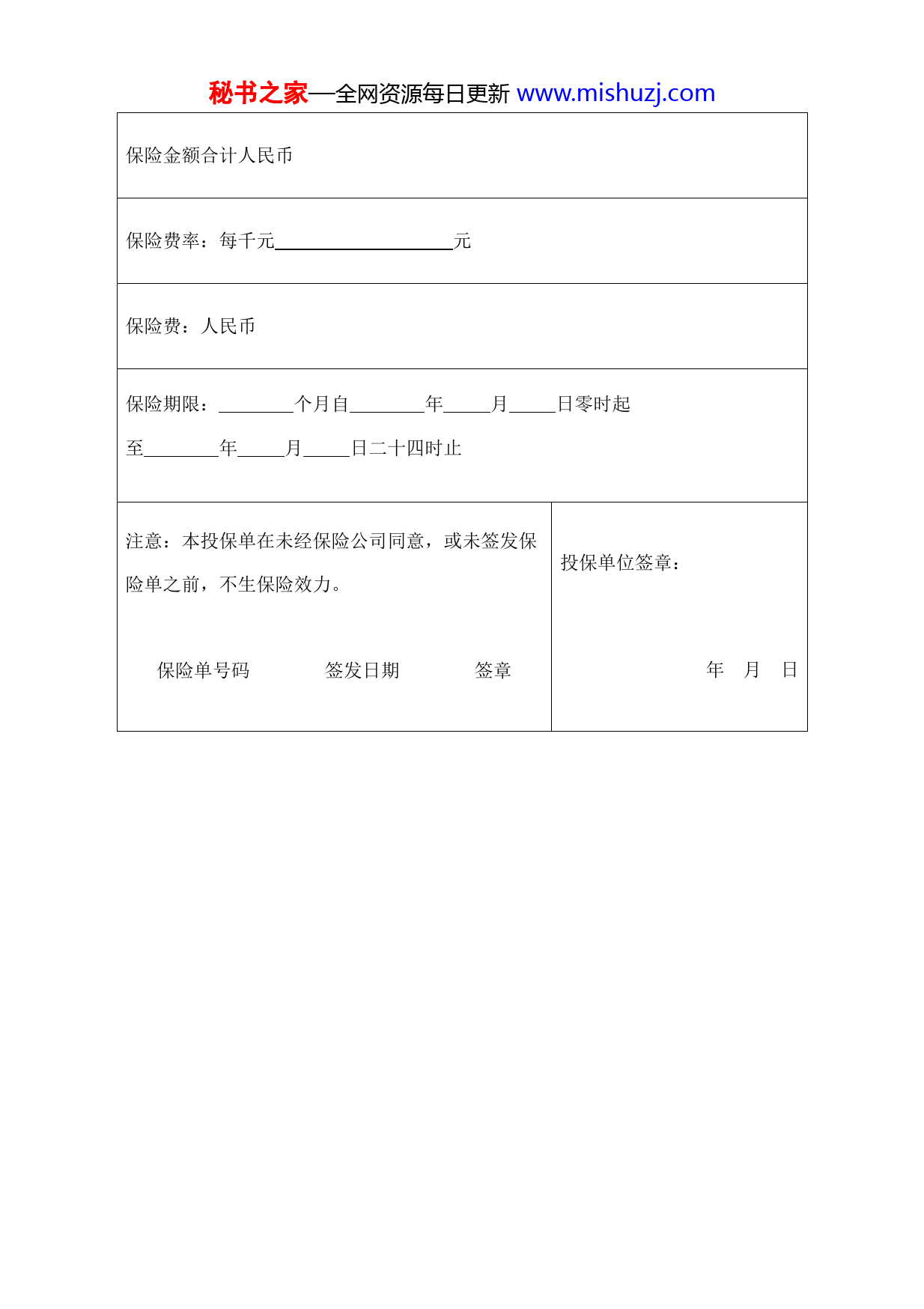 秘书之家—全网资源每日更新www.mishuzj.com投保单(企业财产2)中国人民保险公司企业财产保险投保单投保单位:电话:保险财产地址:联系人兹将下列财产向中国人民保险公司投保企业财产保险:保险财产名称保险金额特别约定秘书之家—全网资源每日更新www.mishuzj.com保险金额合计人民币保险费率:每千元元保险费:人民币保险期限:个月自年月日零时起至年月日二十四时止注意:本投保单在未经保险公司同意,或未签发保投保单位签章:险单之前,不生保险效力。保险单号码签发日期签章年月日