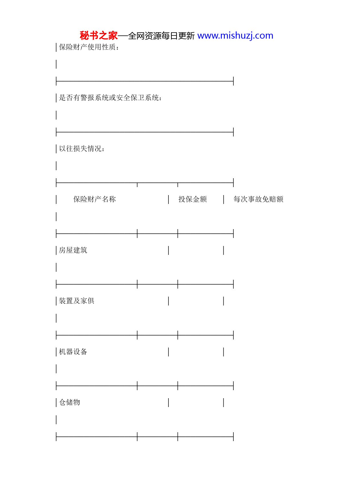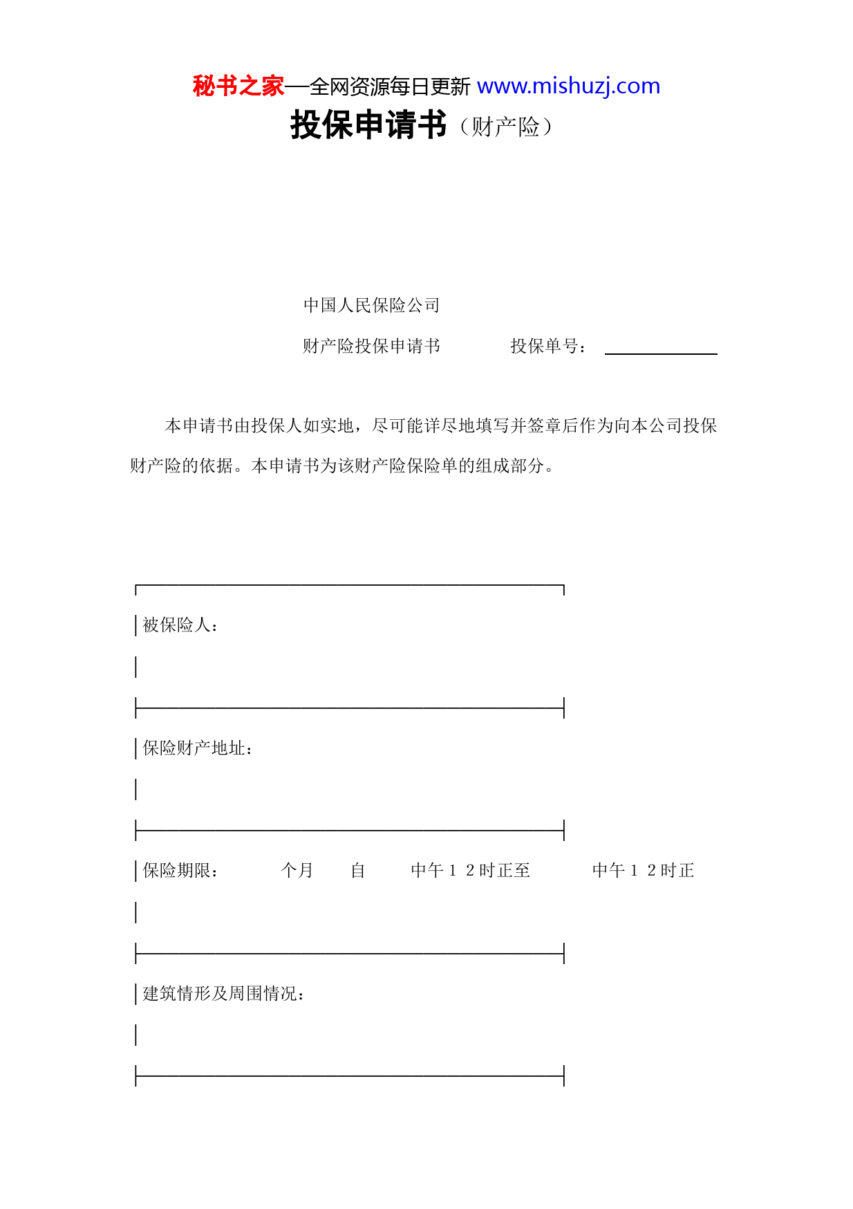 秘书之家—全网资源每日更新www.mishuzj.com投保申请书(财产险)中国人民保险公司财产险投保申请书投保单号:本申请书由投保人如实地,尽可能详尽地填写并签章后作为向本公司投保财产险的依据。本申请书为该财产险保险单的组成部分。┌──────────────────────────────────┐│被保险人:│├──────────────────────────────────┤│保险财产地址:│├──────────────────────────────────┤│保险期限:个月自中午12时正至中午12时正│├──────────────────────────────────┤│建筑情形及周围情况:│├──────────────────────────────────┤秘书之家—全网资源每日更新www.mishuzj.com│保险财产使用性质:│├──────────────────────────────────┤│是否有警报系统或安全保卫系统:│├──────────────────────────────────┤│以往损失情况:│├───────────────┬───────┬──────────┤│保险财产名称│投保金额│每次事故免赔额│├───────────────┼───────┼──────────┤│房屋建筑│││├───────────────┼───────┼──────────┤│装置及家俱│││├───────────────┼───────┼──────────┤│机器设备│││├───────────────┼───────┼──────────┤│仓储物│││├───────────────┼───────┼──────────┤秘书之家—全网资源每日更新www.mishuzj.com│其他物品│││├───────────────┴───────┴──────────┤│总保险金额:│├──────────────────────────────────┤│费率:保险费:│├──────────────────────────────────┤│备注:│└──────────────────────────────────┘投保人(签名盖章)________电话________地址________日期__________