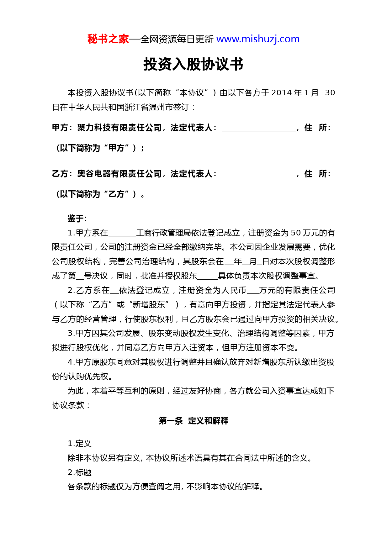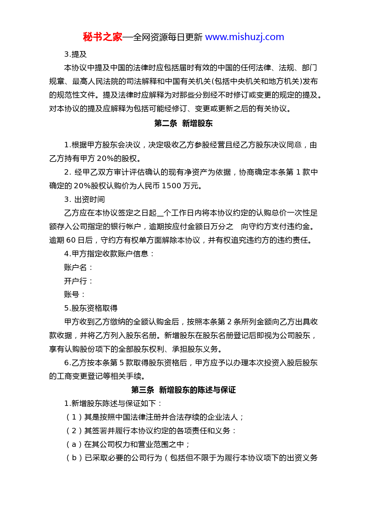 秘书之家—全网资源每日更新www.mishuzj.com投资入股协议书本投资入股协议书(以下简称“本协议”)由以下各方于2014年1月30日在中华人民共和国浙江省温州市签订:甲方:聚力科技有限责任公司,法定代表人:,住所:(以下简称为“甲方”);乙方:奥谷电器有限责任公司,法定代表人:,住所:(以下简称为“乙方”)。鉴于:工商行政管理局依法登记成立,注册资金为50万元的有1.甲方系在限责任公司,公司的注册资金已经全部缴纳完毕。本公司因企业发展需要,优化公司股权结构,完善公司治理结构,其股东会在年月日对本次股权调整形成了第号决议,同时,批准并授权股东具体负责本次股权调整事宜。2.乙方系在依法登记成立,注册资金为人民币万元的有限责任公司(以下称“乙方”或“新增股东”),有意向甲方投资,并指定其法定代表人参与乙方的经营管理,行使股东权利,且乙方股东会已通过向甲方投资的相关决议。3.甲方因其公司发展、股东变动股权发生变化、治理结构调整等因素,甲方拟进行股权优化,并同意乙方向甲方入注资本,但甲方注册资本不变。4.甲方原股东同意对其股权进行调整并且确认放弃对新增股东所认缴出资股份的认购优先权。为此,本着平等互利的原则,经过友好协商,各方就公司入资事宜达成如下协议条款:第一条定义和解释1.定义除非本协议另有定义,本协议所述术语具有其在合同法中所述的含义。2.标题各条款的标题仅为方便查阅之用,不影响本协议的解释。秘书之家—全网资源每日更新www.mishuzj.com3.提及本协议中提及中国的法律时应包括届时有效的中国的任何法律、法规、部门规章、最高人民法院的司法解释和中国有关机关(包括中央机关和地方机关)发布的规范性文件。提及法律时应解释为对那些分别经不时修订或变更的规定的提及。对本协议的提及应解释为包括可能经修订、变更或更新之后的有关协议。第二条新增股东1.根据甲方股东会决议,决定吸收乙方参股经营且经乙方股东决议同意,由乙方持有甲方20%的股权。2.经甲乙双方审计评估确认的现有净资产为依据,协商确定本条第1款中确定的20%股权认购价为人民币1500万元。3.出资时间乙方应在本协议签定之日起个工作日内将本协议约定的认购总价一次性足额存入公司指定的银行帐户,逾期按应付金额日万分之向守约方支付违约金。逾期60日后,守约方有权单方面解除本协议,并有权追究违约方的违约责任。4.甲方指定收款账户信息:账户名:开户行:账号:5.股东资格取得甲方收到乙方缴纳的全额认购金后,按照本条第2条所列金额向乙方出具收款收据,并将乙方列入股东名册。新增股东在股东名册登记后即视为公司股东,享有认购股份项下的全部股东权利、承担股东义务。6.乙方按本条第5款取得股东资格后,甲方应予以办理本次投资入股后股东的工商变更登记等相关手续。第三条新增股东的陈述与保证1.新增股东陈述与保证如下:(1)其是按照中国法律注册并合法存续的企业法人;(2)其签署并履行本协议约定的各项责任和义务:(a)在其公司权力和营业范围之中;(b)已采取必要的公司行为(包括但不限于为履行本协议项下的出资义务秘书之家—全网资源每日更新www.mishuzj.com筹集足额的公司资本)并已获得内部有权决策机构的批准;(c)不违反对其有约束力或有影响的法律或合同的规定或限制。(3)乙方在其所拥有的任何财产上未设置任何担保权益(包括但不限于任何抵押权、质押权、留置权以及其它担保权等)或第三者权益;(4)乙方向甲方提交了截至年月日止的财务报表及所有必要的文件和资料,并在此确认该财务报表正确反映了乙方的财务状况和其它状况;(5)乙方保证其依据本协议认购相应甲方股权的投资款来源合法,并且其有足够的能力依据本协议的条款与条件向甲方及时支付投资款。(6)乙方没有从事或参与有可能导致其现在和将来遭受吊销营业执照、罚款或其它严重影响其经营的行政处罚或法律制裁的任何违反中国法律、法规的行为;(7)乙方未就任何与其有关的、已结束的、尚未结束的或可能将要开始的任何诉讼、仲裁、调查及行政程序对甲方进行隐瞒或进行虚假/错误陈述。2.乙方承诺与保证如下:(1)本协议经其签署后即构成对其合法、有效和有约束力的义务;(2)有能力合理地满足甲方经营发展的预期需求;(3)完成认购手续且甲方完成工商变更登记后,乙方指定其法定代表人为唯一的合法代理人严格按照甲方治理结构进行经营和管理等行使股东权力。3.新增股东承诺:乙方在取得股东资格之日起三年之内不得退股。若出现定事由或三年期限届满的,乙方的股权价值应由甲方净资产及当时市场因素决定,但估值总额不超过人民币3000万。4.新增股东将承担由于违反上述陈述和保证而产生的一切经济责任和法律责任,并赔偿由于违反该项陈述和保证而给公司及其原有股东各方造成的任何直接损失。第四条甲方对新增股东的陈述与保证1.甲方保证如下:(1)甲方是按中国法律注册、合法存续并经营的有限责任公司;(2)甲方在其所拥有的任何财产上已书面告知新增股东未设置任何担保权益(包括但不限于任何抵押权、质押权、留置权以及其它担保权等)或第三者权益;截止日后到本协议签定前所发生的任何担保权益或第三方权益,公司仍有义务书面告之新增股东。(3)甲方对用于公司业务经营的资