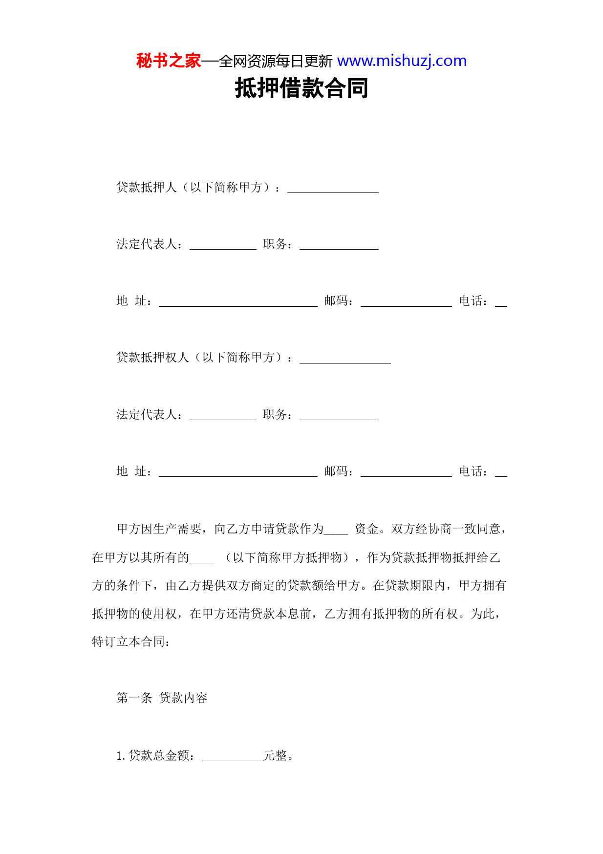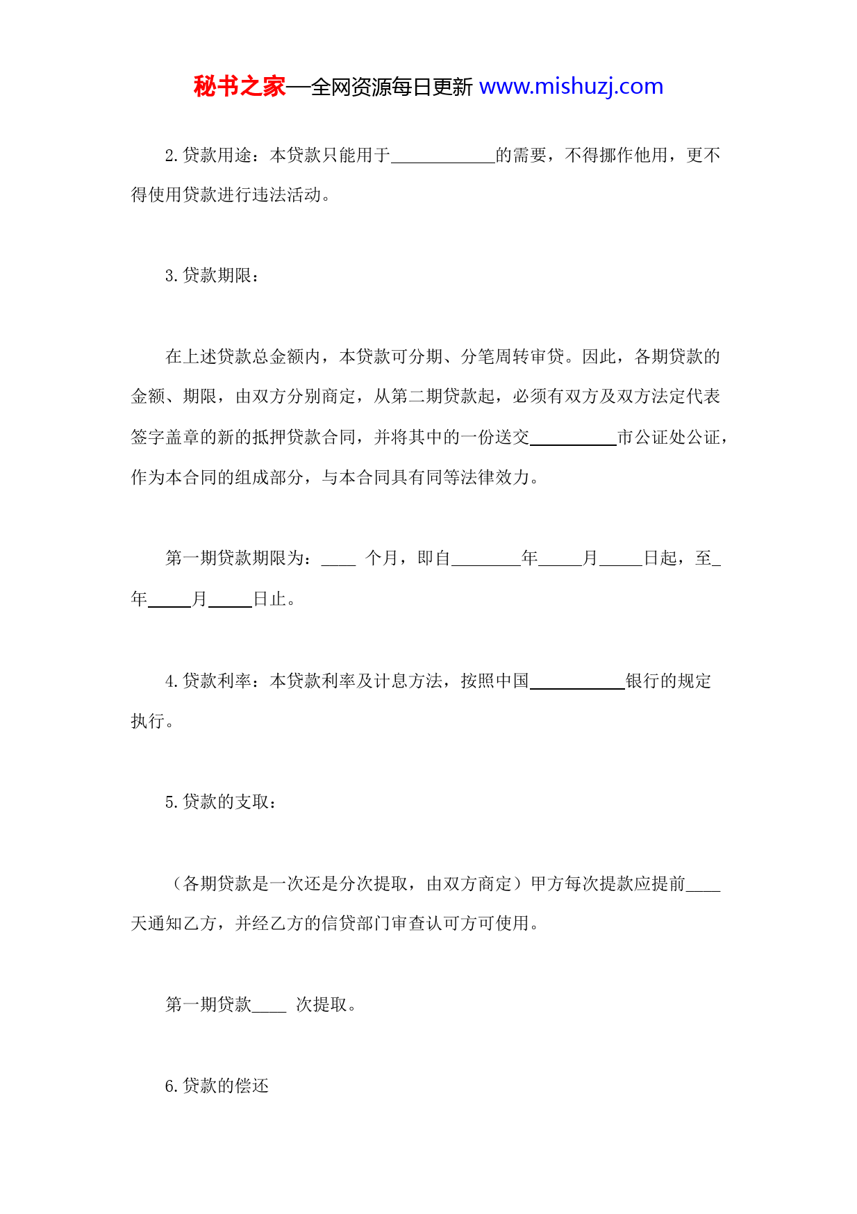 秘书之家—全网资源每日更新www.mishuzj.com抵押借款合同贷款抵押人(以下简称甲方):法定代表人:职务:地址:邮码:电话:贷款抵押权人(以下简称甲方):法定代表人:职务:地址:邮码:电话:甲方因生产需要,向乙方申请贷款作为____资金。双方经协商一致同意,在甲方以其所有的____(以下简称甲方抵押物),作为贷款抵押物抵押给乙方的条件下,由乙方提供双方商定的贷款额给甲方。在贷款期限内,甲方拥有抵押物的使用权,在甲方还清贷款本息前,乙方拥有抵押物的所有权。为此,特订立本合同:第一条贷款内容1.贷款总金额:元整。秘书之家—全网资源每日更新www.mishuzj.com2.贷款用途:本贷款只能用于的需要,不得挪作他用,更不得使用贷款进行违法活动。3.贷款期限:在上述贷款总金额内,本贷款可分期、分笔周转审贷。因此,各期贷款的金额、期限,由双方分别商定,从第二期贷款起,必须有双方及双方法定代表签字盖章的新的抵押贷款合同,并将其中的一份送交市公证处公证,作为本合同的组成部分,与本合同具有同等法律效力。第一期贷款期限为:____个月,即自年月日起,至年月日止。4.贷款利率:本贷款利率及计息方法,按照中国银行的规定执行。5.贷款的支取:(各期贷款是一次还是分次提取,由双方商定)甲方每次提款应提前____天通知乙方,并经乙方的信贷部门审查认可方可使用。第一期贷款____次提取。6.贷款的偿还秘书之家—全网资源每日更新www.mishuzj.com甲方保证在各期合同规定的贷款期限内按期主动还本付息。甲方归还本贷款的资金来源为本公司生产、经营及其他收入。如甲方要求用其他来源归还贷款,须经乙方同意。第一期贷款最后还款日为年月日。7.本合同在乙方同意甲方延迟还款的情况下继续有效。第二条抵押物事项1.抵押物名称:________________________2.制造厂家:________________________3.型号:________________________4.件数:________________________5.单件:________________________6.置放地点:________________________7.抵押物发票总金额:________________________秘书之家—全网资源每日更新www.mishuzj.com8.抵押期限:____年(或为:自本贷款合同生效之日起至甲方还清乙方与本合同有关的全部贷款本息为止)。第三条甲乙双方的义务(一)乙方的义务:1.对甲方交来抵押物契据证件要妥善保管,不得遗失、损毁。2.在甲方到期还清贷款后,将抵押物的全部契据、证件完整交还甲方。(二)甲方的义务:1.应严格按照合同规定时间主动还本付息。2.保证在抵押期间抵押物不受甲方破产、资产分割、转让的影响,如乙方发现甲方抵押物有违反本条款的情节,乙方通知甲方当即改正或可终止本合同贷款,并追偿已贷出的全部贷款本息。3.甲方应合理使用作为抵押物的,并负责抵押物的经营、维修、保养及有关税赋等费用。4.甲方因故意或过失造成抵押物毁损,应在15天内向乙方提供新的抵押物,若甲方无法提供新的抵押物或担保时,乙方有权相应减少贷款额度,或解除本合同,追偿已贷出的贷款本息。秘书之家—全网资源每日更新www.mishuzj.com5.甲方未经乙方同意不得将抵押物出租、出售、转让、再抵押或以其他方式处分。6.抵押物由甲方向保险公司投保,以乙方为保险受益人,并将保险单交乙方保管,保险费由甲方承担。投保的抵押物由于不可抗力遭受损失,乙方有权从保险公司的赔偿金中收回抵押人应当偿还的贷款本息。第四条违约责任1.乙方如因本身责任不按合同规定支付贷款,给甲方造成经济上的损失,乙方应负责违约责任。2.甲方如未按贷款合同规定使用贷款,一经发现,乙方有权提前收回部分或全部贷款,并对挪用贷款部分在原贷款利率的基础上加收____%的罚息。3.甲方如不按期付息还本,或有其他违约行为,乙方有权停止贷款,并要求甲方提前归还已贷的本息。乙方有权从甲方在任何银行开立的帐户内扣收,并从过期之日起,对逾期贷款部分按借款利率加收____%的利息。4.甲方如不按期付息还本,乙方亦可向有管辖权的人民法院申请拍卖抵押物,用于抵偿贷款本息,若有不足抵偿部分,乙方仍有权向甲方追偿。直至甲方还清乙方全部贷款本息为止。第五条其他规定秘书之家—全网资源每日更新www.mishuzj.com1.发生下列情况之一时,乙方有权停止发放贷款并立即或即期收回已经发放的贷款。(1)甲方向乙方提供情况、报表和各项资料不真实。(2)甲方与第三者发生诉讼,无力向乙方偿付贷款本息。(3)甲方的资产总额不足抵偿其负债总额。(4)甲方的保证人违反或失去合同书中规定的条件。2.乙方有权检查、监督贷款的使用情况,甲方应向乙方提供有关报表和资料。3.甲方或乙方任何一方要求变更合同或本合同中的某一项条款,须在事前以书面形式通知对方,在双方达成协议前,本合同中的各项条款仍然有效。4.甲方提供的借款申请书,借款凭证,用款和还款计划及与合同有关的其他书面材料,均作为本合同的组成部分,与本合同具有同等法律效力。第六条有关本合同的费用承担:有关抵押的估计、登记、证明等一切费用均由甲方负责。秘书之家—全网资源每日更新www.mishuzj.com第七条本合同生效条件:本合同系经市公证处公证并依法赋予强制执行效力的债权文书,甲、乙双方如任何一方不履行,对方当事人可根据《民诉法》第一百六十八条规定,直接向有管辖权的人民法院申请执行。本合同自公证书签发之日起生效,公证费由甲方承担