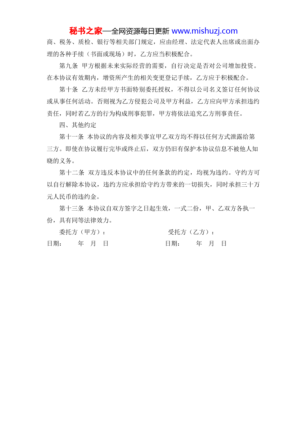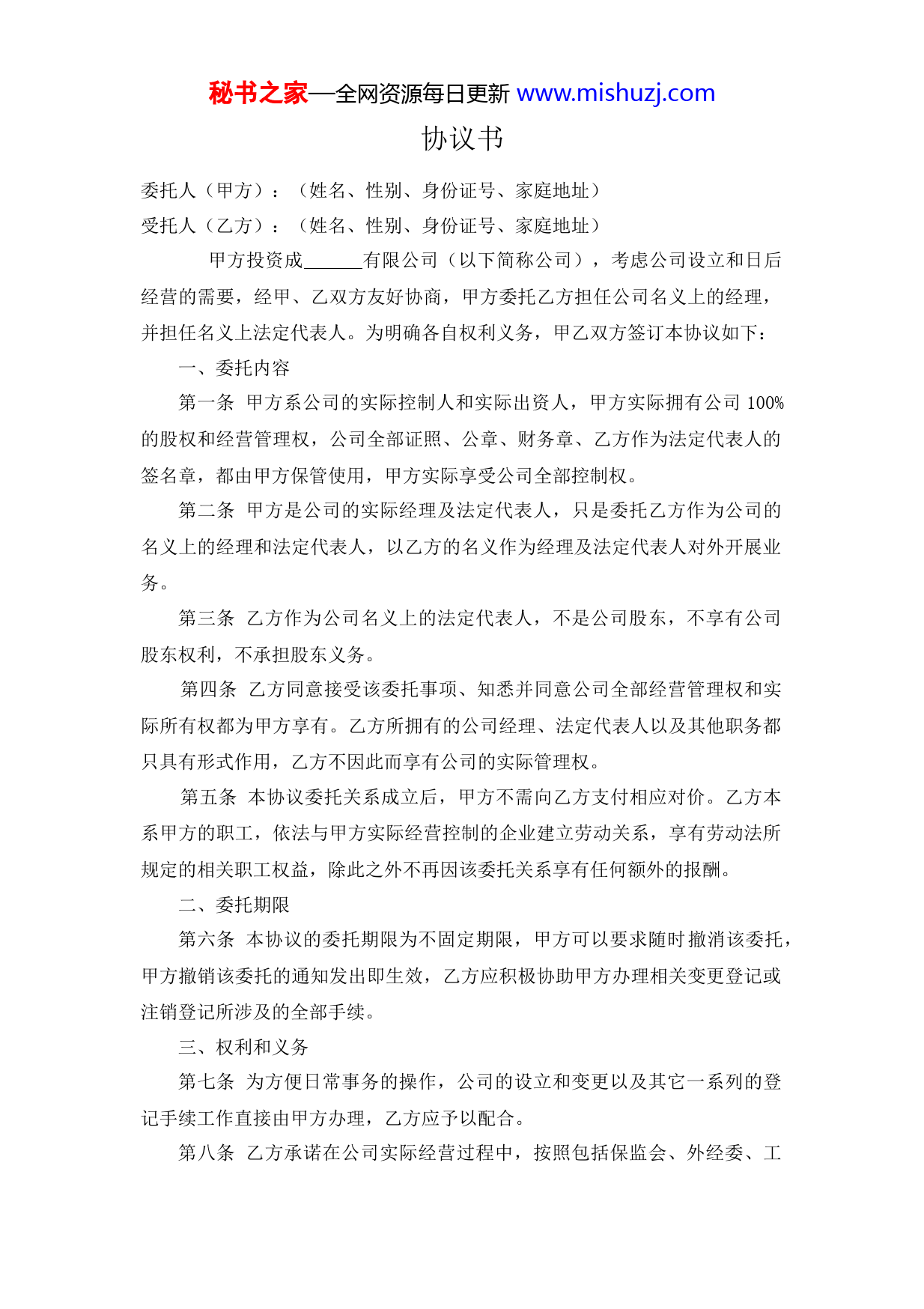 秘书之家—全网资源每日更新www.mishuzj.com协议书委托人(甲方):(姓名、性别、身份证号、家庭地址)受托人(乙方):(姓名、性别、身份证号、家庭地址)甲方投资成有限公司(以下简称公司),考虑公司设立和日后经营的需要,经甲、乙双方友好协商,甲方委托乙方担任公司名义上的经理,并担任名义上法定代表人。为明确各自权利义务,甲乙双方签订本协议如下:一、委托内容第一条甲方系公司的实际控制人和实际出资人,甲方实际拥有公司100%的股权和经营管理权,公司全部证照、公章、财务章、乙方作为法定代表人的签名章,都由甲方保管使用,甲方实际享受公司全部控制权。第二条甲方是公司的实际经理及法定代表人,只是委托乙方作为公司的名义上的经理和法定代表人,以乙方的名义作为经理及法定代表人对外开展业务。第三条乙方作为公司名义上的法定代表人,不是公司股东,不享有公司股东权利,不承担股东义务。第四条乙方同意接受该委托事项、知悉并同意公司全部经营管理权和实际所有权都为甲方享有。乙方所拥有的公司经理、法定代表人以及其他职务都只具有形式作用,乙方不因此而享有公司的实际管理权。第五条本协议委托关系成立后,甲方不需向乙方支付相应对价。乙方本系甲方的职工,依法与甲方实际经营控制的企业建立劳动关系,享有劳动法所规定的相关职工权益,除此之外不再因该委托关系享有任何额外的报酬。二、委托期限第六条本协议的委托期限为不固定期限,甲方可以要求随时撤消该委托,甲方撤销该委托的通知发出即生效,乙方应积极协助甲方办理相关变更登记或注销登记所涉及的全部手续。三、权利和义务第七条为方便日常事务的操作,公司的设立和变更以及其它一系列的登记手续工作直接由甲方办理,乙方应予以配合。第八条乙方承诺在公司实际经营过程中,按照包括保监会、外经委、工秘书之家—全网资源每日更新www.mishuzj.com商、税务、质检、银行等相关部门规定,应由经理、法定代表人出席或出面办理的各种手续(书面或现场)时,乙方应当积极配合。第九条甲方根据未来实际经营的需要,自行决定是否对公司增加投资。在本协议有效期内,增资所产生的相关变更登记手续,乙方应于积极配合。第十条乙方未经甲方书面特别委托授权,不得以公司名义签订任何协议或从事任何活动。否则视为乙方侵犯公司及甲方利益,乙方应向甲方承担违约责任,同时若乙方的行为构成刑事犯罪,甲方将依法追究乙方刑事责任。四、其他约定第十一条本协议的内容及相关事宜甲乙双方均不得以任何方式泄露给第三方。即使在协议履行完毕或终止后,双方仍旧有保护本协议信息不被他人知晓的义务。第十二条双方违反本协议中的任何条款的约定,均视为违约。守约方可以自行解除本协议,违约方应承担给守约方带来的一切损失,同时承担三十万元人民币的违约金。第十三条本协议自双方签字之日起生效,一式二份,甲、乙双方各执一份,具有同等法律效力。委托方(甲方):受托方(乙方):日期:年月日日期:年月日