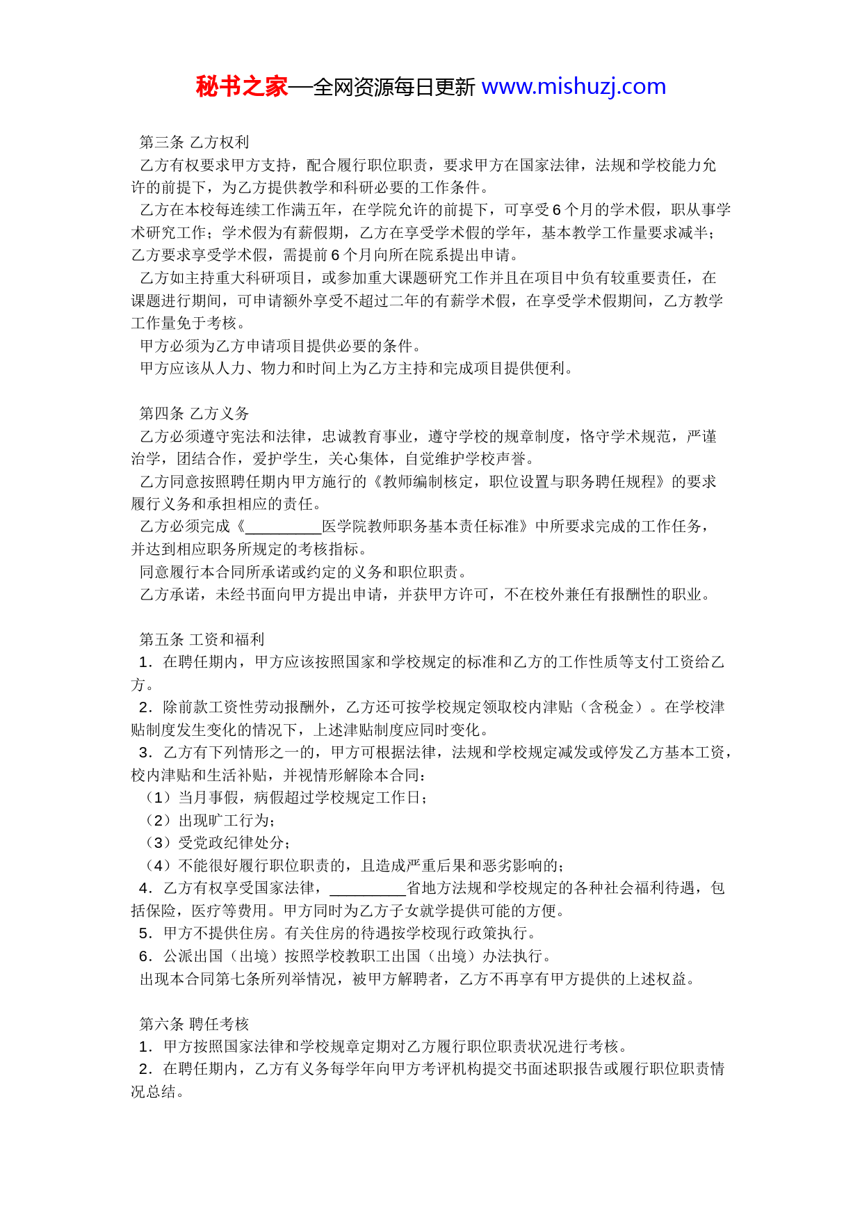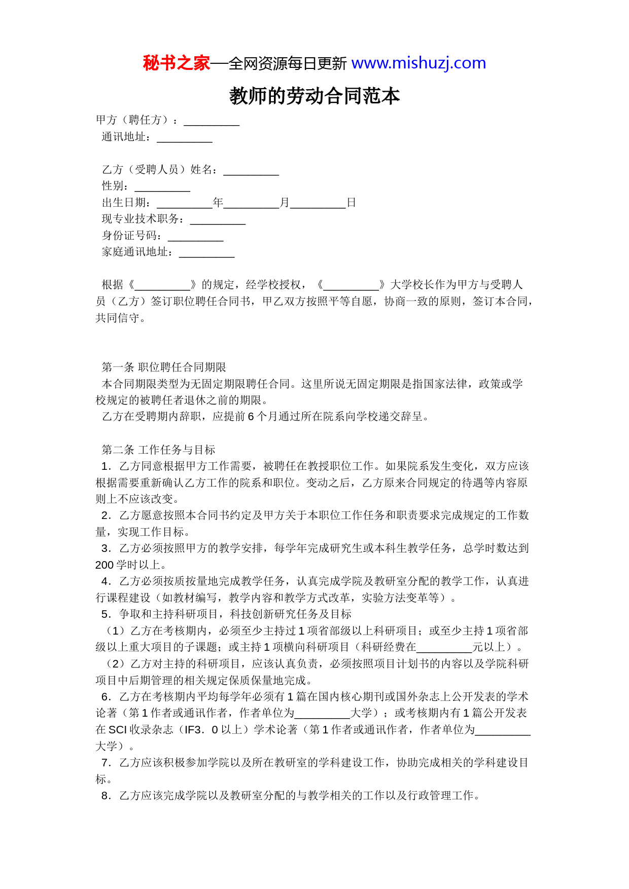 秘书之家—全网资源每日更新www.mishuzj.com教师的劳动合同范本甲方(聘任方):_________通讯地址:_________乙方(受聘人员)姓名:_________性别:_________出生日期:_________年_________月_________日现专业技术职务:_________身份证号码:_________家庭通讯地址:_________根据《_________》的规定,经学校授权,《_________》大学校长作为甲方与受聘人员(乙方)签订职位聘任合同书,甲乙双方按照平等自愿,协商一致的原则,签订本合同,共同信守。第一条职位聘任合同期限本合同期限类型为无固定期限聘任合同。这里所说无固定期限是指国家法律,政策或学校规定的被聘任者退休之前的期限。乙方在受聘期内辞职,应提前6个月通过所在院系向学校递交辞呈。第二条工作任务与目标1.乙方同意根据甲方工作需要,被聘任在教授职位工作。如果院系发生变化,双方应该根据需要重新确认乙方工作的院系和职位。变动之后,乙方原来合同规定的待遇等内容原则上不应该改变。2.乙方愿意按照本合同书约定及甲方关于本职位工作任务和职责要求完成规定的工作数量,实现工作目标。3.乙方必须按照甲方的教学安排,每学年完成研究生或本科生教学任务,总学时数达到200学时以上。4.乙方必须按质按量地完成教学任务,认真完成学院及教研室分配的教学工作,认真进行课程建设(如教材编写,教学内容和教学方式改革,实验方法变革等)。5.争取和主持科研项目,科技创新研究任务及目标(1)乙方在考核期内,必须至少主持过1项省部级以上科研项目;或至少主持1项省部级以上重大项目的子课题;或主持1项横向科研项目(科研经费在_________元以上)。(2)乙方对主持的科研项目,应该认真负责,必须按照项目计划书的内容以及学院科研项目中后期管理的相关规定保质保量地完成。6.乙方在考核期内平均每学年必须有1篇在国内核心期刊或国外杂志上公开发表的学术论著(第1作者或通讯作者,作者单位为_________大学);或考核期内有1篇公开发表在SCI收录杂志(IF3.0以上)学术论著(第1作者或通讯作者,作者单位为_________大学)。7.乙方应该积极参加学院以及所在教研室的学科建设工作,协助完成相关的学科建设目标。8.乙方应该完成学院以及教研室分配的与教学相关的工作以及行政管理工作。秘书之家—全网资源每日更新www.mishuzj.com第三条乙方权利乙方有权要求甲方支持,配合履行职位职责,要求甲方在国家法律,法规和学校能力允许的前提下,为乙方提供教学和科研必要的工作条件。乙方在本校每连续工作满五年,在学院允许的前提下,可享受6个月的学术假,职从事学术研究工作;学术假为有薪假期,乙方在享受学术假的学年,基本教学工作量要求减半;乙方要求享受学术假,需提前6个月向所在院系提出申请。乙方如主持重大科研项目,或参加重大课题研究工作并且在项目中负有较重要责任,在课题进行期间,可申请额外享受不超过二年的有薪学术假,在享受学术假期间,乙方教学工作量免于考核。甲方必须为乙方申请项目提供必要的条件。甲方应该从人力、物力和时间上为乙方主持和完成项目提供便利。第四条乙方义务乙方必须遵守宪法和法律,忠诚教育事业,遵守学校的规章制度,恪守学术规范,严谨治学,团结合作,爱护学生,关心集体,自觉维护学校声誉。乙方同意按照聘任期内甲方施行的《教师编制核定,职位设置与职务聘任规程》的要求履行义务和承担相应的责任。乙方必须完成《_________医学院教师职务基本责任标准》中所要求完成的工作任务,并达到相应职务所规定的考核指标。同意履行本合同所承诺或约定的义务和职位职责。乙方承诺,未经书面向甲方提出申请,并获甲方许可,不在校外兼任有报酬性的职业。第五条工资和福利1.在聘任期内,甲方应该按照国家和学校规定的标准和乙方的工作性质等支付工资给乙方。2.除前款工资性劳动报酬外,乙方还可按学校规定领取校内津贴(含税金)。在学校津贴制度发生变化的情况下,上述津贴制度应同时变化。3.乙方有下列情形之一的,甲方可根据法律,法规和学校规定减发或停发乙方基本工资,校内津贴和生活补贴,并视情形解除本合同:(1)当月事假,病假超过学校规定工作日;(2)出现旷工行为;(3)受党政纪律处分;(4)不能很好履行职位职责的,且造成严重后果和恶劣影响的;4.乙方有权享受国家法律,_________省地方法规和学校规定的各种社会福利待遇,包括保险,医疗等费用。甲方同时为乙方子女就学提供可能的方便。5.甲方不提供住房。有关住房的待遇按学校现行政策执行。6.公派出国(出境)按照学校教职工出国(出境)办法执行。出现本合同第七条所列举情况,被甲方解聘者,乙方不再享有甲方提供的上述权益。第六条聘任考核1.甲方按照国家法律和学校规章定期对乙方履行职位职责状况进行考核。2.在聘任期内,乙方有义务每学年向甲方考评机构提交书面述职报告或履行职位职责情况总结。秘书之家—全网资源每日更新www.mishuzj.com3.考核标准(1)乙方同意按照学校《教师编制核定,职位设置与职务聘任规程》以及《_________》中所列各项内容与指标进行考核。(2)本合同第二条和第四条之约定。4.乙方同意按照甲方的考核办法接受考核。5.考核结果作为工资,职位津贴发放和继续聘任的依据。若乙方经考核不合格,则甲方有权视情况减发或停发工资,职位津贴,甚至可以根据实际情况解除本