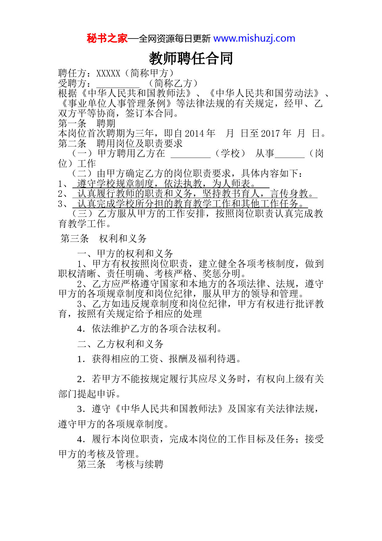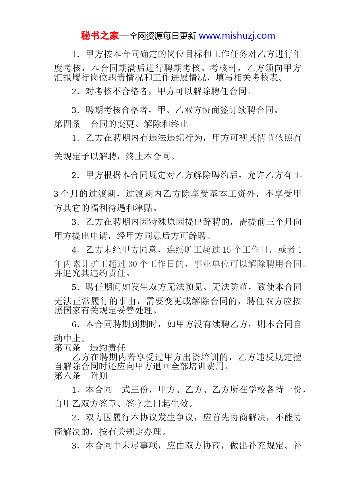 秘书之家—全网资源每日更新www.mishuzj.com教师聘任合同聘任方:XXXXX(简称甲方)受聘方:_________(简称乙方)根据《中华人民共和国教师法》、《中华人民共和国劳动法》、《事业单位人事管理条例》等法律法规的有关规定,经甲、乙双方平等协商,签订本合同。第一条聘期本岗位首次聘期为三年,即自2014年月日至2017年月日。第二条聘用岗位及职责要求(一)甲方聘用乙方在(学校)从事(岗位)工作(二)由甲方确定乙方的岗位职责要求,具体内容如下:1、遵守学校规章制度,依法执教,为人师表。2、认真履行教师的职责和义务,坚持教书育人,言传身教。3、认真完成学校所分担的教育教学工作和其他工作任务。(三)乙方服从甲方的工作安排,按照岗位职责认真完成教育教学工作。第三条权利和义务一、甲方的权利和义务1、甲方有权按照岗位职责,建立健全各项考核制度,做到职权清晰、责任明确、考核严格、奖惩分明。2、乙方应严格遵守国家和本地方的各项法律、法规,遵守甲方的各项规章制度和岗位纪律,服从甲方的领导和管理。3、乙方如违反规章制度和岗位纪律,甲方有权进行批评教育,按照有关规定给予相应的处理4.依法维护乙方的各项合法权利。二、乙方权利和义务1.获得相应的工资、报酬及福利待遇。2.若甲方不能按规定履行其应尽义务时,有权向上级有关部门提起申诉。3.遵守《中华人民共和国教师法》及国家有关法律法规,遵守甲方的各项规章制度。4.履行本岗位职责,完成本岗位的工作目标及任务;接受甲方的考核及管理。第三条考核与续聘秘书之家—全网资源每日更新www.mishuzj.com1.甲方按本合同确定的岗位目标和工作任务对乙方进行年度考核,本合同期满后进行聘期考核。考核时,乙方须向甲方汇报履行岗位职责情况和工作进展情况,填写相关考核表。2.对考核不合格者,甲方可以解除聘任合同。3.聘期考核合格者,甲、乙双方协商签订续聘合同。第四条合同的变更、解除和终止1.乙方在聘期内有违法违纪行为,甲方可视其情节依照有关规定予以解聘,终止本合同。2.甲方根据本合同规定对乙方解除聘约后,允许乙方有1-3个月的过渡期,过渡期内乙方除享受基本工资外,不享受甲方其它的福利待遇和津贴。3.乙方在聘期内因特殊原因提出辞聘的,需提前三个月向甲方提出申请,经甲方同意后方可辞聘。4.乙方未经甲方同意,连续旷工超过15个工作日,或者1年内累计旷工超过30个工作日的,事业单位可以解除聘用合同。并追究其违约责任。5.聘任期间如发生双方无法预见、无法防范,致使本合同无法正常履行的事由,需要变更或解除合同的,聘任双方应按照国家有关规定妥善处理。6.本合同聘期到期时,如甲方没有续聘乙方,则本合同自动中止。第五条违约责任乙方在聘期内若享受过甲方出资培训的,乙方违反规定擅自解除合同时还应向甲方退回全部培训费用。第六条附则1.本合同一式三份,甲方、乙方、乙方所在学校各持一份,自甲乙双方签章、签字之日起生效。2.双方因履行本协议发生争议,应首先协商解决,不能协商解决的,按有关规定办理。3.本合同中未尽事项,应由双方协商,做出补充规定。补秘书之家—全网资源每日更新www.mishuzj.com充规定与本合同具有同等效力。第七条其他说明按(辽中政发〔2014〕16号)规定:1.男57周岁(1957年8月1日以前出生),女52周岁以上(1962年8月1日以前出生),不参加此次竞聘,由校长安排相关工作。2.竞聘前连续病休半年(含半年)以上人员(按辽中委办发〔2013〕19号文件要求经教育局备案的),经学校公示无异议的,不参加竞聘,病休结束后由学校另行安排工作,如学校出现空岗情况,参加竞聘。第八条.双方议定其他事项(乙方签写):乙方服从甲方的工作安排。甲方(盖章):_________乙方(签字):_______________年____月____日_____年____月____日秘书之家—全网资源每日更新www.mishuzj.com编号:聘用合同书聘用单位(甲方)XX小学受聘人(乙方)XX年XX月制