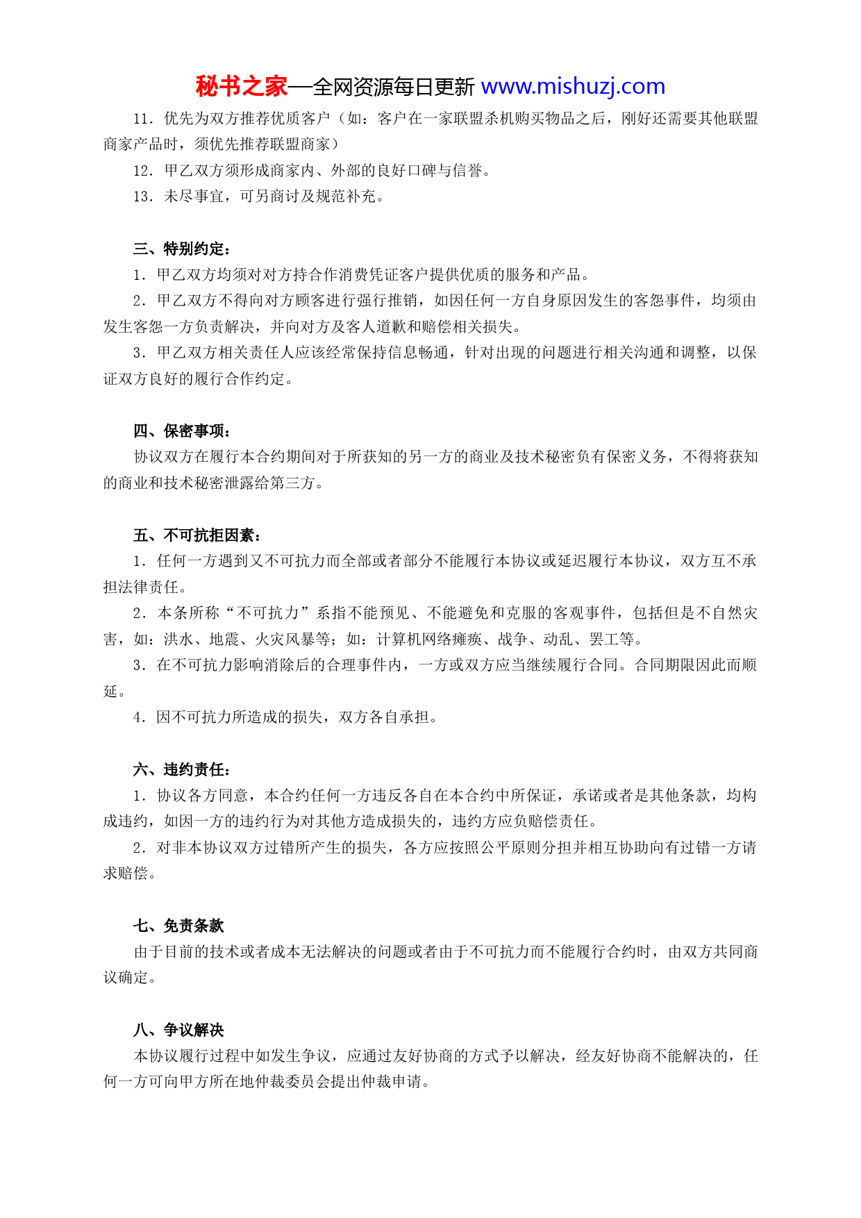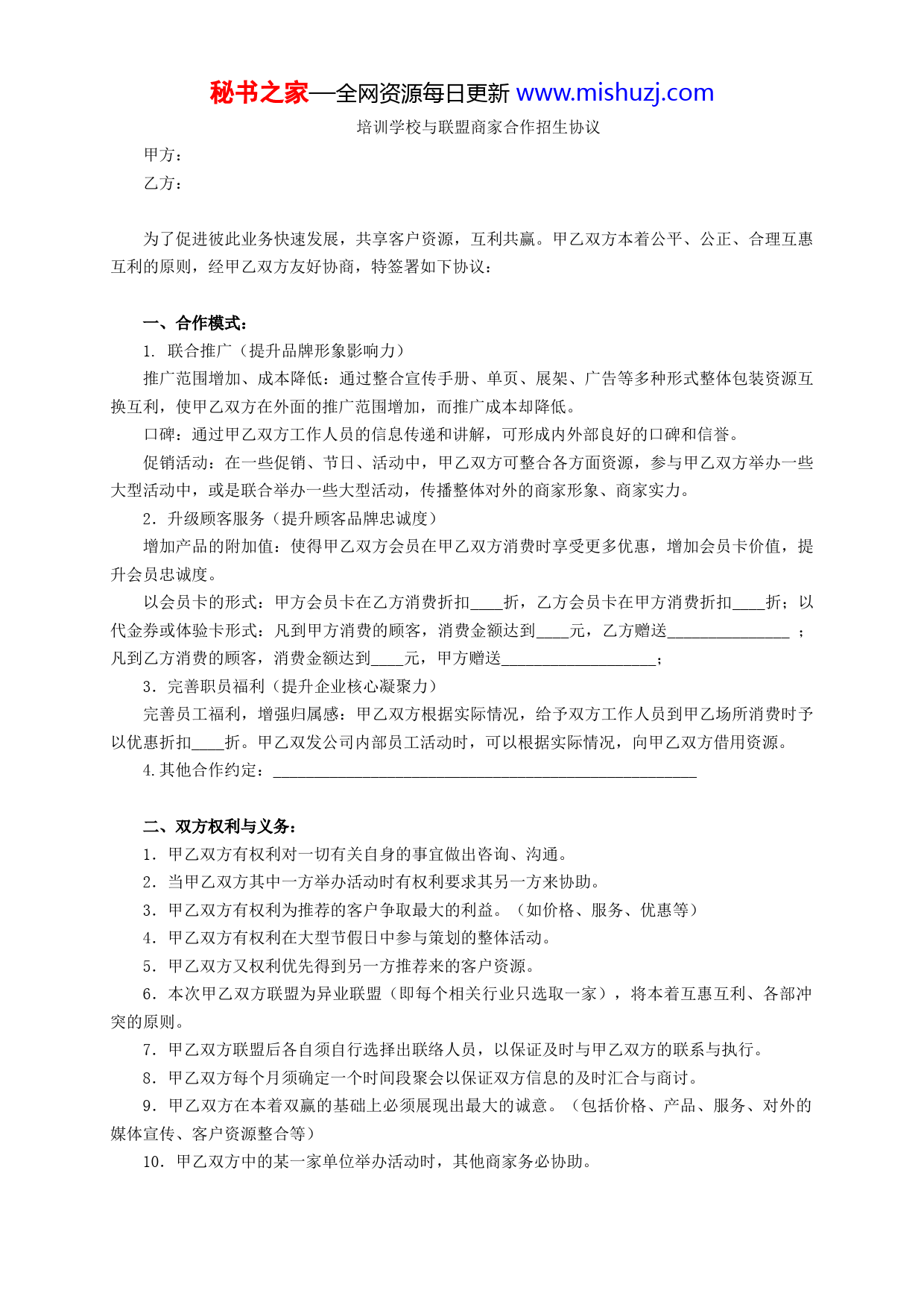 秘书之家—全网资源每日更新www.mishuzj.com培训学校与联盟商家合作招生协议甲方:乙方:为了促进彼此业务快速发展,共享客户资源,互利共赢。甲乙双方本着公平、公正、合理互惠互利的原则,经甲乙双方友好协商,特签署如下协议:一、合作模式:1.联合推广(提升品牌形象影响力)推广范围增加、成本降低:通过整合宣传手册、单页、展架、广告等多种形式整体包装资源互换互利,使甲乙双方在外面的推广范围增加,而推广成本却降低。口碑:通过甲乙双方工作人员的信息传递和讲解,可形成内外部良好的口碑和信誉。促销活动:在一些促销、节日、活动中,甲乙双方可整合各方面资源,参与甲乙双方举办一些大型活动中,或是联合举办一些大型活动,传播整体对外的商家形象、商家实力。2.升级顾客服务(提升顾客品牌忠诚度)增加产品的附加值:使得甲乙双方会员在甲乙双方消费时享受更多优惠,增加会员卡价值,提升会员忠诚度。以会员卡的形式:甲方会员卡在乙方消费折扣____折,乙方会员卡在甲方消费折扣____折;以代金券或体验卡形式:凡到甲方消费的顾客,消费金额达到____元,乙方赠送_______________;凡到乙方消费的顾客,消费金额达到____元,甲方赠送___________________;3.完善职员福利(提升企业核心凝聚力)完善员工福利,增强归属感:甲乙双方根据实际情况,给予双方工作人员到甲乙场所消费时予以优惠折扣____折。甲乙双发公司内部员工活动时,可以根据实际情况,向甲乙双方借用资源。4.其他合作约定:____________________________________________________二、双方权利与义务:1.甲乙双方有权利对一切有关自身的事宜做出咨询、沟通。2.当甲乙双方其中一方举办活动时有权利要求其另一方来协助。3.甲乙双方有权利为推荐的客户争取最大的利益。(如价格、服务、优惠等)4.甲乙双方有权利在大型节假日中参与策划的整体活动。5.甲乙双方又权利优先得到另一方推荐来的客户资源。6.本次甲乙双方联盟为异业联盟(即每个相关行业只选取一家),将本着互惠互利、各部冲突的原则。7.甲乙双方联盟后各自须自行选择出联络人员,以保证及时与甲乙双方的联系与执行。8.甲乙双方每个月须确定一个时间段聚会以保证双方信息的及时汇合与商讨。9.甲乙双方在本着双赢的基础上必须展现出最大的诚意。(包括价格、产品、服务、对外的媒体宣传、客户资源整合等)10.甲乙双方中的某一家单位举办活动时,其他商家务必协助。秘书之家—全网资源每日更新www.mishuzj.com11.优先为双方推荐优质客户(如:客户在一家联盟杀机购买物品之后,刚好还需要其他联盟商家产品时,须优先推荐联盟商家)12.甲乙双方须形成商家内、外部的良好口碑与信誉。13.未尽事宜,可另商讨及规范补充。三、特别约定:1.甲乙双方均须对对方持合作消费凭证客户提供优质的服务和产品。2.甲乙双方不得向对方顾客进行强行推销,如因任何一方自身原因发生的客怨事件,均须由发生客怨一方负责解决,并向对方及客人道歉和赔偿相关损失。3.甲乙双方相关责任人应该经常保持信息畅通,针对出现的问题进行相关沟通和调整,以保证双方良好的履行合作约定。四、保密事项:协议双方在履行本合约期间对于所获知的另一方的商业及技术秘密负有保密义务,不得将获知的商业和技术秘密泄露给第三方。五、不可抗拒因素:1.任何一方遇到又不可抗力而全部或者部分不能履行本协议或延迟履行本协议,双方互不承担法律责任。2.本条所称“不可抗力”系指不能预见、不能避免和克服的客观事件,包括但是不自然灾害,如:洪水、地震、火灾风暴等;如:计算机网络瘫痪、战争、动乱、罢工等。3.在不可抗力影响消除后的合理事件内,一方或双方应当继续履行合同。合同期限因此而顺延。4.因不可抗力所造成的损失,双方各自承担。六、违约责任:1.协议各方同意,本合约任何一方违反各自在本合约中所保证,承诺或者是其他条款,均构成违约,如因一方的违约行为对其他方造成损失的,违约方应负赔偿责任。2.对非本协议双方过错所产生的损失,各方应按照公平原则分担并相互协助向有过错一方请求赔偿。七、免责条款由于目前的技术或者成本无法解决的问题或者由于不可抗力而不能履行合约时,由双方共同商议确定。八、争议解决本协议履行过程中如发生争议,应通过友好协商的方式予以解决,经友好协商不能解决的,任何一方可向甲方所在地仲裁委员会提出仲裁申请。秘书之家—全网资源每日更新www.mishuzj.com九、协议终止下列情况之一出现时,本合作协议被视为即时终止:1.协议期限满;2.甲乙双方书面协议提前终止本合作协议;3.任何一方违约,另一方根据合作协议的约定提前终止;4.协议终止后,有关客户纠纷由违约方负责承担。同时双方应在30天内销毁所有使用的对方服务标识。十、附责:1.如本合同中的任何一款与国家相关法律法规又冲突时,按照国家相关法律法规执行。2.本和同未尽事宜,双方可签订补充协议或以附件形式对相关问题做出补充、说明和解释。补充本合同或者附件经甲乙双方签字盖章后生效,是本合同不可分割的一部分,与本合同具有同等法律效力。3.本协议有效期:自______年____月____日起至______年____月____日止,有效期为____年。本协议有效期满后,双方如需继续合作,则需要在协议期满前1个月以书面形式通知对方,经过商谈