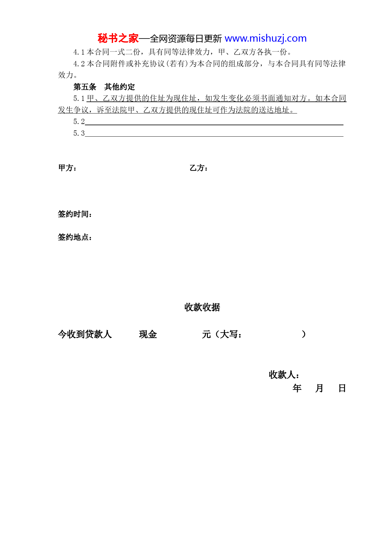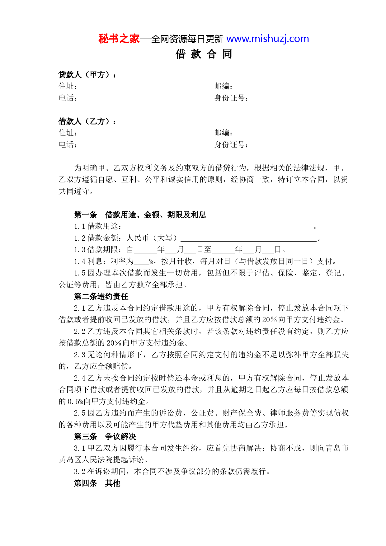 秘书之家—全网资源每日更新www.mishuzj.com借款合同贷款人(甲方):邮编:住址:身份证号:电话:借款人(乙方):邮编:住址:身份证号:电话:为明确甲、乙双方权利义务及约束双方的借贷行为,根据相关的法律法规,甲、乙双方遵循自愿、互利、公平和诚实信用的原则,经协商一致,特订立本合同,以资共同遵守。第一条借款用途、金额、期限及利息1.1借款用途:。1.2借款金额:人民币(大写)。1.3借款期限:自年月日至年月日。1.4利息:利率为%,按月计收,每月对日(与借款发放日同一日)支付。1.5因办理本次借款而发生一切费用,包括但不限于评估、保险、鉴定、登记、公证等费用,皆由乙方独立全部承担。第二条违约责任2.1乙方违反本合同约定借款用途的,甲方有权解除合同,停止发放本合同项下借款或者提前收回已发放的借款,并且乙方应按借款总额的20%向甲方支付违约金。2.2乙方违反本合同其它相关条款时,若该条款对违约责任没有约定,则乙方应按借款总额的20%向甲方支付违约金。2.3无论何种情形下,乙方按照合同约定支付的违约金不足以弥补甲方全部损失的,乙方应全额赔偿。2.4乙方未按合同约定按时偿还本金或利息的,甲方有权解除合同,停止发放本合同项下借款或者提前收回已发放的借款,并且从逾期之日起乙方应每日按借款总额的0.5%向甲方支付违约金。2.5因乙方违约而产生的诉讼费、公证费、财产保全费、律师服务费等实现债权的各种费用以及可能产生的甲方代垫费用和其他费用均由乙方承担。第三条争议解决3.1甲乙双方因履行本合同发生纠纷,应首先协商解决;协商不成,则向青岛市黄岛区人民法院提起诉讼。3.2在诉讼期间,本合同不涉及争议部分的条款仍需履行。第四条其他秘书之家—全网资源每日更新www.mishuzj.com4.1本合同一式二份,具有同等法律效力,甲、乙双方各执一份。4.2本合同附件或补充协议(若有)为本合同的组成部分,与本合同具有同等法律效力。第五条其他约定5.1甲、乙双方提供的住址为现住址,如发生变化必须书面通知对方。如本合同发生争议,诉至法院甲、乙双方提供的现住址可作为法院的送达地址。5.25.3甲方:乙方:签约时间:签约地点:收款收据今收到贷款人现金元(大写:)收款人:年月日秘书之家—全网资源每日更新www.mishuzj.com借款人配偶声明与承诺本人与借款人系夫妻关系。本人已知悉借款人向贷款人借款一事,特作出如下声明与承诺:本人同意借款人的上述借款行为,该借款为夫妻共同债务。特此声明与承诺。借款人配偶人:(签字)身份证号:签署日期:联系电话: