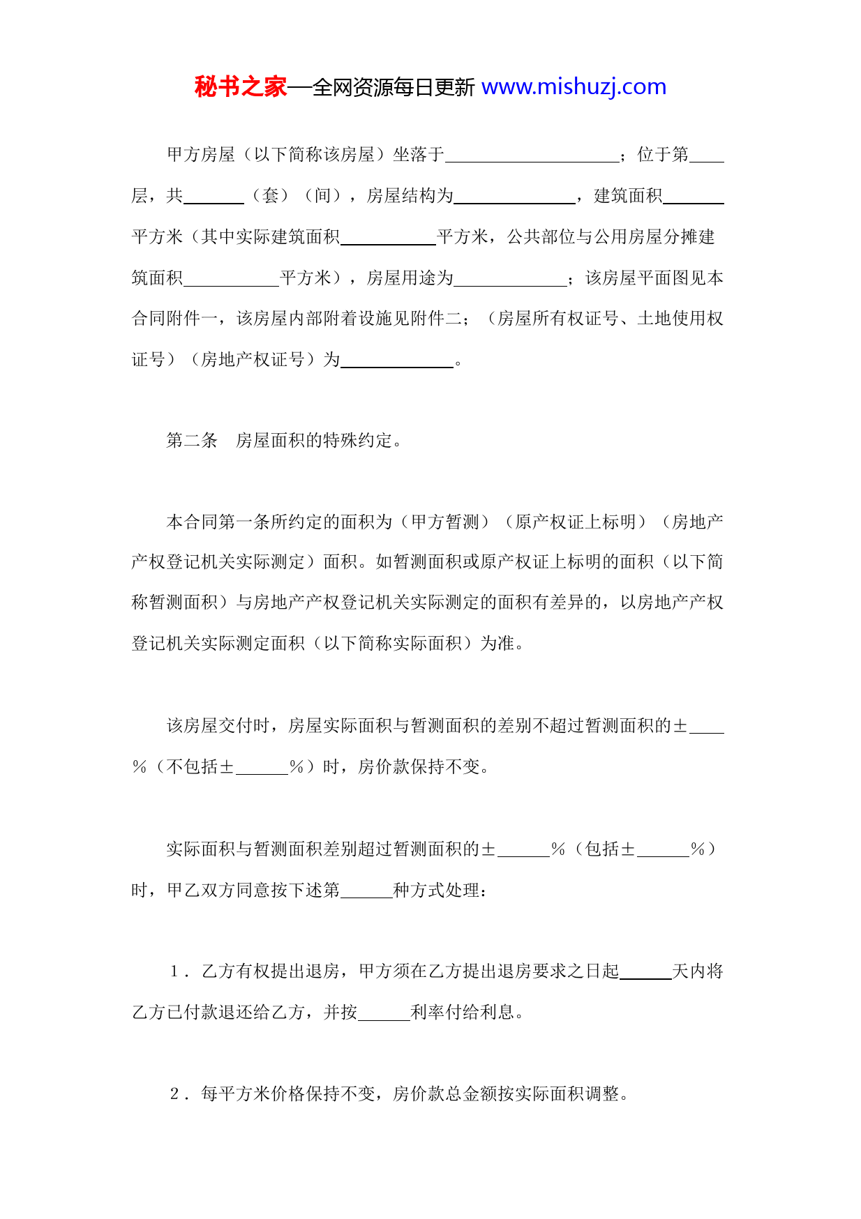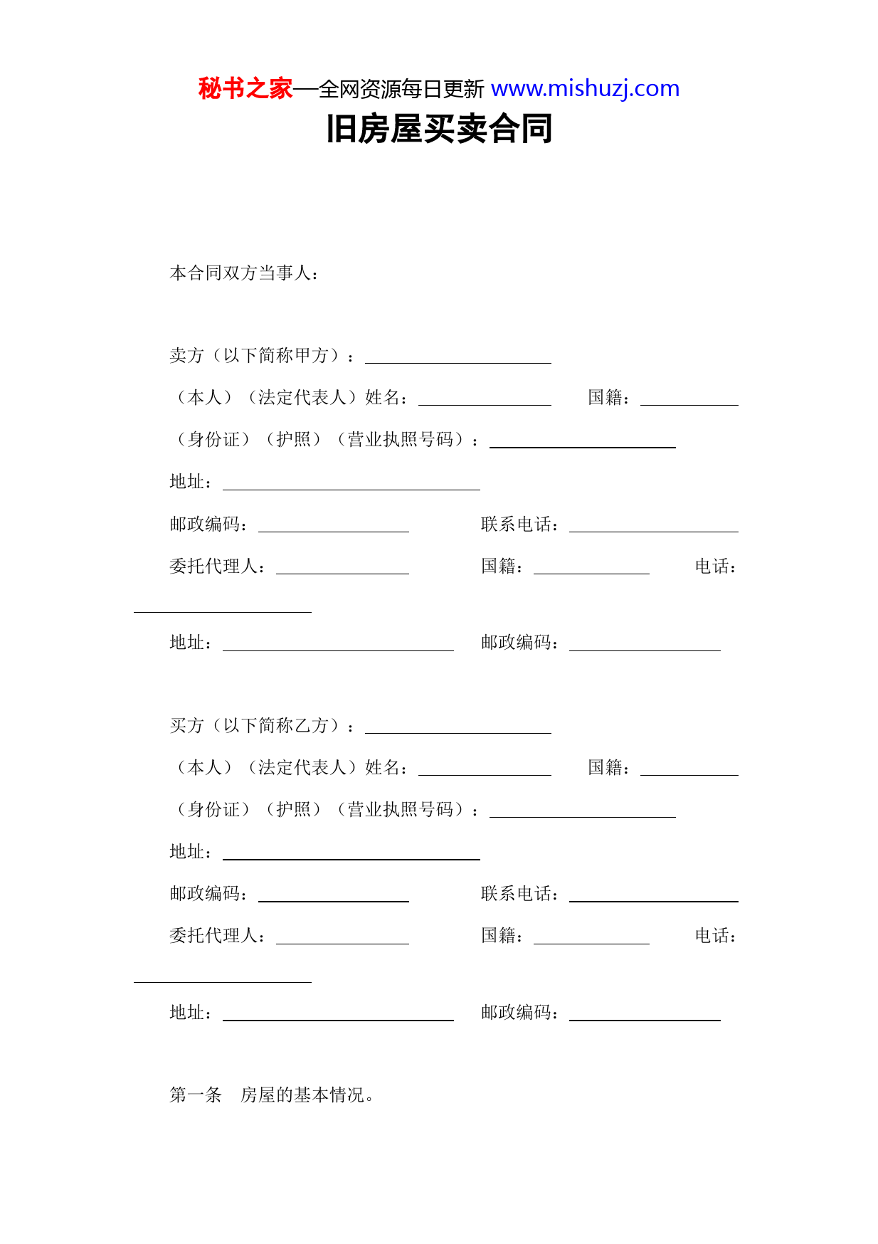 秘书之家—全网资源每日更新www.mishuzj.com旧房屋买卖合同本合同双方当事人:卖方(以下简称甲方):(本人)(法定代表人)姓名:国籍:(身份证)(护照)(营业执照号码):地址:邮政编码:联系电话:委托代理人:国籍:电话:地址:邮政编码:买方(以下简称乙方):(本人)(法定代表人)姓名:国籍:(身份证)(护照)(营业执照号码):地址:邮政编码:联系电话:委托代理人:国籍:电话:地址:邮政编码:第一条房屋的基本情况。秘书之家—全网资源每日更新www.mishuzj.com甲方房屋(以下简称该房屋)坐落于;位于第层,共(套)(间),房屋结构为,建筑面积平方米(其中实际建筑面积平方米,公共部位与公用房屋分摊建筑面积平方米),房屋用途为;该房屋平面图见本合同附件一,该房屋内部附着设施见附件二;(房屋所有权证号、土地使用权证号)(房地产权证号)为。第二条房屋面积的特殊约定。本合同第一条所约定的面积为(甲方暂测)(原产权证上标明)(房地产产权登记机关实际测定)面积。如暂测面积或原产权证上标明的面积(以下简称暂测面积)与房地产产权登记机关实际测定的面积有差异的,以房地产产权登记机关实际测定面积(以下简称实际面积)为准。该房屋交付时,房屋实际面积与暂测面积的差别不超过暂测面积的±%(不包括±%)时,房价款保持不变。实际面积与暂测面积差别超过暂测面积的±%(包括±%)时,甲乙双方同意按下述第种方式处理:1.乙方有权提出退房,甲方须在乙方提出退房要求之日起天内将乙方已付款退还给乙方,并按利率付给利息。2.每平方米价格保持不变,房价款总金额按实际面积调整。秘书之家—全网资源每日更新www.mishuzj.com3.。第三条土地使用权性质。该房屋相应的土地使用权取得方式为;土地使用权年限自年月日至年月日止。以划拨方式取得土地使用权的房地产转让批准文件号为;该房屋买卖后,按照有关规定,乙方(必须)(无须)补办土地使用权出让手续。第四条价格。按(总建筑面积)(实际建筑面积)计算,该房屋售价为(币)每平方米元,总金额为(币)亿千百拾万千百拾元整。第五条付款方式。乙方应于本合同生效之日向甲方支付定金(币)亿千百拾万千百拾元整,并应于本合同生效之日起日内将该房屋全部价款付给甲方。具体付款方式可由双方另行约定。第六条交付期限。秘书之家—全网资源每日更新www.mishuzj.com甲方应于本合同生效之日起三十日内,将该房屋的产权证书交给乙方,并应收到该房屋全部价款之日起日内,将该房屋付给乙方。第七条乙方逾期付款的违约责任。乙方如未按本合同第四条规定的时间付款,甲方对乙方的逾期应付款有权追究违约利息。自本合同规定的应付款限期之第二天起至实际付款之日止,月利息按计算。逾期超过天后,即视为乙方不履行本合同。届时,甲方有权按下述第种约定,追究乙方的违约责任。1.终止合同,乙方按累计应付款的%向甲方支付违约金。甲方实际经济损失超过乙方支付的违约金时,实际经济损失与违约金的差额部分由乙方据实赔偿。2.乙方按累计应付款的%向甲方支付违约金,合同继续履行。3.。第八条甲方逾期交付房屋的违约责任。除人力不可抗拒的自然灾害等特殊情况外,甲方如未按本合同第五条规定的期限将该房屋交给乙方使用,乙方有权按已交付的房价款向甲方追究违约利息。按本合同第十一条规定的最后交付期限的第二天起至实际交付之日止,月利息在个月内按利率计算;自第个月起,月利息秘书之家—全网资源每日更新www.mishuzj.com则按利率计算。逾期超过个月,则视为甲方不履行本合同,乙方有权按下列第种约定,追究甲方的违约责任。1.终止合同,甲方按乙方累计已付款的%向乙方支付违约金。乙方实际经济损失超过甲方支付的违约金时,实际经济损失与违约金的差额部分由甲方据实赔偿。2.甲方按乙方累计已付款的%向乙方支付违约金,合同继续履行。3.。第九条关于产权登记的约定。在乙方实际接收该房屋之日起,甲方协助乙方在房地产产权登记机关规定的期限内向房地产产权登记机关办理权属登记手续。如因甲方的过失造成乙方不能在双方实际交接之日起天内取得房地产权属证书,乙方有权提出退房,甲方须在乙方提出退房要求之日起天内将乙方已付款退还给乙方,并按已付款的%赔偿乙方损失。第十条甲方保证在交易时该房屋没有产权纠纷,有关按揭、抵押债务、税项及租金等,甲方均在交易前办妥。交易后如有上述未清事项,由甲方承担全部责任。秘书之家—全网资源每日更新www.mishuzj.com第十一条因本房屋所有权转移所发生的土地增值税由甲方向国家交纳,契税由乙方向国家交纳;其他房屋交易所发生的税费除另有约定的外,均按政府的规定由甲乙双方分别交纳。第十二条本合同未尽事项,由甲、乙双方另行议定,并签订补充协议。第十三条本合同之附件均为本合同不可分割之一部分。本合同及其附件内,空格部分填写的文字与印刷文字具有同等效力。本合同及其附件和补充协议中未规定的事项,均遵照中华人民共和国有关法律、法规和政策执行。第十四条甲、乙一方或双方为境外组织或个人的,本合同应经该房屋所在地公证机关公证。第十五条本合同在履行中发生争议,由甲、乙双方协商解决。协商不成时,甲、乙双方同意由仲裁委员会仲裁。(甲、乙双方不在本合同中约定仲裁机构,事后又没有达成书面仲裁协议的