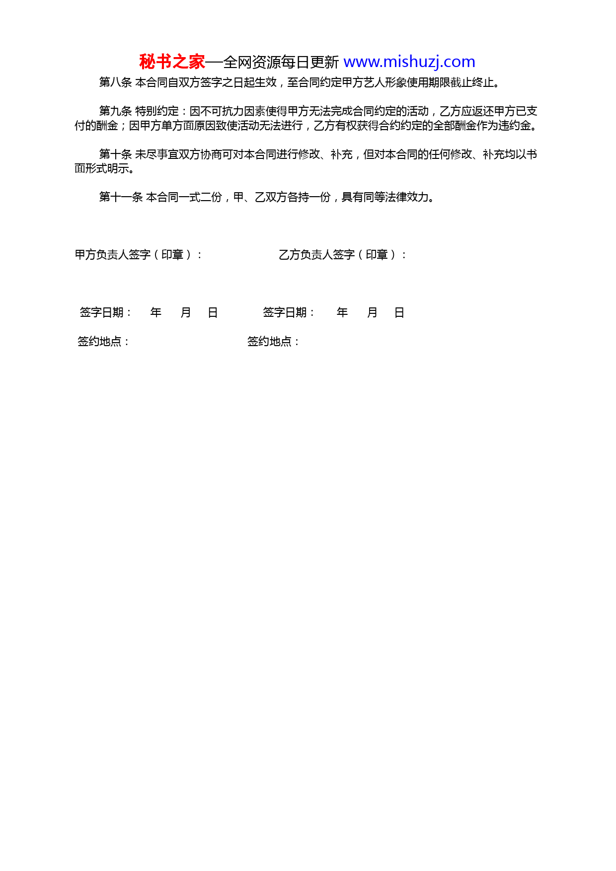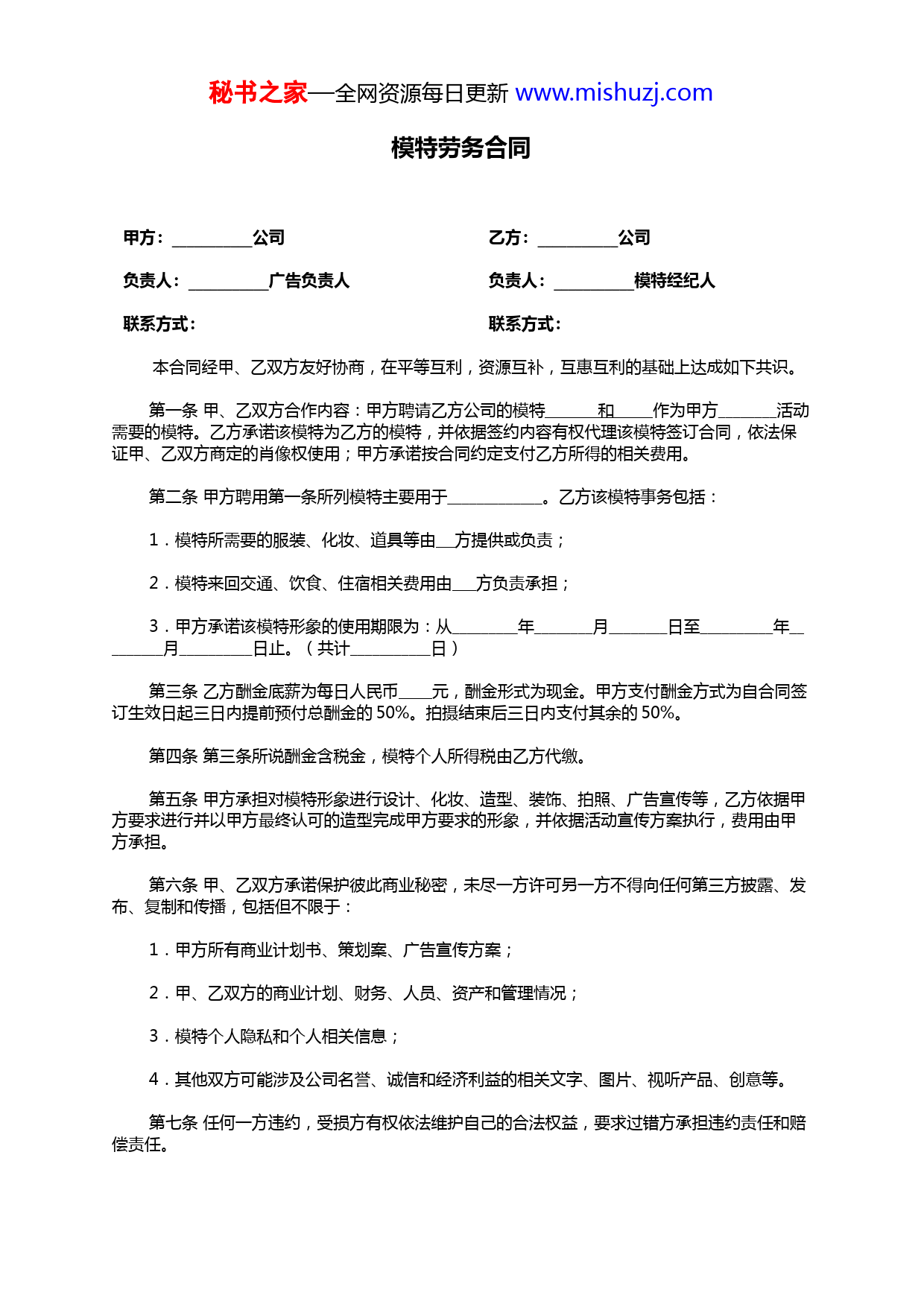 秘书之家—全网资源每日更新www.mishuzj.com模特劳务合同甲方:___________公司乙方:___________公司负责人:___________广告负责人负责人:___________模特经纪人联系方式:联系方式:本合同经甲、乙双方友好协商,在平等互利,资源互补,互惠互利的基础上达成如下共识。第一条甲、乙双方合作内容:甲方聘请乙方公司的模特和作为甲方________活动需要的模特。乙方承诺该模特为乙方的模特,并依据签约内容有权代理该模特签订合同,依法保证甲、乙双方商定的肖像权使用;甲方承诺按合同约定支付乙方所得的相关费用。第二条甲方聘用第一条所列模特主要用于_____________。乙方该模特事务包括:1.模特所需要的服装、化妆、道具等由方提供或负责;2.模特来回交通、饮食、住宿相关费用由方负责承担;3.甲方承诺该模特形象的使用期限为:从_________年________月________日至__________年_________月__________日止。(共计___________日)第三条乙方酬金底薪为每日人民币元,酬金形式为现金。甲方支付酬金方式为自合同签订生效日起三日内提前预付总酬金的50%。拍摄结束后三日内支付其余的50%。第四条第三条所说酬金含税金,模特个人所得税由乙方代缴。第五条甲方承担对模特形象进行设计、化妆、造型、装饰、拍照、广告宣传等,乙方依据甲方要求进行并以甲方最终认可的造型完成甲方要求的形象,并依据活动宣传方案执行,费用由甲方承担。第六条甲、乙双方承诺保护彼此商业秘密,未尽一方许可另一方不得向任何第三方披露、发布、复制和传播,包括但不限于:1.甲方所有商业计划书、策划案、广告宣传方案;2.甲、乙双方的商业计划、财务、人员、资产和管理情况;3.模特个人隐私和个人相关信息;4.其他双方可能涉及公司名誉、诚信和经济利益的相关文字、图片、视听产品、创意等。第七条任何一方违约,受损方有权依法维护自己的合法权益,要求过错方承担违约责任和赔偿责任。秘书之家—全网资源每日更新www.mishuzj.com第八条本合同自双方签字之日起生效,至合同约定甲方艺人形象使用期限截止终止。第九条特别约定:因不可抗力因素使得甲方无法完成合同约定的活动,乙方应返还甲方已支付的酬金;因甲方单方面原因致使活动无法进行,乙方有权获得合约约定的全部酬金作为违约金。第十条未尽事宜双方协商可对本合同进行修改、补充,但对本合同的任何修改、补充均以书面形式明示。第十一条本合同一式二份,甲、乙双方各持一份,具有同等法律效力。甲方负责人签字(印章):乙方负责人签字(印章):签字日期:年月日签字日期:年月日签约地点:签约地点: