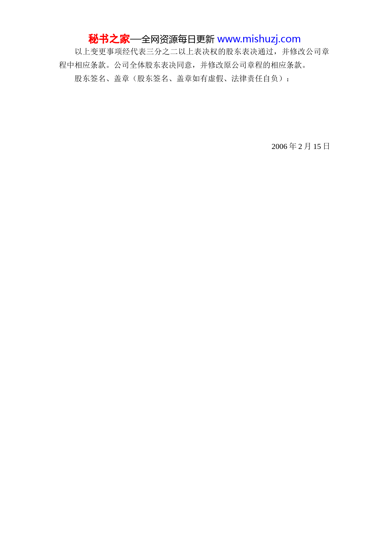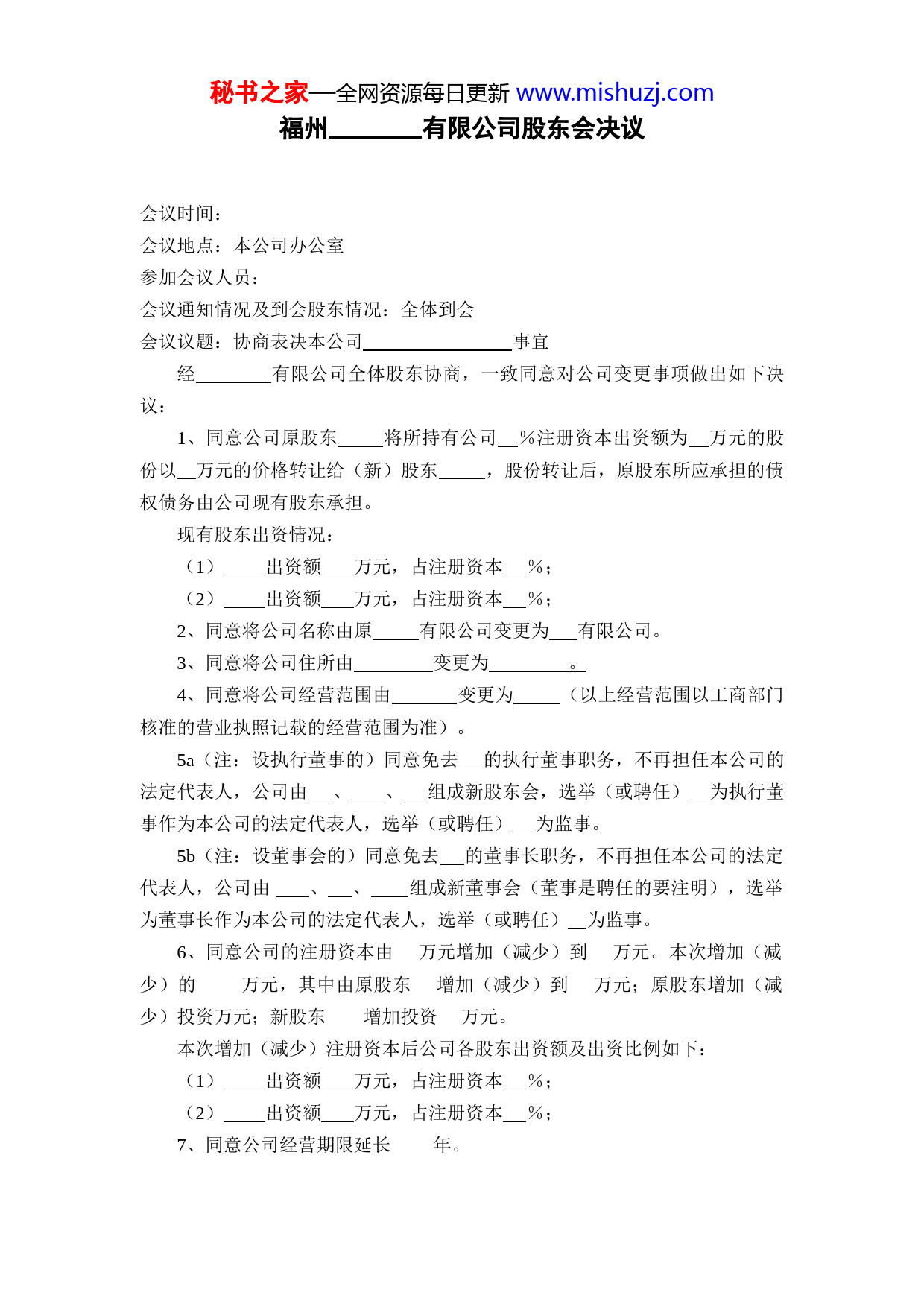 秘书之家—全网资源每日更新www.mishuzj.com福州有限公司股东会决议会议时间:会议地点:本公司办公室参加会议人员:会议通知情况及到会股东情况:全体到会会议议题:协商表决本公司事宜经有限公司全体股东协商,一致同意对公司变更事项做出如下决议:1、同意公司原股东将所持有公司%注册资本出资额为万元的股份以万元的价格转让给(新)股东,股份转让后,原股东所应承担的债权债务由公司现有股东承担。现有股东出资情况:(1)出资额万元,占注册资本%;(2)出资额万元,占注册资本%;2、同意将公司名称由原有限公司变更为有限公司。3、同意将公司住所由变更为。4、同意将公司经营范围由变更为(以上经营范围以工商部门核准的营业执照记载的经营范围为准)。5a(注:设执行董事的)同意免去的执行董事职务,不再担任本公司的法定代表人,公司由、、组成新股东会,选举(或聘任)为执行董事作为本公司的法定代表人,选举(或聘任)为监事。5b(注:设董事会的)同意免去的董事长职务,不再担任本公司的法定代表人,公司由、、组成新董事会(董事是聘任的要注明),选举为董事长作为本公司的法定代表人,选举(或聘任)为监事。6、同意公司的注册资本由万元增加(减少)到万元。本次增加(减少)的万元,其中由原股东增加(减少)到万元;原股东增加(减少)投资万元;新股东增加投资万元。本次增加(减少)注册资本后公司各股东出资额及出资比例如下:(1)出资额万元,占注册资本%;(2)出资额万元,占注册资本%;7、同意公司经营期限延长年。秘书之家—全网资源每日更新www.mishuzj.com以上变更事项经代表三分之二以上表决权的股东表决通过,并修改公司章程中相应条款。公司全体股东表决同意,并修改原公司章程的相应条款。股东签名、盖章(股东签名、盖章如有虚假、法律责任自负):2006年2月15日