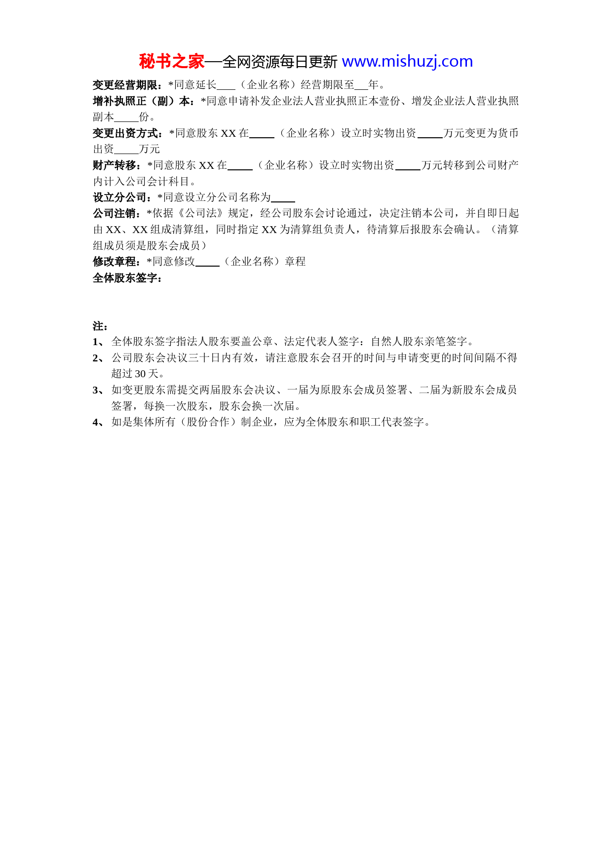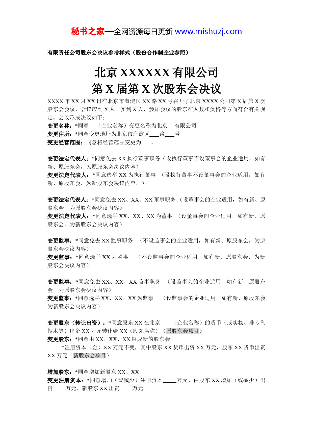 秘书之家—全网资源每日更新www.mishuzj.com有限责任公司股东会决议参考样式(股份合作制企业参照)北京XXXXXX有限公司第X届第X次股东会决议XXXX年XX月XX日在北京市海淀区XX路XX号召开了北京XXXX公司第X届第X次股东会会议,会议应到X人,实到X人,参加会议的股东在人数和资格等方面符合有关规定,会议形成决议如下:变更名称:同意(企业名称)变更名称为北京有限公司变更住所:同意变更地址为北京市海淀区路号变更经营范围:同意将经营范围变更为。变更法定代表人:同意免去XX执行董事职务(设执行董事不设董事会的企业适用,如有新、原股东会,为原股东会决议内容)变更法定代表人:同意选举XX为执行董事(设执行董事不设董事会的企业适用,如有新、原股东会,为新股东会决议内容,)变更法定代表人:同意免去XX、XX、XX董事职务(设董事会的企业适用,如有新、原股东会,为原股东会决议内容)变更法定代表人:同意选举XX、XX、XX为董事(设董事会的企业适用,如有新、原股东会,为新股东会决议内容)变更监事:同意免去XX监事职务(不设监事会的企业适用,如有新、原股东会,为原股东会决议内容)变更监事:同意选举XX为监事(不设监事会的企业适用,如有新、原股东会,为新股东会决议内容)变更监事:同意免去XX、XX、XX监事职务(设监事会的企业适用,如有新、原股东会,为原股东会决议内容)变更监事:同意选举XX、XX、XX为监事(设监事会的企业适用,如有新、原股东会,为新股东会决议内容)变更股东(转让出资):同意股东XX在北京(企业名称)的货币(或实物、非专利技术等)出资XX万元转让给XX(股东名称)(原股东会项目)变更股东:同意由XX、XX、XX组成新的股东会注册资本(金)XX万元不变,其中股东XX货币出资XX万元,股东XX货币出资XX万元(新股东会项目)增加股东:同意增加新股东XX、XX万元、由股东XX增加(或减少)出变更注册资本:同意增加(或减少)注册资本资万元、新股东XX出资万元秘书之家—全网资源每日更新www.mishuzj.com变更经营期限:同意延长(企业名称)经营期限至年。增补执照正(副)本:同意申请补发企业法人营业执照正本壹份、增发企业法人营业执照副本份。变更出资方式:同意股东XX在(企业名称)设立时实物出资万元变更为货币出资万元财产转移:同意股东XX在(企业名称)设立时实物出资万元转移到公司财产内计入公司会计科目。设立分公司:同意设立分公司名称为公司注销:依据《公司法》规定,经公司股东会讨论通过,决定注销本公司,并自即日起由XX、XX组成清算组,同时指定XX为清算组负责人,待清算后报股东会确认。(清算组成员须是股东会成员)修改章程:同意修改(企业名称)章程全体股东签字:注:1、全体股东签字指法人股东要盖公章、法定代表人签字:自然人股东亲笔签字。2、公司股东会决议三十日内有效,请注意股东会召开的时间与申请变更的时间间隔不得超过30天。3、如变更股东需提交两届股东会决议、一届为原股东会成员签署、二届为新股东会成员签署,每换一次股东,股东会换一次届。4、如是集体所有(股份合作)制企业,应为全体股东和职工代表签字。